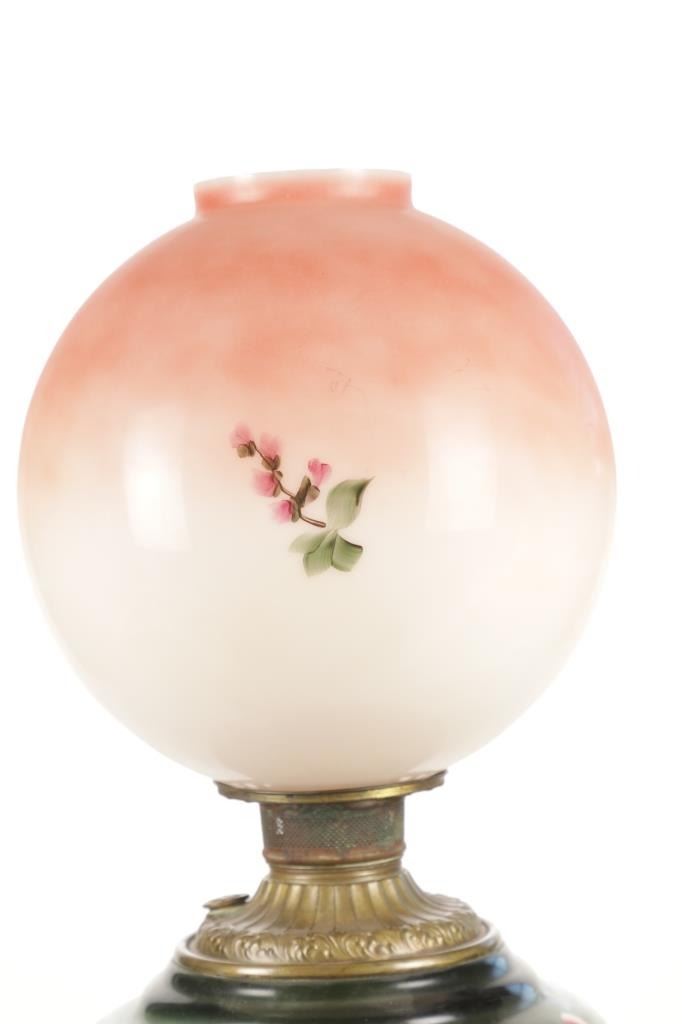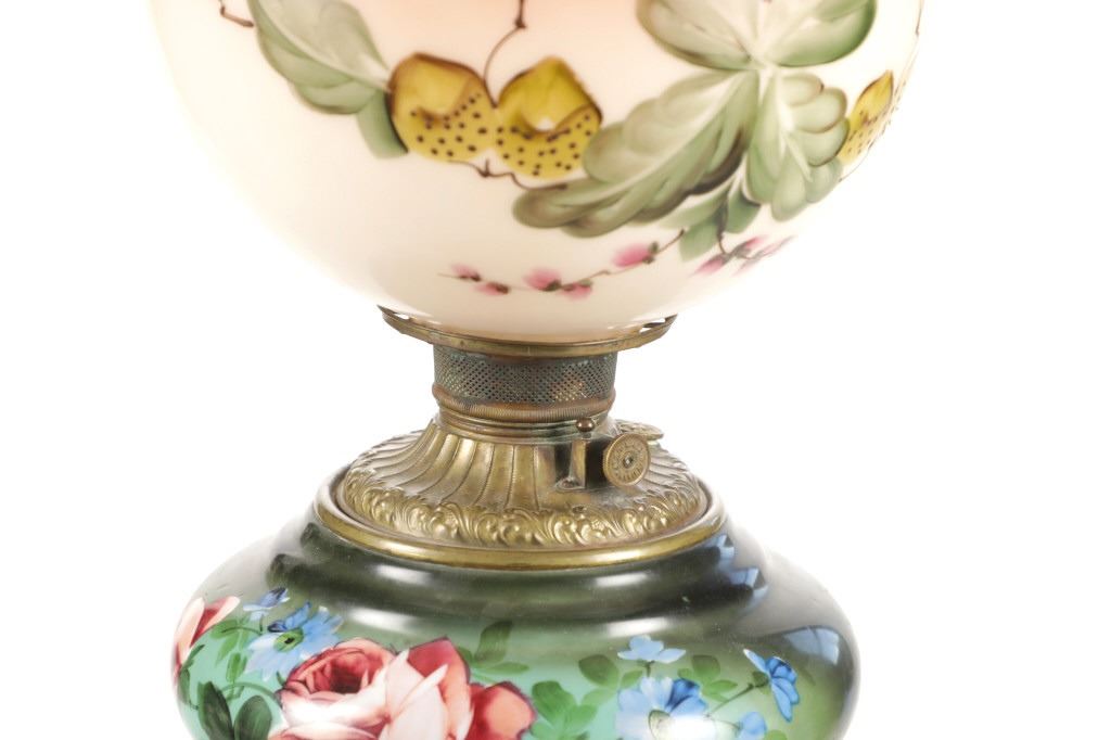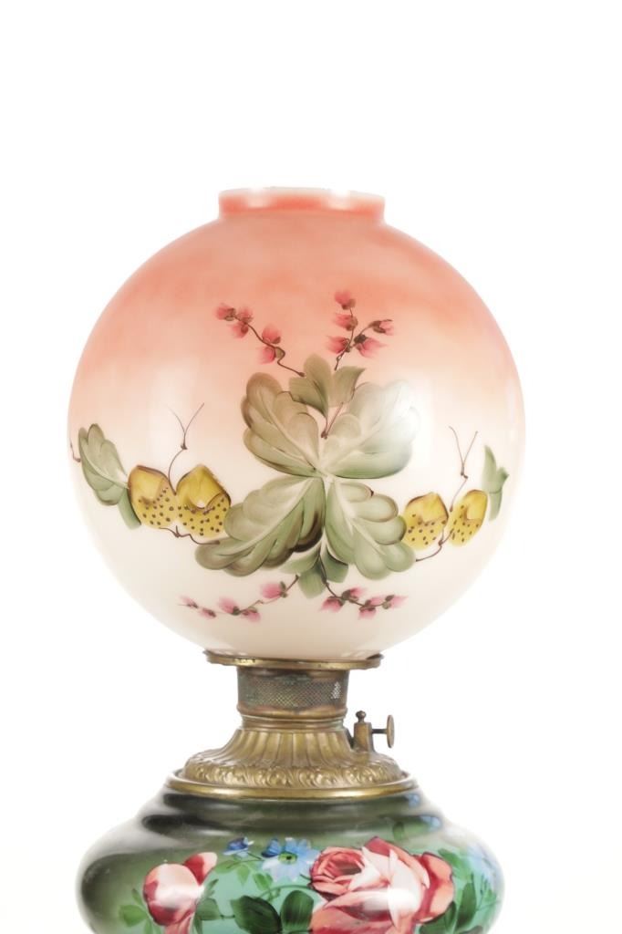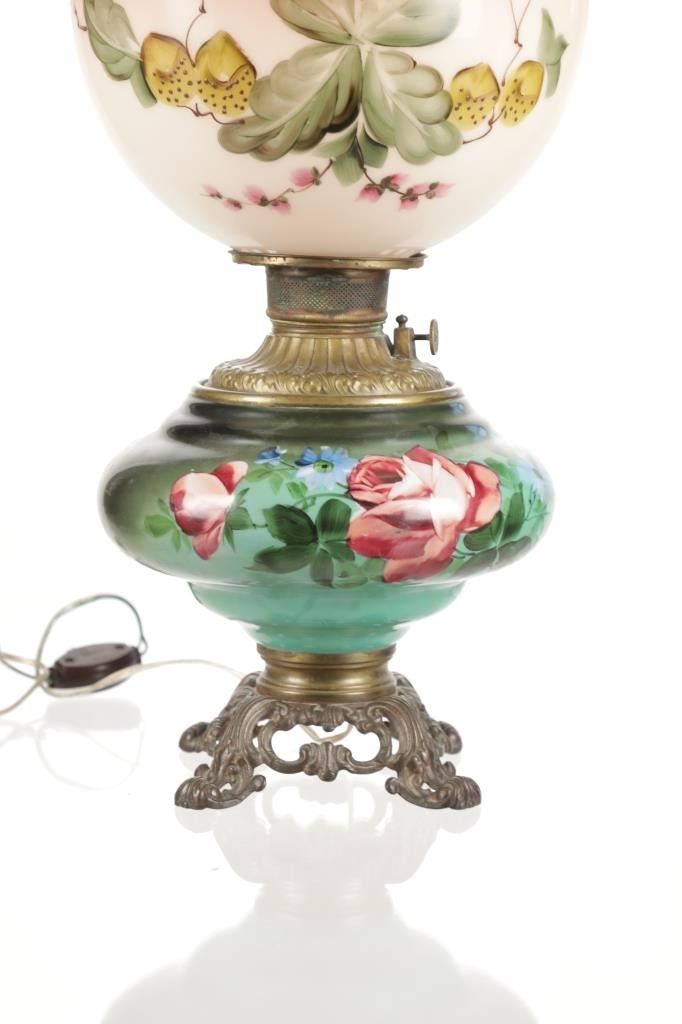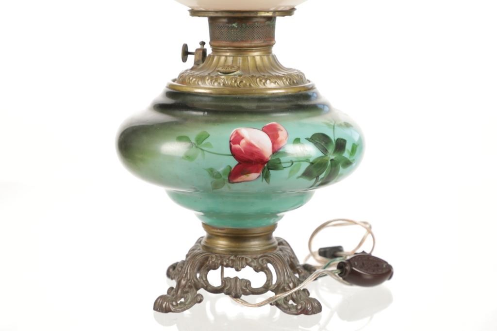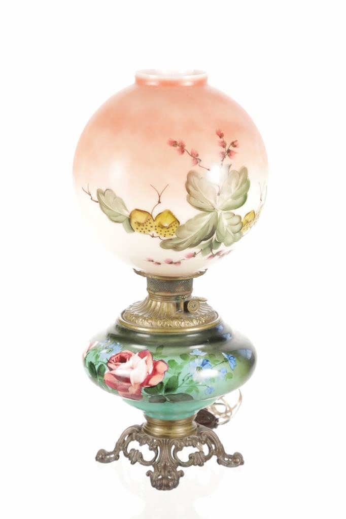 Featured in this lot is this circa 1800's floral Gone With The Wind oil lamp that has been electrified circa The Victorian Era and electrified in the early 1900's. The lamp features a wonderfully and professionally crafted glass and brass construction that shows hand painted decoration of the large upper globe with floral design and to the lower section globe shows roses and flowers to a green tinted glass. The lamp previously was set up for kerosene gas but have been refurbished to be lit up by electricity. The condition of this of this electrified hand painted lamp is good with no obvious signs of damage and shows good overall condition. The measurements of this table lamp is 24" x 9 1/2" x 9 1/2".