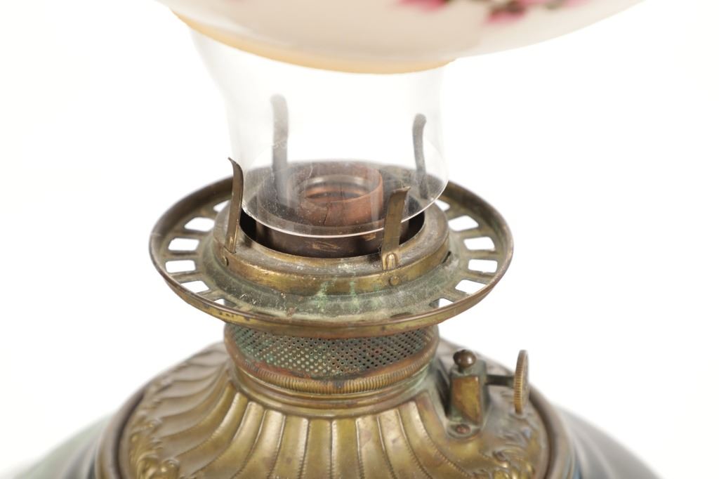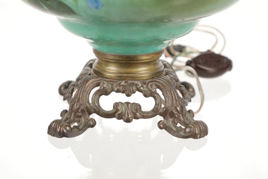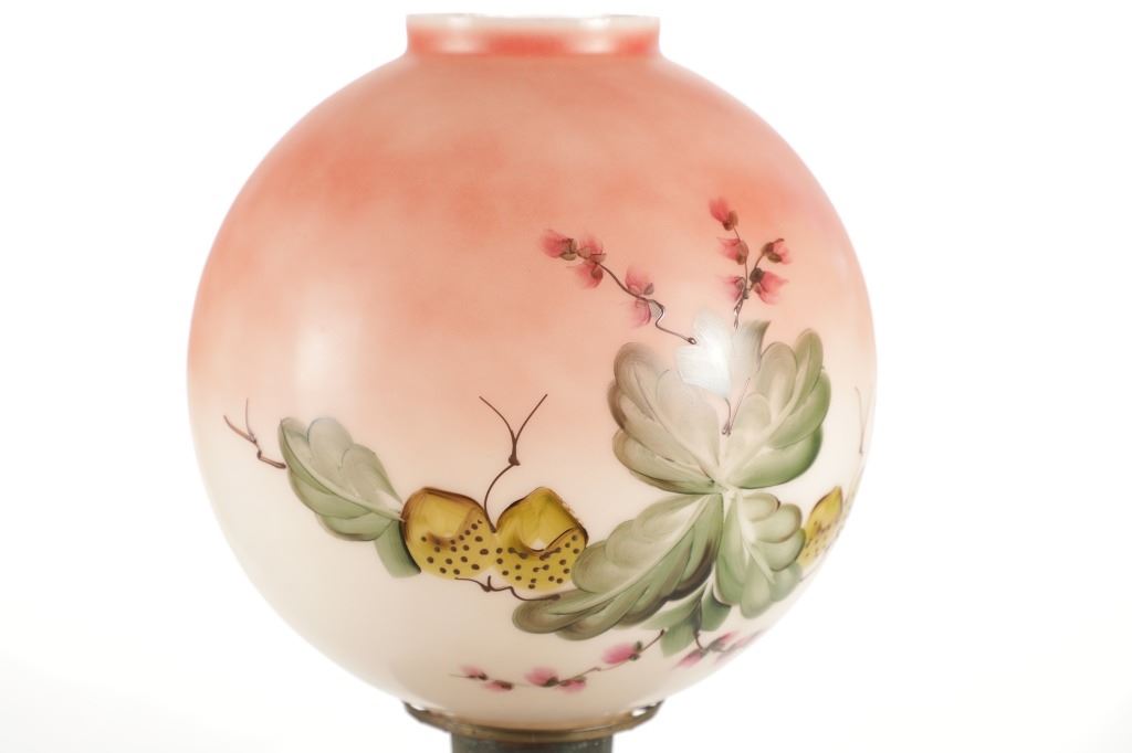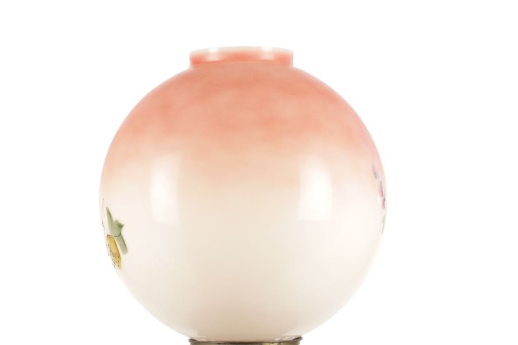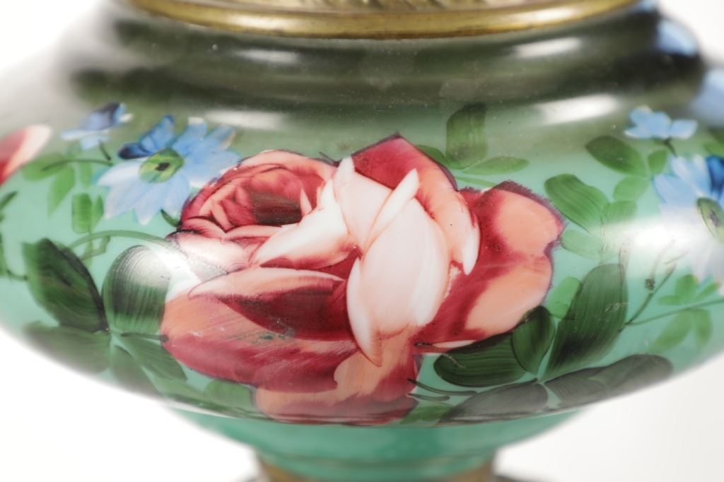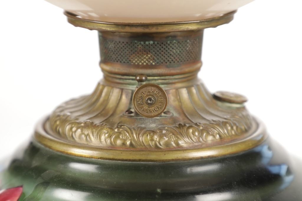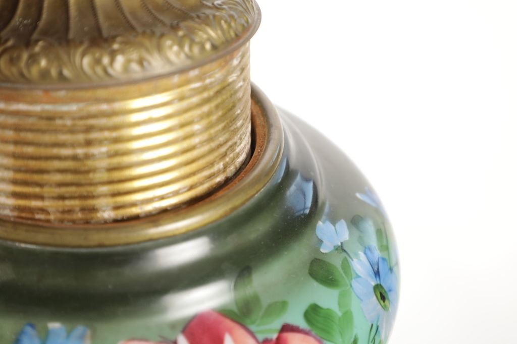 Featured in this lot is this circa 1800's floral Gone With The Wind oil lamp that has been electrified circa The Victorian Era and electrified in the early 1900's. The lamp features a wonderfully and professionally crafted glass and brass construction that shows hand painted decoration of the large upper globe with floral design and to the lower section globe shows roses and flowers to a green tinted glass. The lamp previously was set up for kerosene gas but have been refurbished to be lit up by electricity. The condition of this of this electrified hand painted lamp is good with no obvious signs of damage and shows good overall condition. The measurements of this table lamp is 24" x 9 1/2" x 9 1/2".