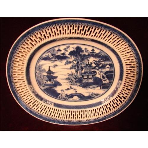 C. 1820 Chinese Export Blue and White Nanking Reticulated underplate for a fruit/chestnut basket. Nanking was made for the English Market and usually dates earlier than blue canyon which was made for the American Market. Blue Canton often referred to as balast for the ships bringing tea, etc. to the western world. Nanking was a nicer and better quality chinese export blue and white porcelain that was made for the upper class in London. This very fine reticulated underplate measures 9 3/4" X 8 1/2". In contrast to canton which has no people on the bridge, nanking usually has a person on the bridge and usually carrying a parasol,umbrella. The pagodas and the trees, etc are usually of finer quality than canton and the reticulation is usually tighter and not as crude as blue canton. This piece is in Excellen Condition with No Chips or Restoration. Very Nice Blue Color.