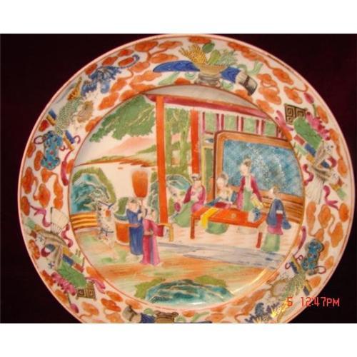 C.1820 Chinese Export Eose Mandarin Dinner Plate measurin 9 3/4" in diameter. This very unusual rose mandarin plate has a central reserve of six figures along with a horse. The border of this plate is very unusual. Excellent Condition and Very Good Quality. No chips, cracks or restoration.