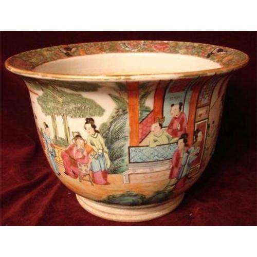 Circa 1820 Chinese Export Rose Mandarin Cache Pot in Excellent Condition. Wonderful Original Quality with No Restoration. Inside of the planter is a original firing crack on the bottom which happened in the making. Original piercing on the bottom which was done for drainage. By the inside of this planter,jardineer you can tell it was used many times over the years for plants, flowers and orchids. It is a shame that the original underplate did not survive. A very pleasant turning decoration which is all hand painted. Here we find the mandarin's house with pavillions of wives,terraces,gardens and far landscape. The border is a rich decor hand painted with enamels and gold, including roses,butterflies and fruits. These planters are excellent foe planting orchids amongst other flowers which can be a excellent addition to your home 12 months a year. Additional images are available upon request.