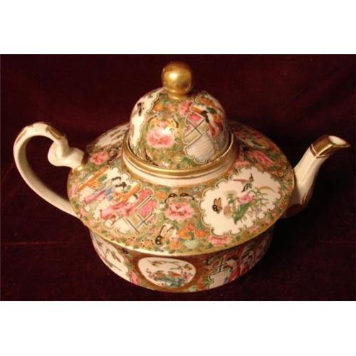Circa 1820 Chinese Export Rose Medallion Dome Lid Teapot. Nice Large Teapot that measures 11" from handle to spout and is 8" in height to top of nice gilded finial. Nice painted panels which are finely painted with the famille rose decoration on a gilded background. Melon panels of alternating scenes of ladies with gold in their hair and pink roses and butterflies and birds. Excellent Condition and Very Good Quality. Minor rubbing of gold around top where the lid fits inside and also minor rubbing on tip and spout and handle. All of this is Very Normal for this Wonderful Rose Medallion Teapot that is over 175 years old. Excellent Quality Rose Medallion Dome Lid Teapot like this one are Rare and Very Hard to find. Additional images are available upon request.