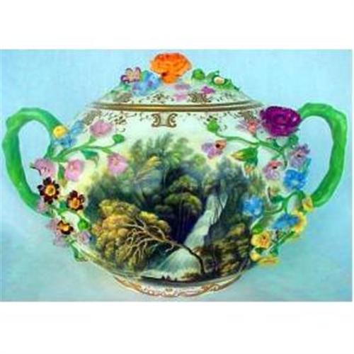 Dating to the very early days of Minton, 1820's - 30's, named landscape and magnificent floral painting on a globe bone china POT POURRI. It was probably the work of artist John Beard. Measurements: 6 1/2" high; 11" from end to end. Globe shaped. Surface is decorated with richly coloured, modelled applied flowers. These floral encrusted pieces were done in the Dresden style and Minton also copied the Meissen mark of crossed swords. However, the models are well-documented as being Minton (this is shape 19 in the pattern book). One side of the piece has a truly magnificent floral painting covering it's surface and the other shows a landscape with a rich waterfall and small people standing on a rocky outcrop below. The scene is inscribed in handwritten script below as LYDFORD CASCADE. Green twist handles extend to well over the sides of the piece, tendrils ending in a variety of modelled flowers. Marks:Underneath is the imitation Meissen / Dresden mark, known to be used by Minton at that period for these very special pieces. The bottom of the piece, below the landscape is inscribed "Lydford Cascade' in purple script. Condition: for it's age and delicacy, the piece is in very good condition. There are the expected chips to the encrusted flowers, but paint and gilding are in excellent shape.