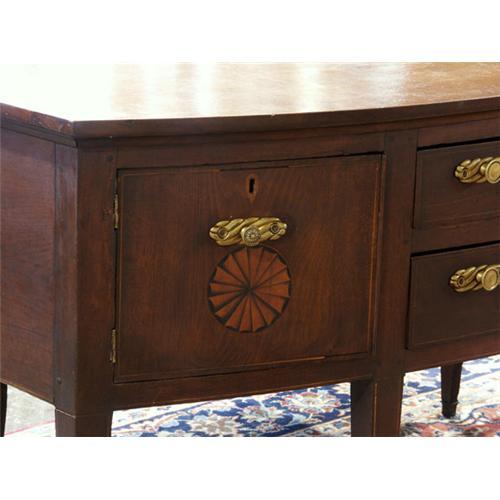 SIDEBOARD: Circa 1830 American late Federal mahogany bowfront sideboard, possibly Southern states, full fan and string inlay, tapered block legs, brasses replaced, small gouges on center drawers, various nicks and scratches throughout. 35''h x 28''d x 67''w