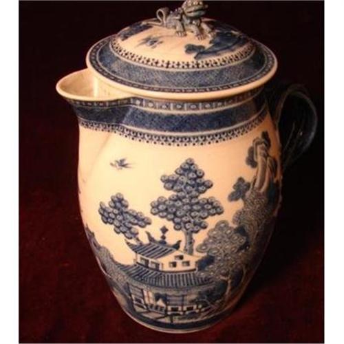 Nice Blue Color and in Excellent Condition. The cover with the applied foo dog is Original and very rare to find cider jugs in chinese export with original covers. Wonderful Double Strapped Handles with splotching on all four parts of the jug, Very well painted scene with pagodas, trees, a bird and a boat in the water bearing a flag and a oriental figure. Very Good Condition and Excellent Quality. Additional images are available upon request.
