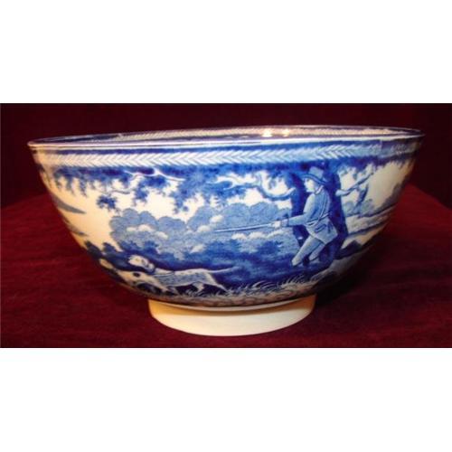 Circa 1840 Englisg Soft Paste Staffordshire Bowl measuring 6 1/4" in diameter with hunting scene consisting of a hunter with his gun and two dogs coming on a few birds in a open field with trees, woods, water and a house in the background. The bowl is 3 1/2" in height. Excellent Condition. No chips, cracks or restoration. The bottom of the bowl is marked SEMI CHINA in blue underglaze.