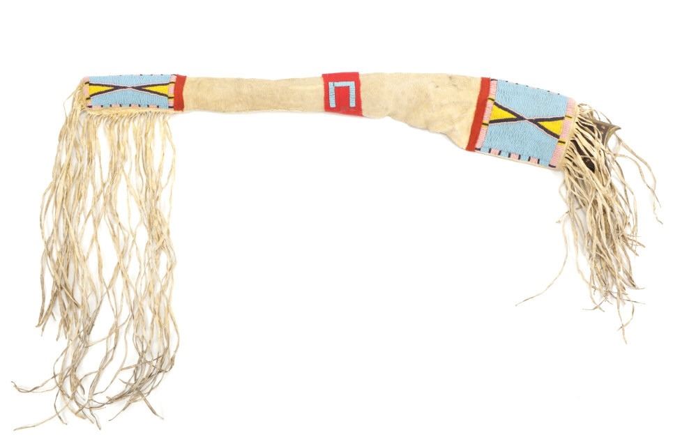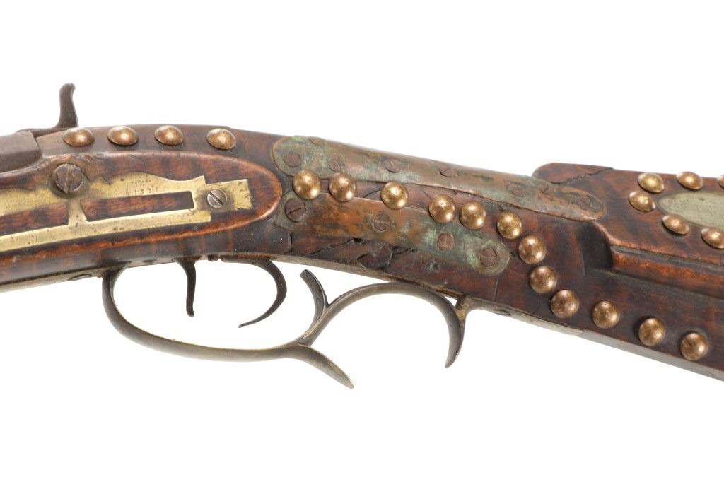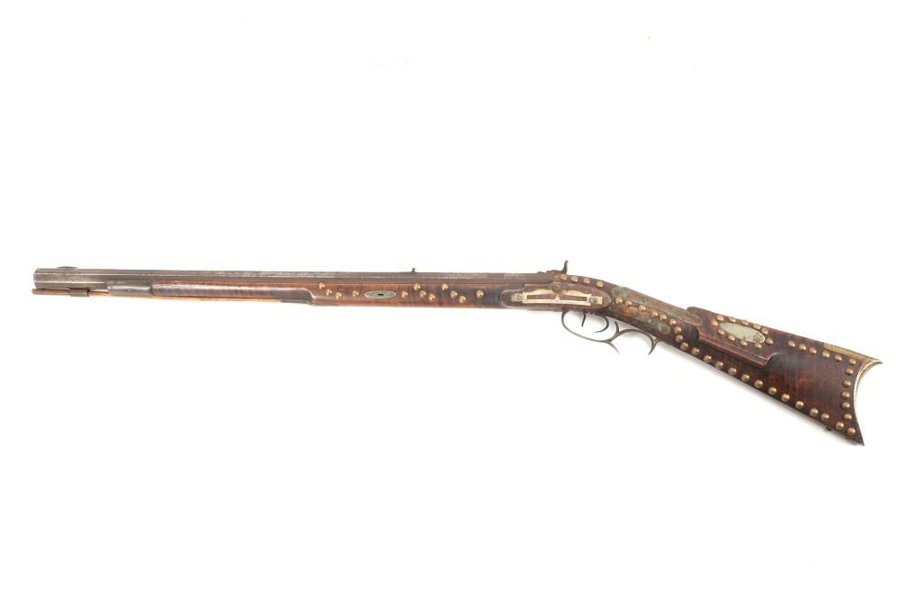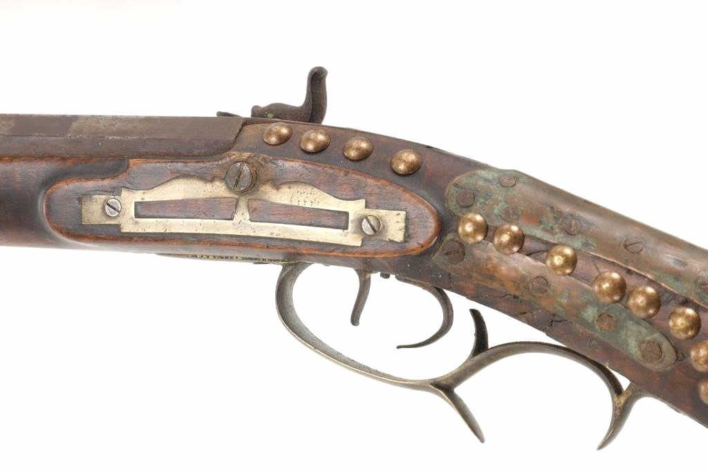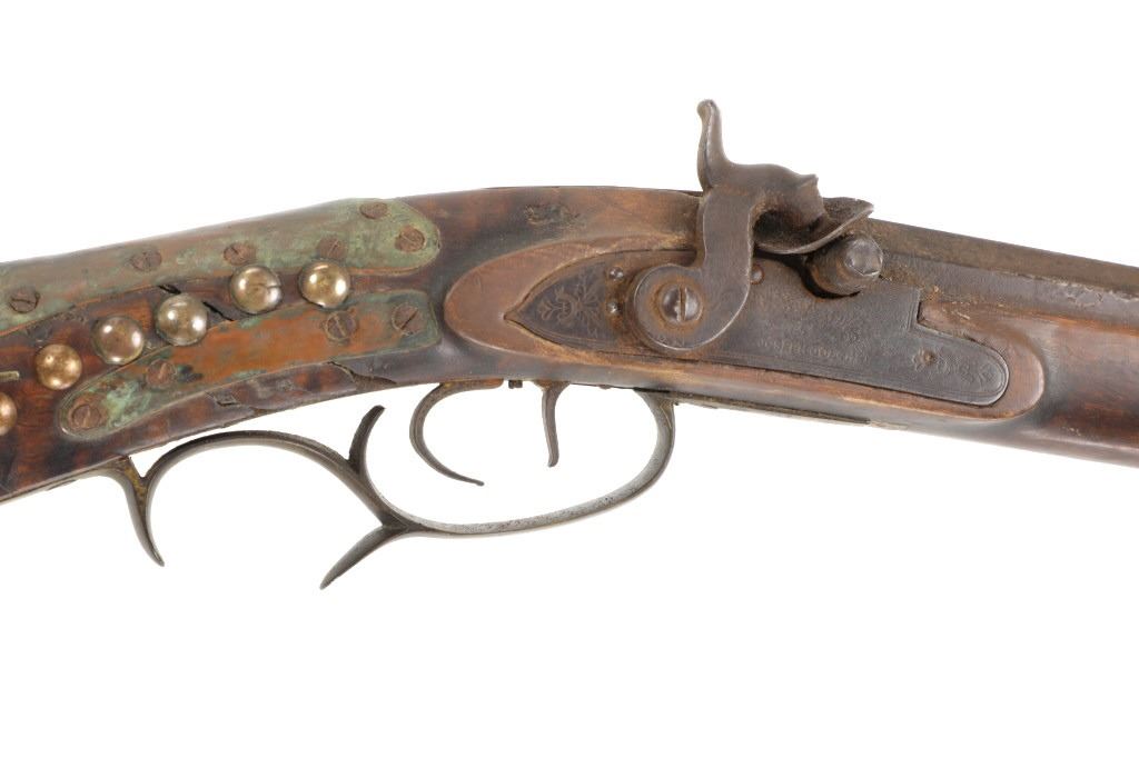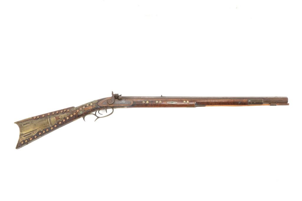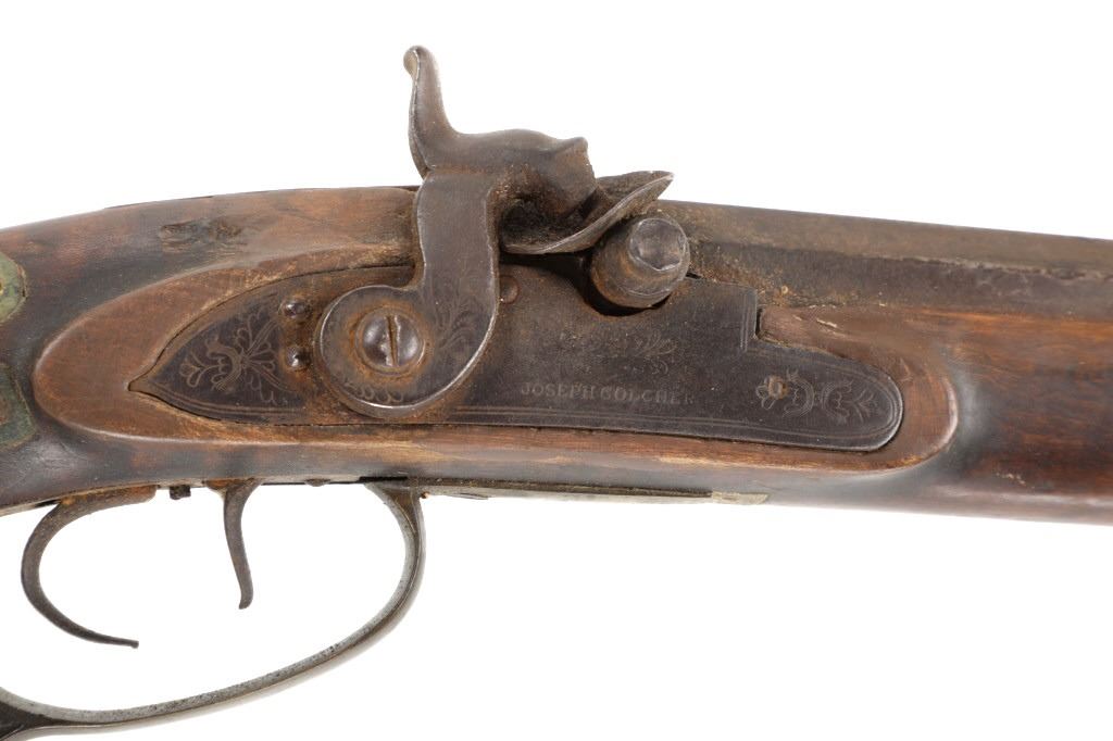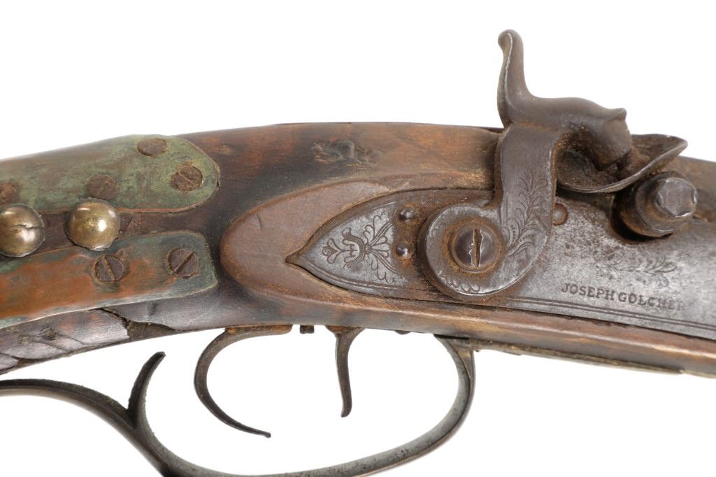 This is an exceptional lot which includes a circa 1840 Joseph Golcher Percussion Kentucky patch box long rifle chambered in .50 caliber with Indian tacking and accompanied with an original 19th Century beaded Buffalo Bison hide rifle scabbard case from the Crow Indians of Colorado. This truly fantastic pairing starts with the Joseph Golcher percussion hammer Kentucky Long Rifle with ornate patch box shows a very high-quality early example with highly figured beautiful Tiger Maple hardwood stock, engraved Joseph Golcher side receiver plate with engraved exposed side percussion hammer, brass crescent butte plate, silver (likely sterling silver) oblong oval signatory plate, highly design side bronze / brass side plate bracket, and heavy octagonal barrel. Joseph Golcher was a lockmaker gunsmith who was located in Philadelphia, PA during circa 1825-1860 with some examples being offered for $5,000+ in this high of grade. The piece is accompanied with a circa mid-to-late-1800’s Crow Rifle Scabbard which is comprised of Indian brain-tanned Buffalo Bison hide and old red stroud wool trade clothe with excellent geometric sections of 19th Century glass trade seed bead beadwork. The beadwork is in a typical Crow Buffalo Track pattern at the center and snake or hourglass triangular pattern on each on which extends to both sides, all of which are done in colors of sky padre light blue, greasy yellow, Cheyenne pink, and cobalt. The rifle scabbard has long Indian hide Buffalo fringes across the opening and bordering the bottom and front of the end and overall, the piece fits the rifle musket very well. The rifle is chambered in 50 caliber with hand cut rifling in the heavy octagon barrel. The rifle has very old 19th Century repairs at the straight pistol grip with copper lining and old screws. Included in the lot is a screenshot of a description of Trade Muskets and Rifles supplied to the Indians of the 19th Century and mentions Joseph Goulcher (Golcher). Provenance: From the ex-collection of Dale Harrison Cincinnati, Ohio. The rifle itself measures 40”L and the case is 38.5”L without the fringes.