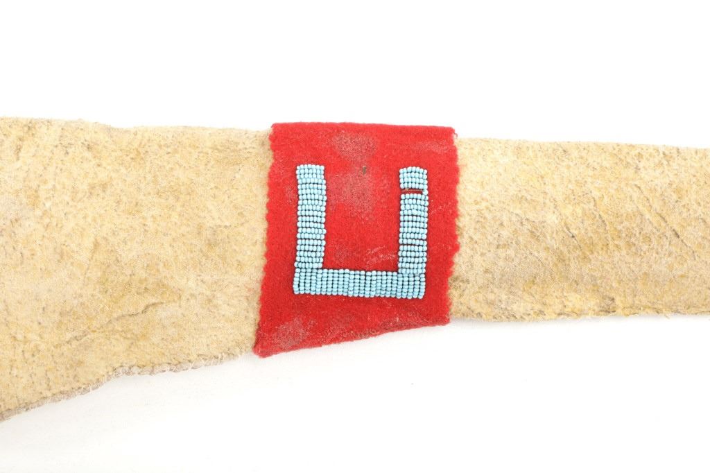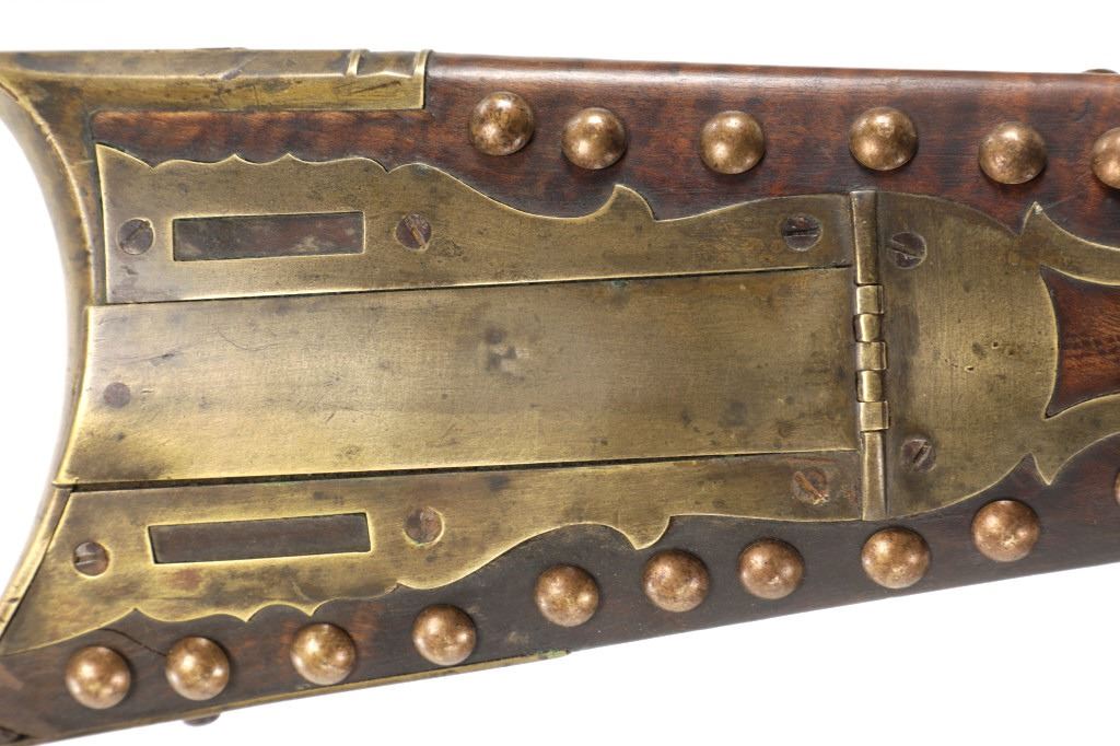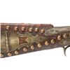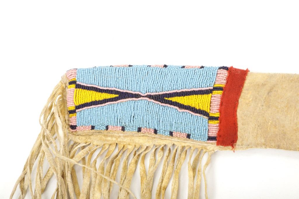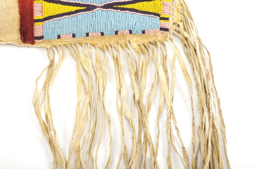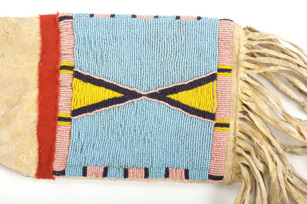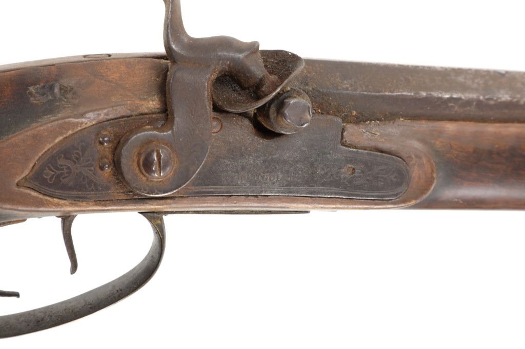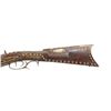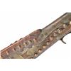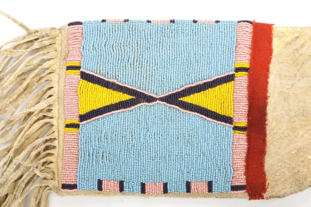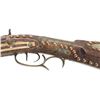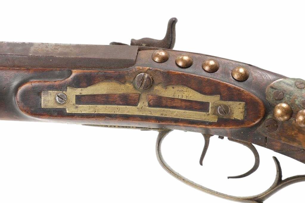 This is an exceptional lot which includes a circa 1840 Joseph Golcher Percussion Kentucky patch box long rifle chambered in .50 caliber with Indian tacking and accompanied with an original 19th Century beaded Buffalo Bison hide rifle scabbard case from the Crow Indians of Colorado. This truly fantastic pairing starts with the Joseph Golcher percussion hammer Kentucky Long Rifle with ornate patch box shows a very high-quality early example with highly figured beautiful Tiger Maple hardwood stock, engraved Joseph Golcher side receiver plate with engraved exposed side percussion hammer, brass crescent butte plate, silver (likely sterling silver) oblong oval signatory plate, highly design side bronze / brass side plate bracket, and heavy octagonal barrel. Joseph Golcher was a lockmaker gunsmith who was located in Philadelphia, PA during circa 1825-1860 with some examples being offered for $5,000+ in this high of grade. The piece is accompanied with a circa mid-to-late-1800’s Crow Rifle Scabbard which is comprised of Indian brain-tanned Buffalo Bison hide and old red stroud wool trade clothe with excellent geometric sections of 19th Century glass trade seed bead beadwork. The beadwork is in a typical Crow Buffalo Track pattern at the center and snake or hourglass triangular pattern on each on which extends to both sides, all of which are done in colors of sky padre light blue, greasy yellow, Cheyenne pink, and cobalt. The rifle scabbard has long Indian hide Buffalo fringes across the opening and bordering the bottom and front of the end and overall, the piece fits the rifle musket very well. The rifle is chambered in 50 caliber with hand cut rifling in the heavy octagon barrel. The rifle has very old 19th Century repairs at the straight pistol grip with copper lining and old screws. Included in the lot is a screenshot of a description of Trade Muskets and Rifles supplied to the Indians of the 19th Century and mentions Joseph Goulcher (Golcher). Provenance: From the ex-collection of Dale Harrison Cincinnati, Ohio. The rifle itself measures 40”L and the case is 38.5”L without the fringes.