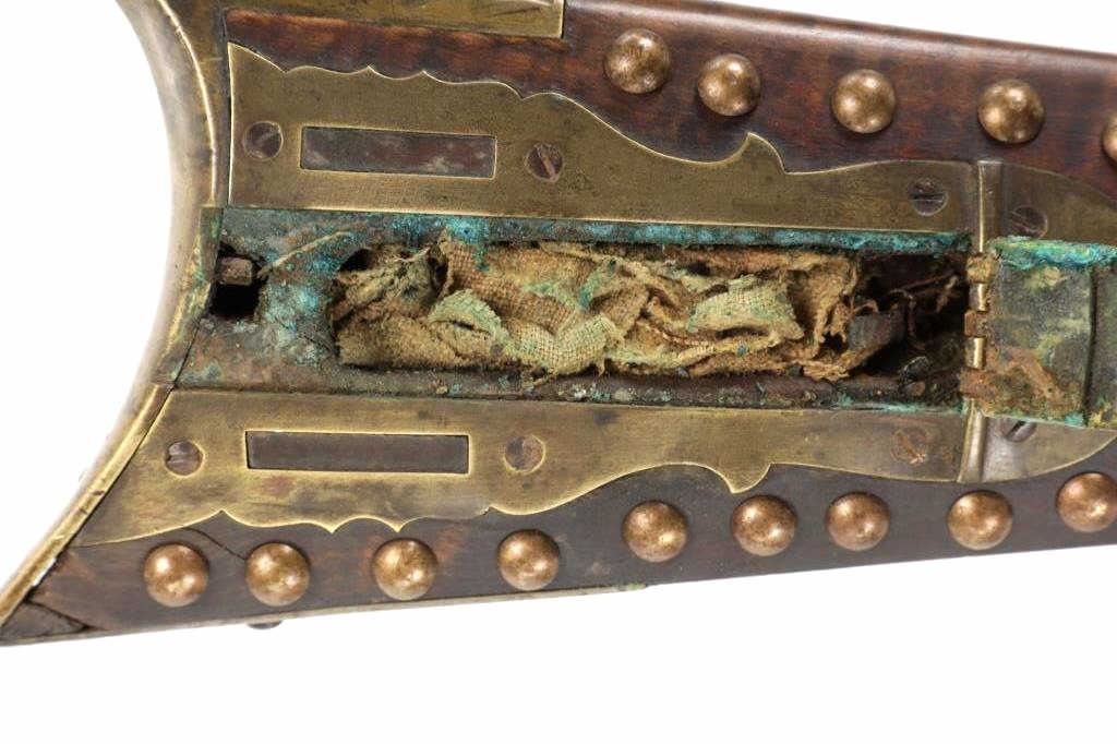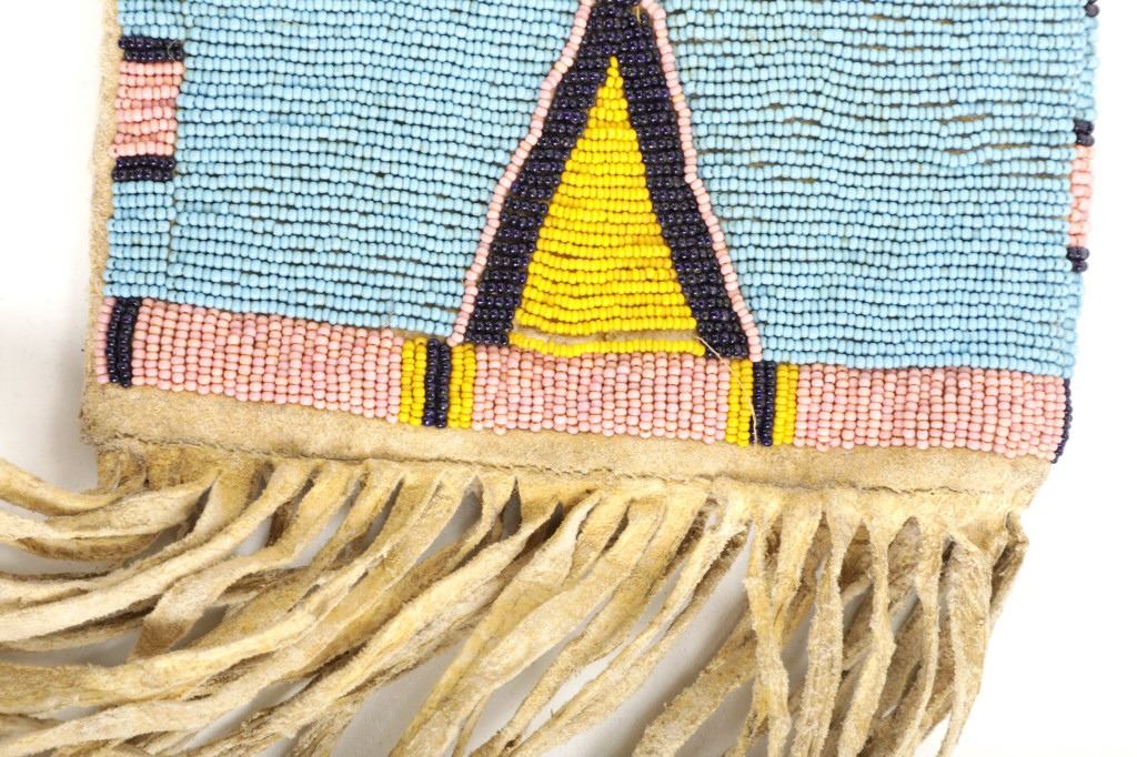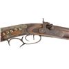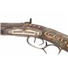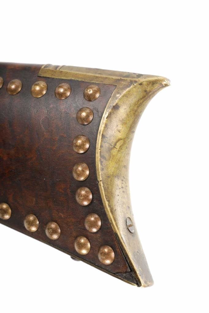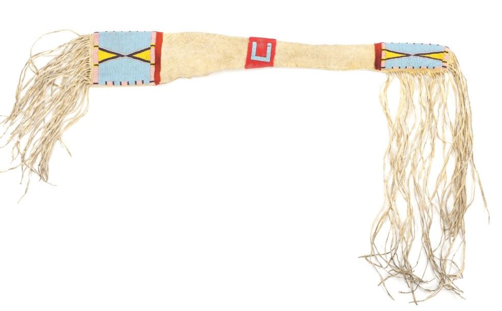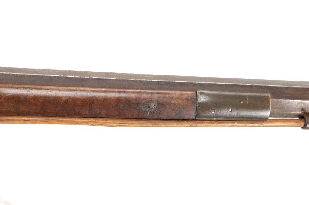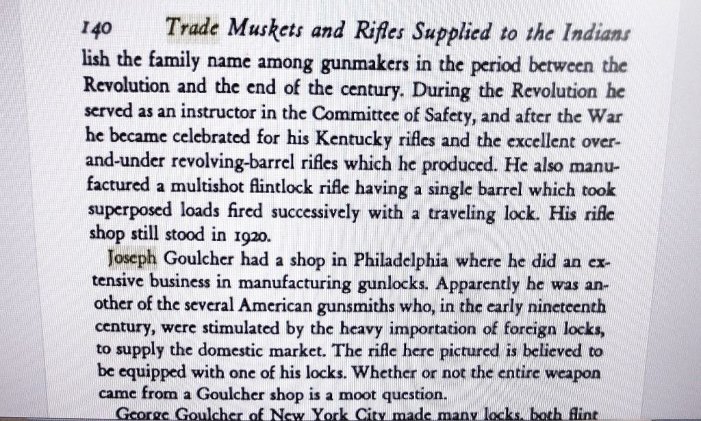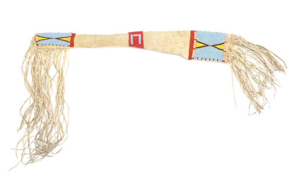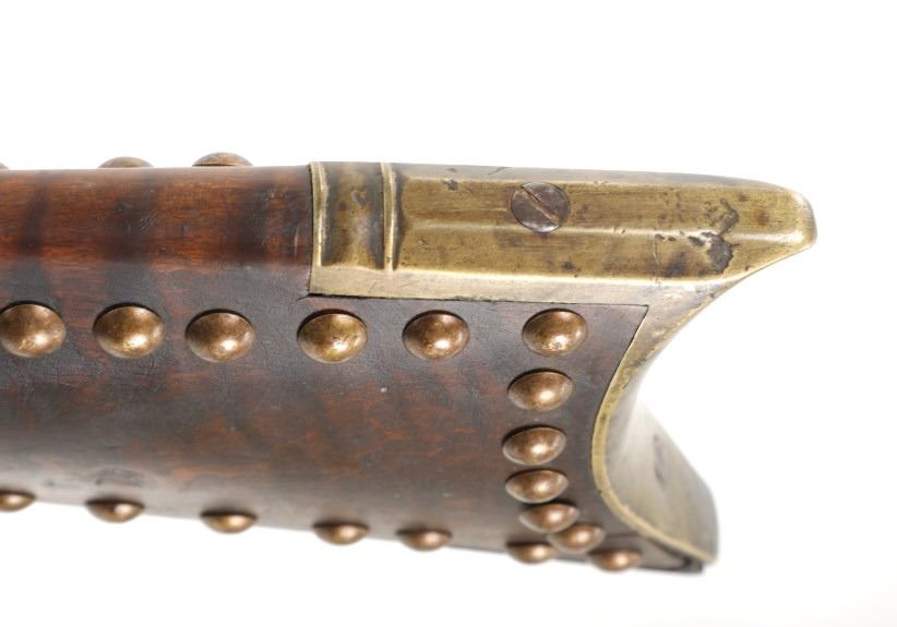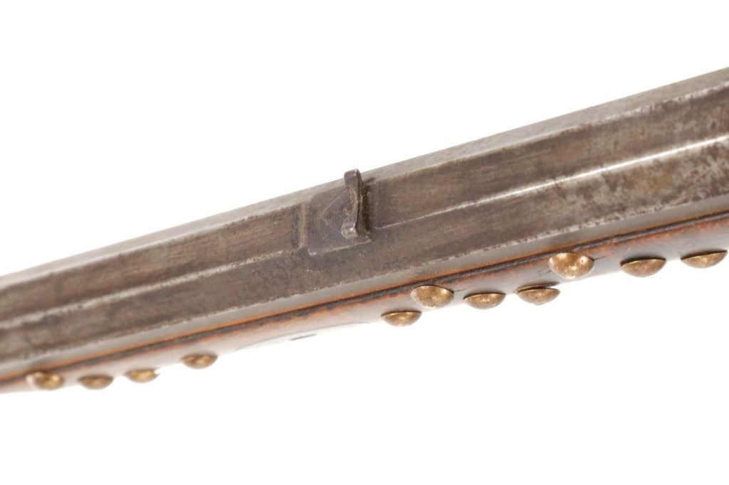 This is an exceptional lot which includes a circa 1840 Joseph Golcher Percussion Kentucky patch box long rifle chambered in .50 caliber with Indian tacking and accompanied with an original 19th Century beaded Buffalo Bison hide rifle scabbard case from the Crow Indians of Colorado. This truly fantastic pairing starts with the Joseph Golcher percussion hammer Kentucky Long Rifle with ornate patch box shows a very high-quality early example with highly figured beautiful Tiger Maple hardwood stock, engraved Joseph Golcher side receiver plate with engraved exposed side percussion hammer, brass crescent butte plate, silver (likely sterling silver) oblong oval signatory plate, highly design side bronze / brass side plate bracket, and heavy octagonal barrel. Joseph Golcher was a lockmaker gunsmith who was located in Philadelphia, PA during circa 1825-1860 with some examples being offered for $5,000+ in this high of grade. The piece is accompanied with a circa mid-to-late-1800’s Crow Rifle Scabbard which is comprised of Indian brain-tanned Buffalo Bison hide and old red stroud wool trade clothe with excellent geometric sections of 19th Century glass trade seed bead beadwork. The beadwork is in a typical Crow Buffalo Track pattern at the center and snake or hourglass triangular pattern on each on which extends to both sides, all of which are done in colors of sky padre light blue, greasy yellow, Cheyenne pink, and cobalt. The rifle scabbard has long Indian hide Buffalo fringes across the opening and bordering the bottom and front of the end and overall, the piece fits the rifle musket very well. The rifle is chambered in 50 caliber with hand cut rifling in the heavy octagon barrel. The rifle has very old 19th Century repairs at the straight pistol grip with copper lining and old screws. Included in the lot is a screenshot of a description of Trade Muskets and Rifles supplied to the Indians of the 19th Century and mentions Joseph Goulcher (Golcher). Provenance: From the ex-collection of Dale Harrison Cincinnati, Ohio. The rifle itself measures 40”L and the case is 38.5”L without the fringes.