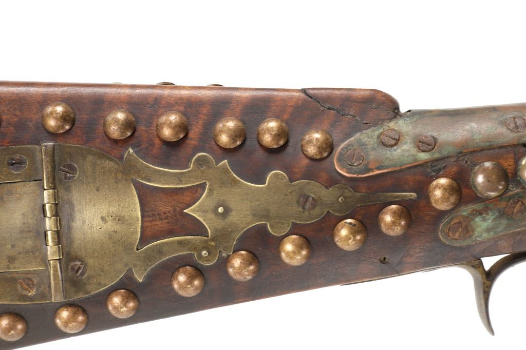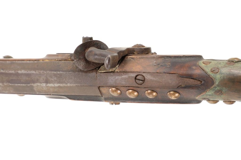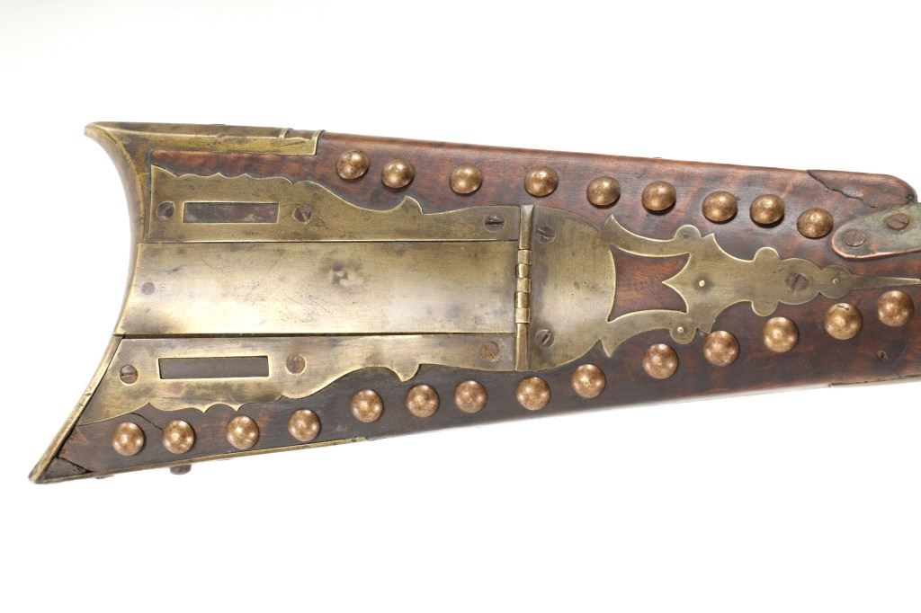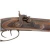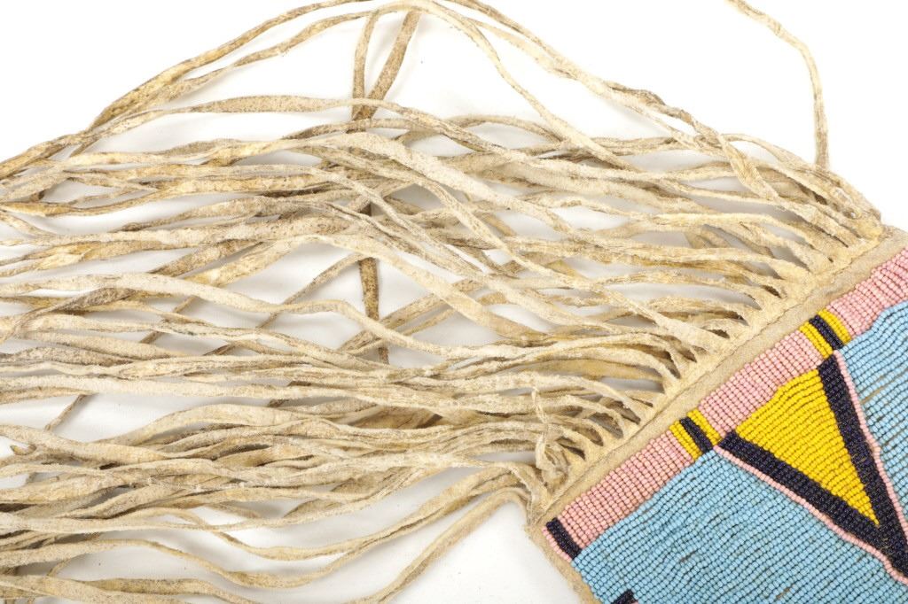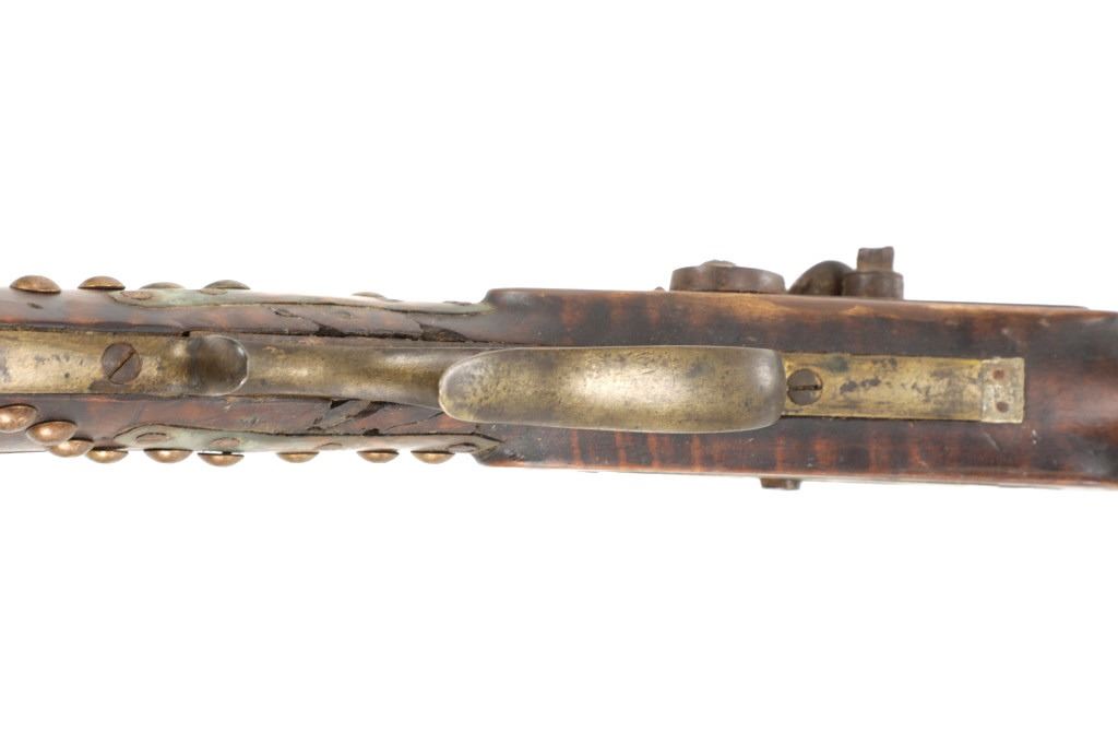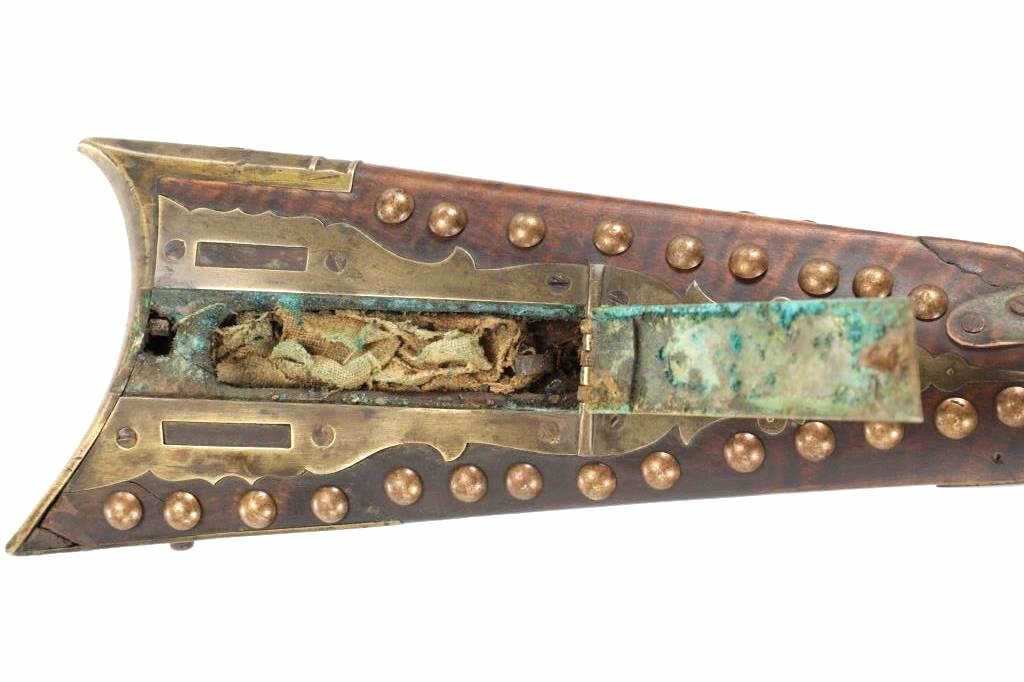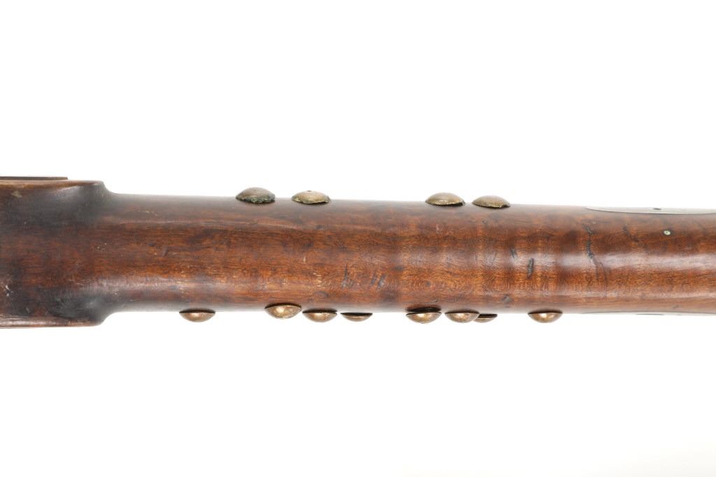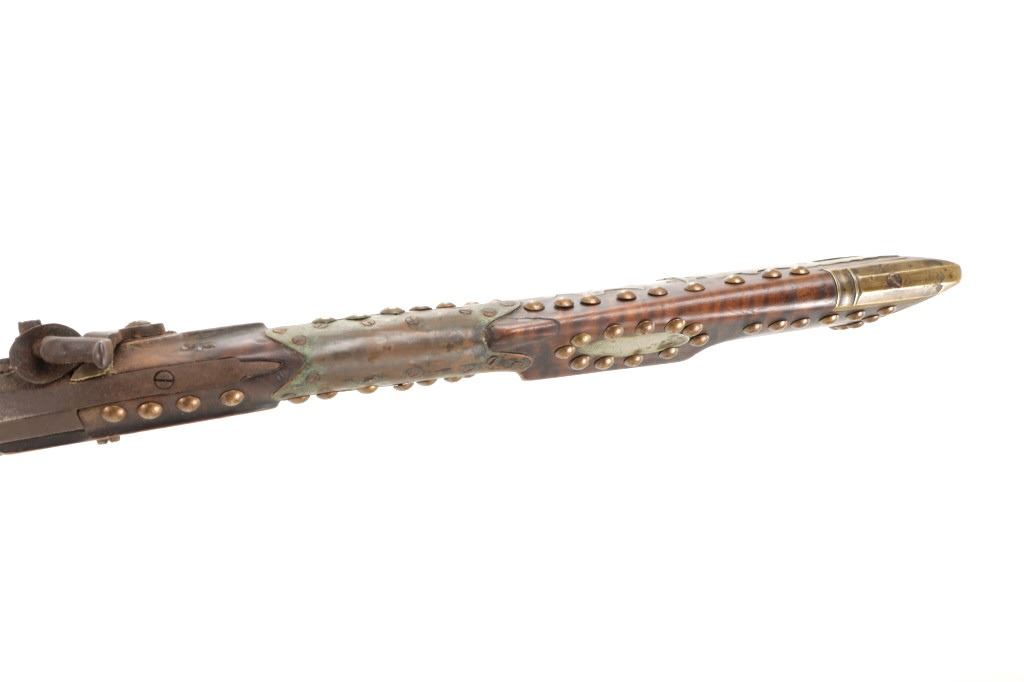 This is an exceptional lot which includes a circa 1840 Joseph Golcher Percussion Kentucky patch box long rifle chambered in .50 caliber with Indian tacking and accompanied with an original 19th Century beaded Buffalo Bison hide rifle scabbard case from the Crow Indians of Colorado. This truly fantastic pairing starts with the Joseph Golcher percussion hammer Kentucky Long Rifle with ornate patch box shows a very high-quality early example with highly figured beautiful Tiger Maple hardwood stock, engraved Joseph Golcher side receiver plate with engraved exposed side percussion hammer, brass crescent butte plate, silver (likely sterling silver) oblong oval signatory plate, highly design side bronze / brass side plate bracket, and heavy octagonal barrel. Joseph Golcher was a lockmaker gunsmith who was located in Philadelphia, PA during circa 1825-1860 with some examples being offered for $5,000+ in this high of grade. The piece is accompanied with a circa mid-to-late-1800’s Crow Rifle Scabbard which is comprised of Indian brain-tanned Buffalo Bison hide and old red stroud wool trade clothe with excellent geometric sections of 19th Century glass trade seed bead beadwork. The beadwork is in a typical Crow Buffalo Track pattern at the center and snake or hourglass triangular pattern on each on which extends to both sides, all of which are done in colors of sky padre light blue, greasy yellow, Cheyenne pink, and cobalt. The rifle scabbard has long Indian hide Buffalo fringes across the opening and bordering the bottom and front of the end and overall, the piece fits the rifle musket very well. The rifle is chambered in 50 caliber with hand cut rifling in the heavy octagon barrel. The rifle has very old 19th Century repairs at the straight pistol grip with copper lining and old screws. Included in the lot is a screenshot of a description of Trade Muskets and Rifles supplied to the Indians of the 19th Century and mentions Joseph Goulcher (Golcher). Provenance: From the ex-collection of Dale Harrison Cincinnati, Ohio. The rifle itself measures 40”L and the case is 38.5”L without the fringes.