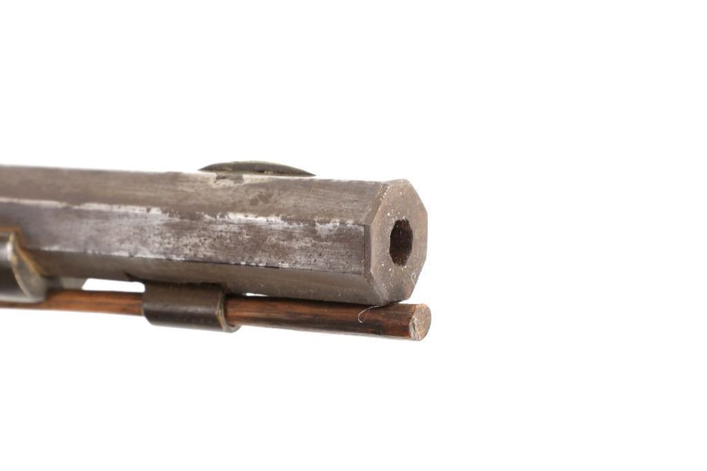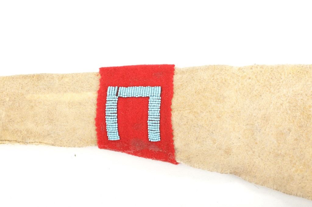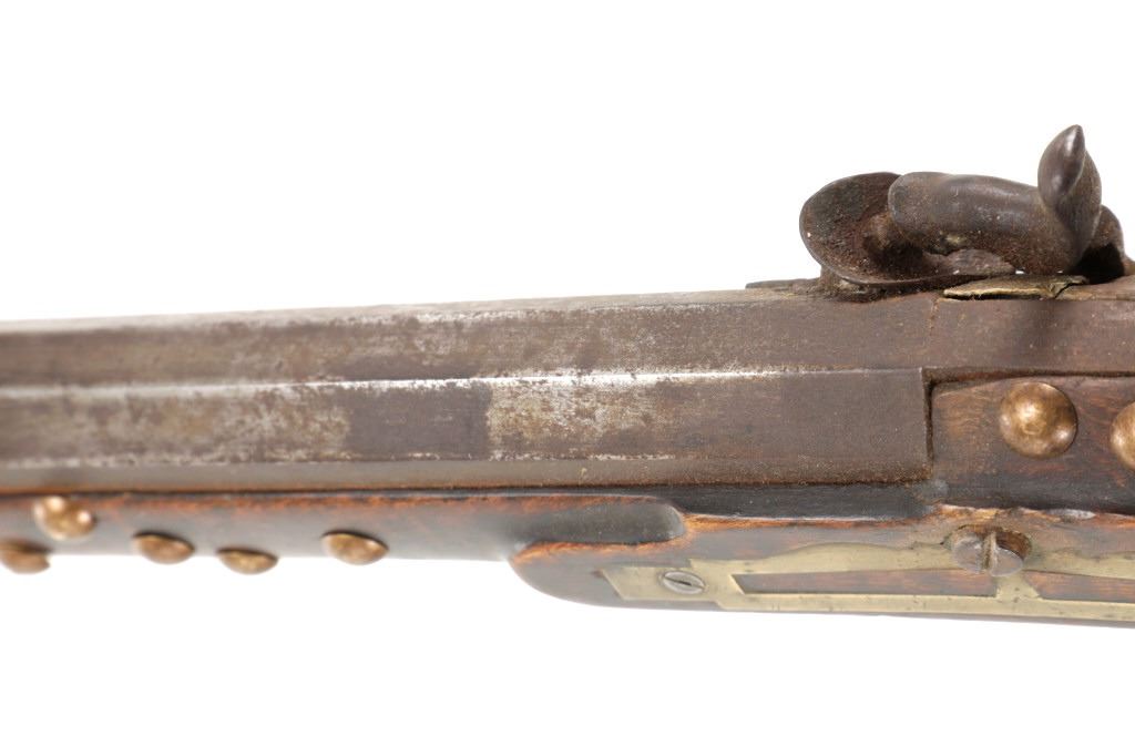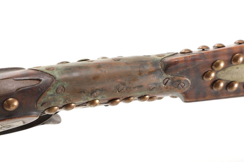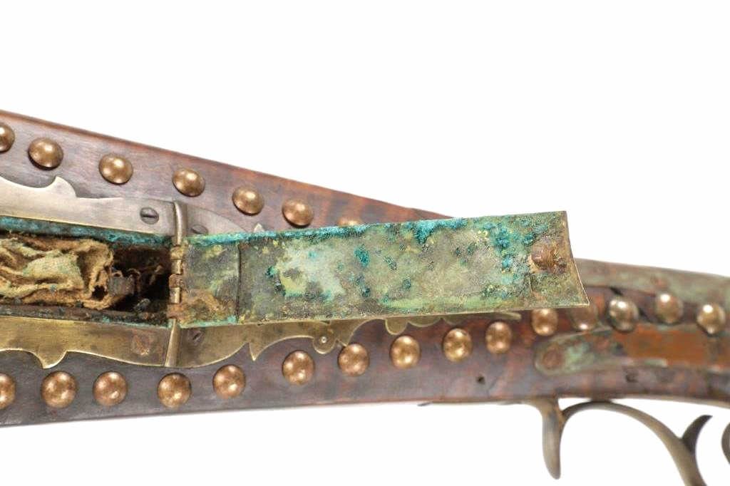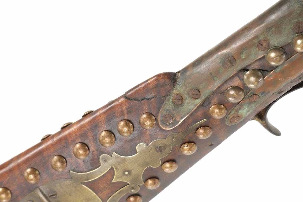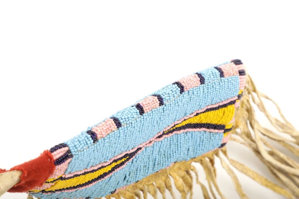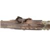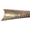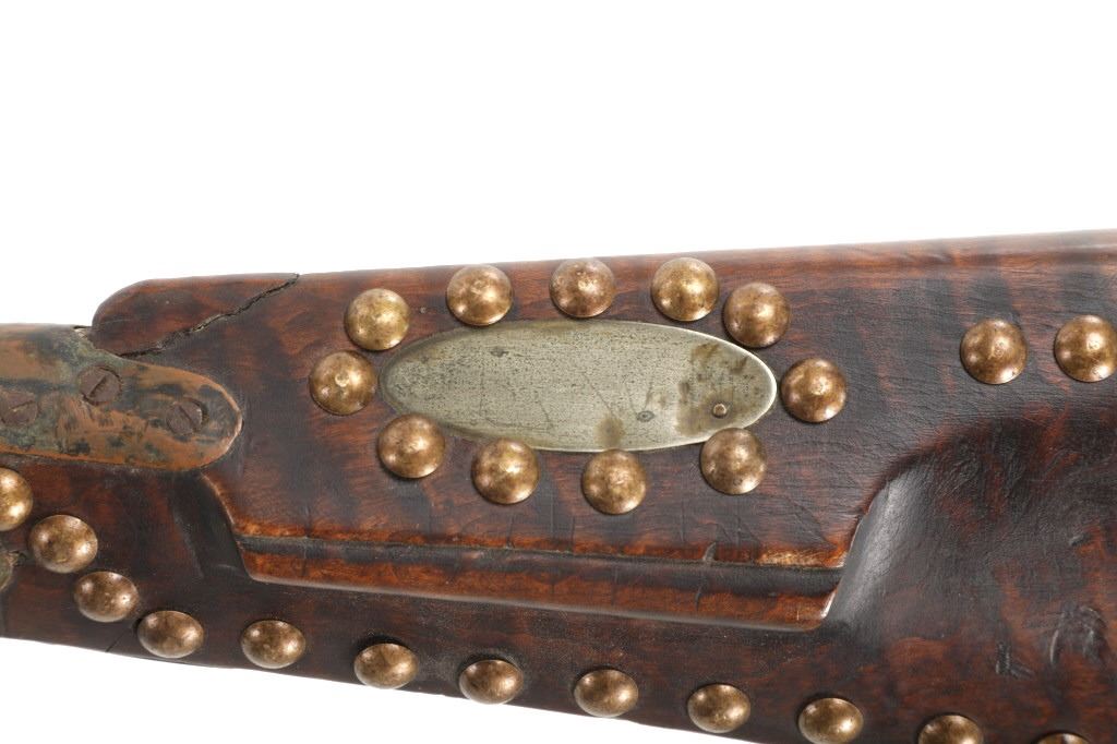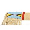 This is an exceptional lot which includes a circa 1840 Joseph Golcher Percussion Kentucky patch box long rifle chambered in .50 caliber with Indian tacking and accompanied with an original 19th Century beaded Buffalo Bison hide rifle scabbard case from the Crow Indians of Colorado. This truly fantastic pairing starts with the Joseph Golcher percussion hammer Kentucky Long Rifle with ornate patch box shows a very high-quality early example with highly figured beautiful Tiger Maple hardwood stock, engraved Joseph Golcher side receiver plate with engraved exposed side percussion hammer, brass crescent butte plate, silver (likely sterling silver) oblong oval signatory plate, highly design side bronze / brass side plate bracket, and heavy octagonal barrel. Joseph Golcher was a lockmaker gunsmith who was located in Philadelphia, PA during circa 1825-1860 with some examples being offered for $5,000+ in this high of grade. The piece is accompanied with a circa mid-to-late-1800’s Crow Rifle Scabbard which is comprised of Indian brain-tanned Buffalo Bison hide and old red stroud wool trade clothe with excellent geometric sections of 19th Century glass trade seed bead beadwork. The beadwork is in a typical Crow Buffalo Track pattern at the center and snake or hourglass triangular pattern on each on which extends to both sides, all of which are done in colors of sky padre light blue, greasy yellow, Cheyenne pink, and cobalt. The rifle scabbard has long Indian hide Buffalo fringes across the opening and bordering the bottom and front of the end and overall, the piece fits the rifle musket very well. The rifle is chambered in 50 caliber with hand cut rifling in the heavy octagon barrel. The rifle has very old 19th Century repairs at the straight pistol grip with copper lining and old screws. Included in the lot is a screenshot of a description of Trade Muskets and Rifles supplied to the Indians of the 19th Century and mentions Joseph Goulcher (Golcher). Provenance: From the ex-collection of Dale Harrison Cincinnati, Ohio. The rifle itself measures 40”L and the case is 38.5”L without the fringes.