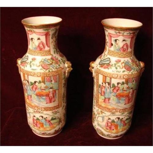 Circa 1820-1840 Pair of Chinese Export Rose Mandarin Vases measuring 12" in height. Excellent Condition and Wonderful Great Rose Mandarin Quality. This pair of Vases would make a wonderful pair of lamps. No Damage or Restoration. Nice Greek Key Border with wonderful gold handles on the sides of both vases.