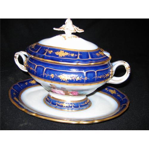 This covered sauce tureen is double handled with attached stand. This piece has gilt decoration with a handpainted landscape. S-37 mark on bottom and an additional red circle tuileries stamp