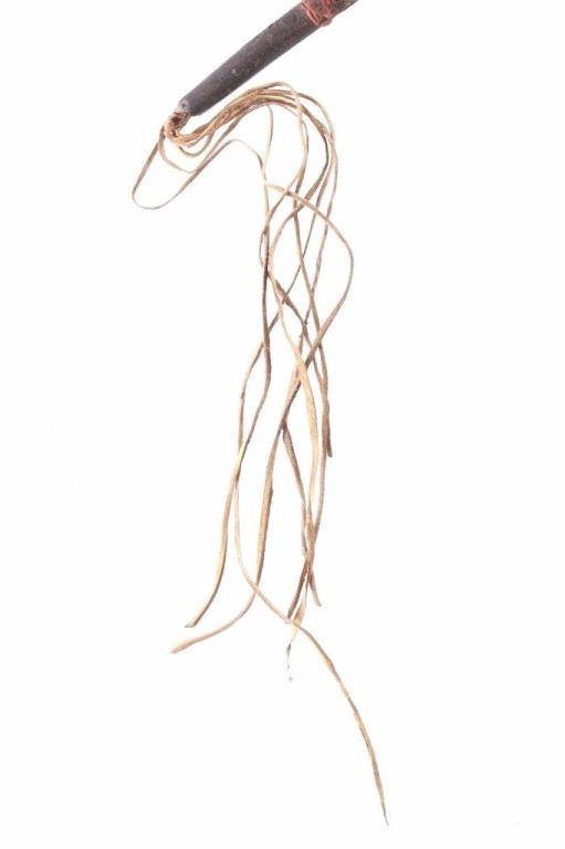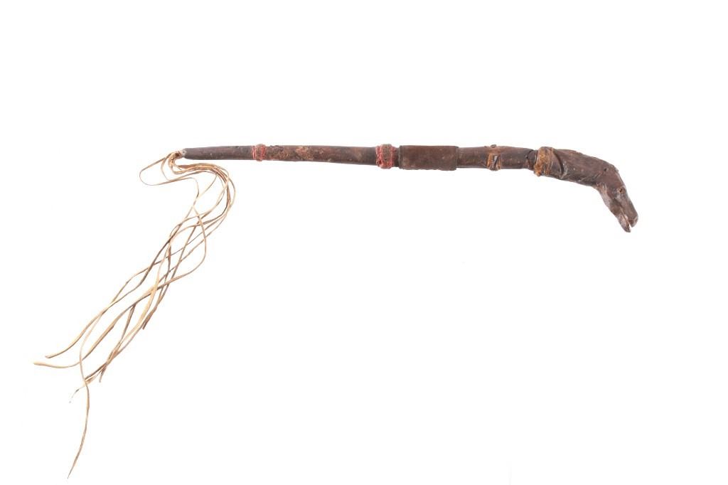 This is an unusual piece showing a parfleche rawhide horse head figural riding quirt from the Comanche Indians of Texas dating to the mid-to-late 19th Century. The piece exhibits a slightly flexible, presumably harness leather, core which is comletely covered in parfleche rawhide showing three wider rings of hide accepnted by red and yellow mineral pigment painted bands and incised designs. The top of the quirt is comprised of a highly unusual and rare horse head shaped section of parfleche rawhide with polychrome painted features in mineral pigment colors of black and yellow, striped down the nose and sides of the mouth of the horse as well as along the horses mane and at the quirt connection several bands of yellow and black. The hide is hardened and has some cracking in places but overall stable. The bottom of the piece shows later added or repaired hide fringes and at the center a later added hide wrapping. Figural quirts or riding crops from the Southern Plains tribes, especially from Texas, are very rare with this being a truly unique representation. For other examples of figural quirts see the Southern Plains Carved Wood piece dating to the 19th Century from the James B. Scoville collection showing a water monster sold by Cowan's in 2019 for $4,500 (shown with bp). Provenance: The piece is from a large Cowboy and Native American collection outside of Billings, Montana. Measures overall 16"L with an additional 15"L fringe at the end.