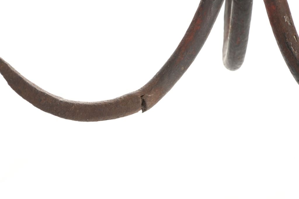 This lot is a circa late 1800's Hand Forged, cast Iron Treble-Hook (Grappling Hook). It was crafted by a Blacksmith, likely in the mid to late 1800's. These hooks were often used to retrieve buckets that had fallen into a well, climb or pull down walls, in Naval use they would be tossed onto the enemy ship to be pulled in closer for boarding, in fishing for large fish and some were used as meat hooks The blacksmith used 2 bars of metal. One bar made the loop and two of the tines, the second bar is attached to make the third tine. This was made by a very talented blacksmith. At one time in its use this treble-hook had been painted with red paint. This treble-hook measures 11 1/2” x 11” and shows some damage to one of the tines.