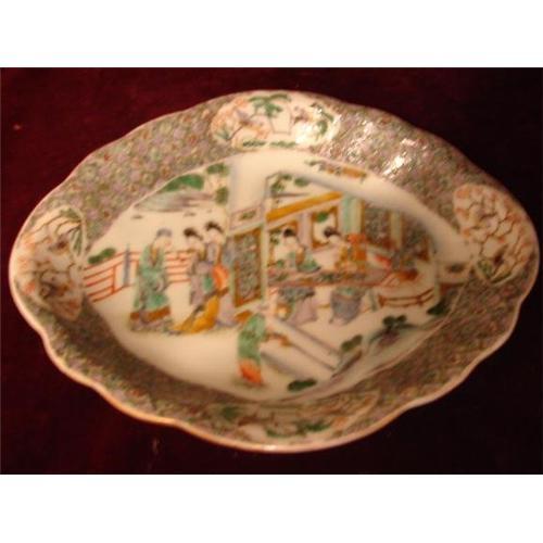 Circa 1840-1850 Chinese Expory Famille Rose Verte Rose Mandarin Scene in a nice diamond shaped open serving dish. This dish measures 10 1/2" X 8 3/4". This is a unusual pattern that we have not seen that often. Definetely a version og the rose mandarin and rose medallion and rose canton patterns. Excellent Condition with no chips, cracks or Restoration. Slight wear on the left and right side at 9:00 and 3:00, which would be common at a place that this piece would have been handled. On the back of the piece is a production firing mark, that we have shown in one of the images. Additional images are available upon request.