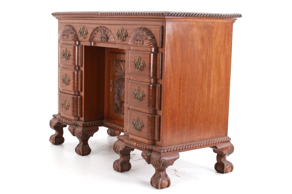 Featured in this lot is a stunning, ornately carved, circa 1850-1890 Chippendale pattern, carved rosewood kneehole desk, in the manner of John Townsend, Rhode Island. This particular style of desk first appeared in England in the early 18th century. The kneehole desk is defined by its ‘kneehole’ in the center allowing the desk’s user to comfortably sit with his or her legs underneath the writing surface. At the same time, the kneehole desk retains drawers on either side to maximize storage. Kneehole desks also often featured central cupboards behind the kneehole space for additional storage. This kneehole desk features a writing space on the very top of the desk with a long drawer that extends the entire width of the desk below the writing area. The long drawer is ornately carved with designs and features bail handles set on batwing brass components and a keyhole in the center of the drawer. On either side are three smaller drawers also showing bail handles and batwing brass components. The center kneehole space shows a small cabinet for more storage with a finely carved cabinet door and keyhole on the left side. The top and bottom of the kneehole desk shows a finely carved gadrooning, a carved ornamental edging consisting of a series of convex sections resembling curved, oval fluting or reeding. The bottom of the desk shows six greatly carved claw-and-ball feet, a rare sight on Chippendale styled kneehole desks. Overall the desk shows good condition with no signs of obvious damage and little wear for its age. The desk measures 19 1/2" L x 41 1/2" W x 32" H.*