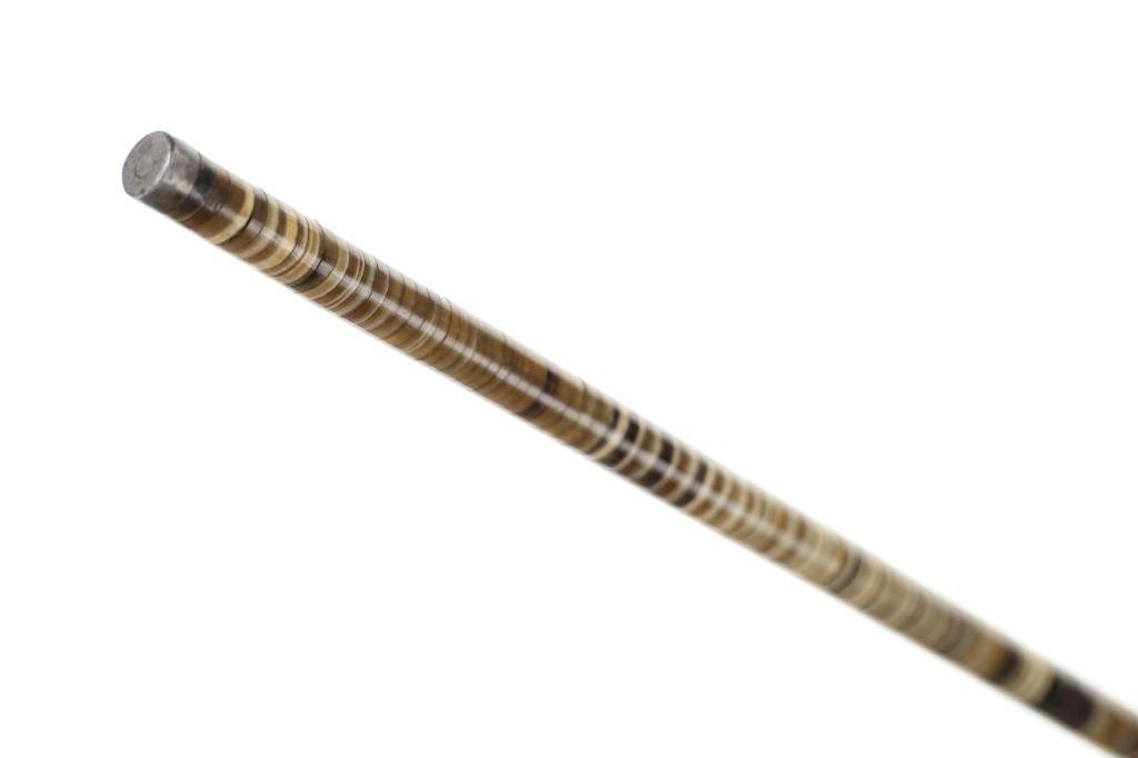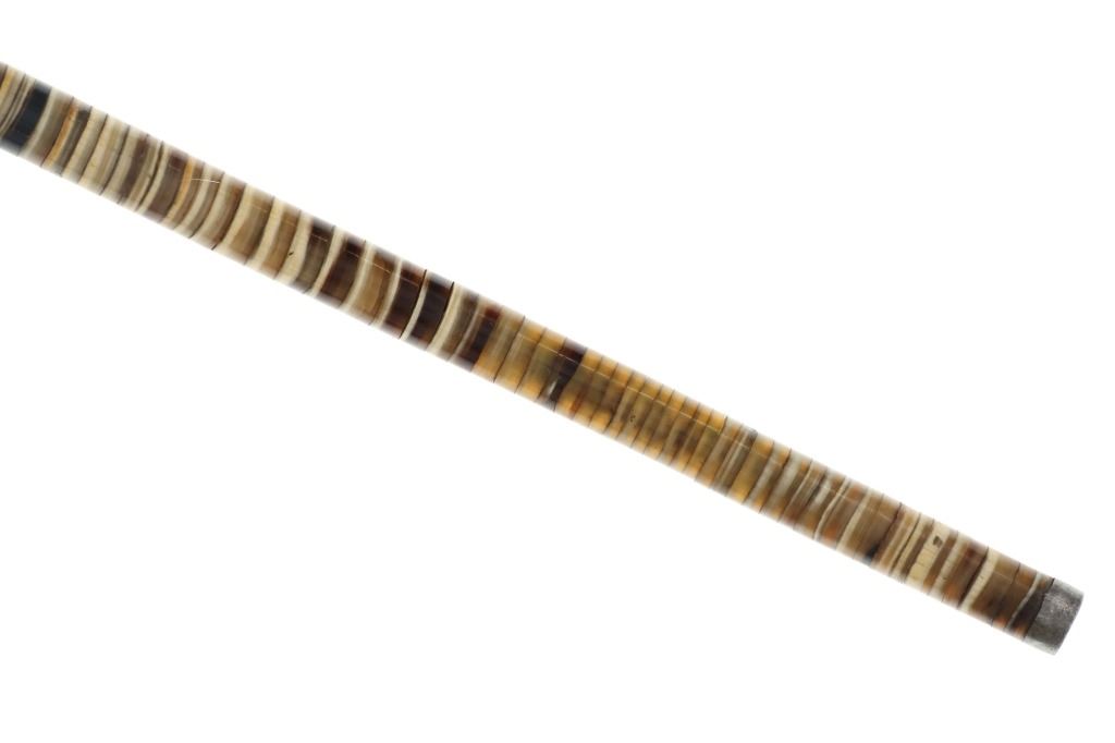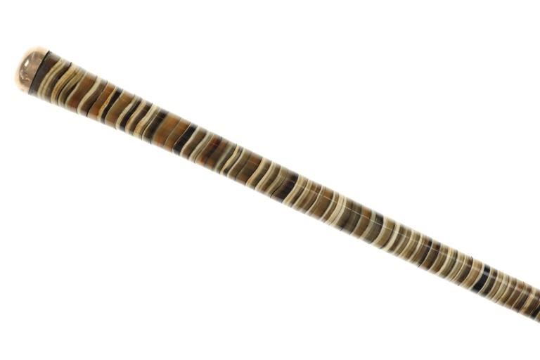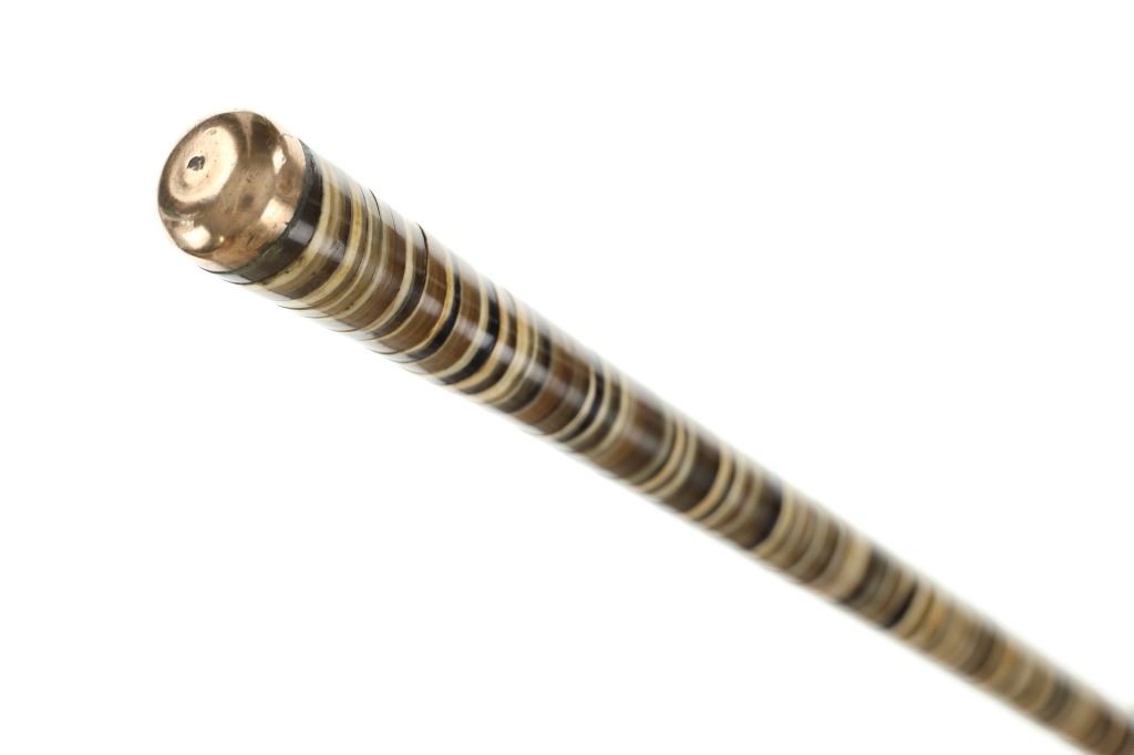 This is an incredible circa 1850- Civil War era plantation owner cane with rare stacked Ram's Horn. Featuring polished graduated polychrome rosettes of ram's horn adorning a flexible shaft, a 9k gold top cap and metal tip. These types of canes became popular in the 18th century in the West Indies. Nice patina observed on both 9k gold cap and metal tip, no marring observed on ram's horn rosettes. Measures 35.5"L
