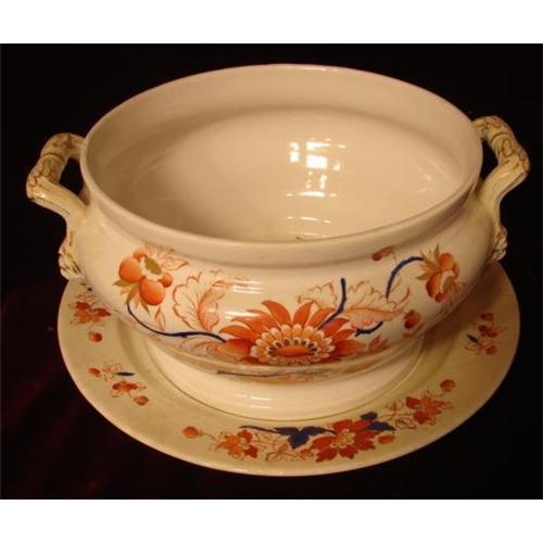 On the bottom of both the tureen and the underplate is the number #982, which apparently would have been a pattern number. Even though the cover is missing this is a nice 19TH Century piece of English Porcelain. Without the original cover, it would make a nice decorative planter. The tureen measures 12" from handle to handle. The dimension of the top opening is 9" and the diameter of the underplate is 12 1/2". The height of the tureen is 6"