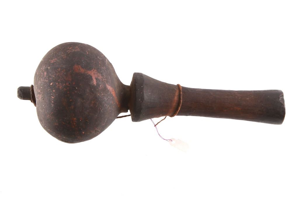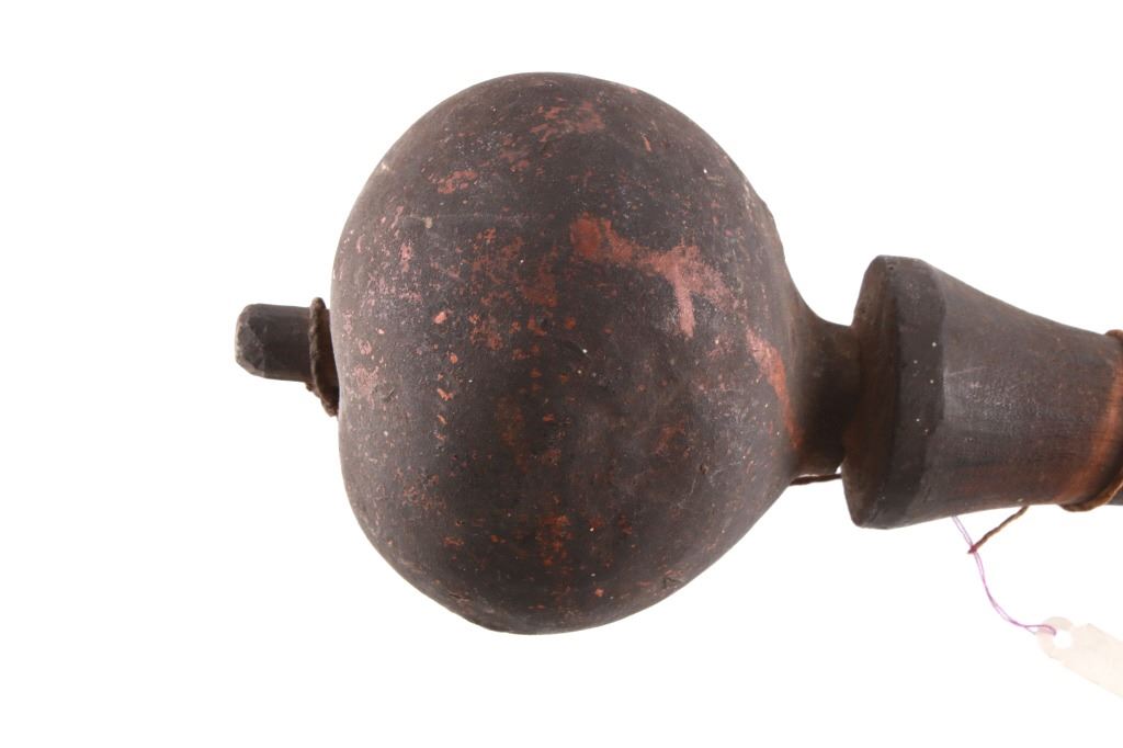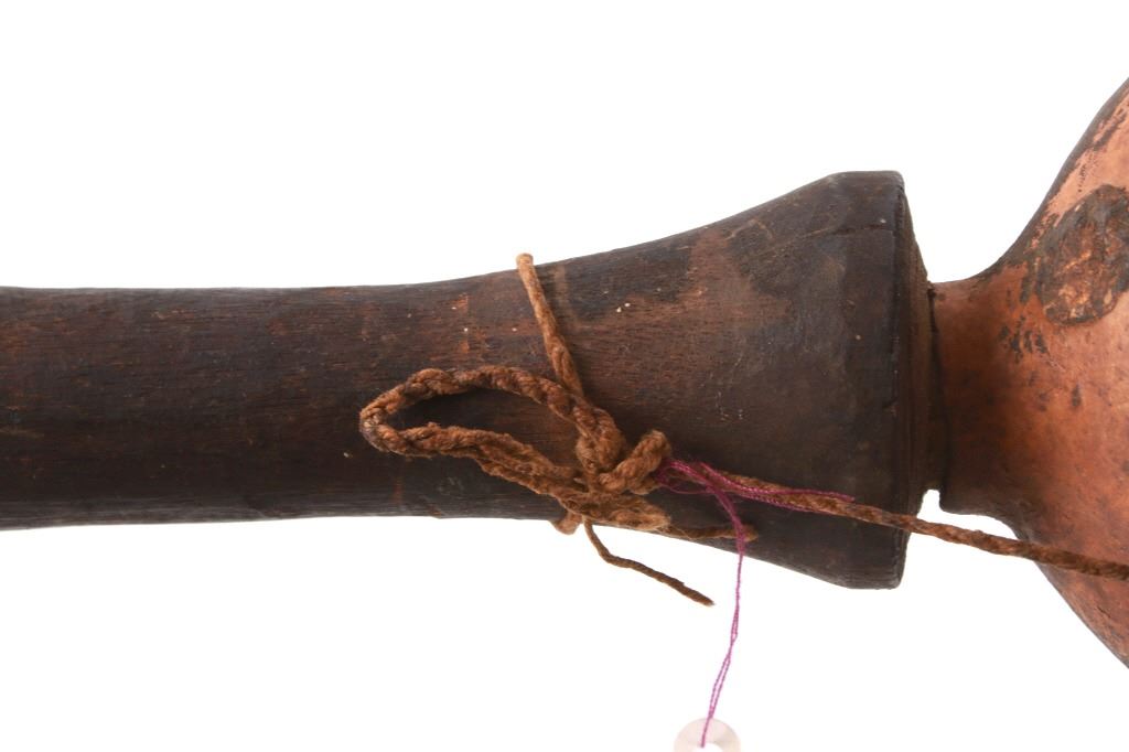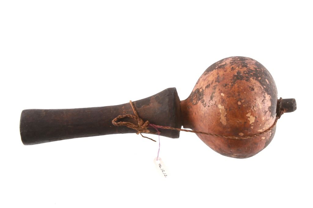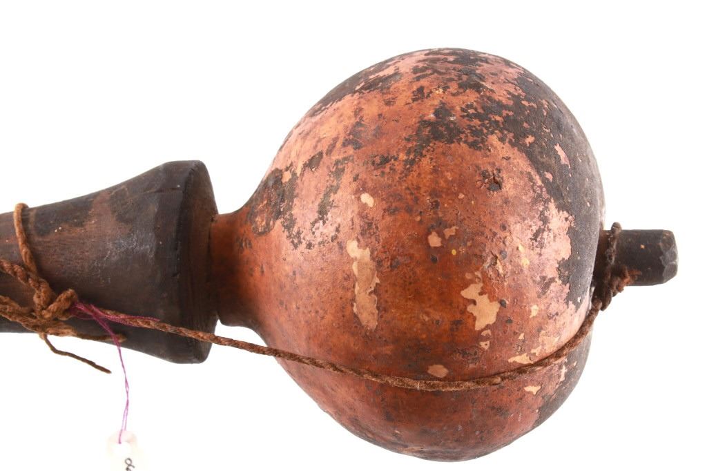 The lot features a circa 1850 Pueblo Indian Gourd Ratle from the Sundog Bruce VanLandingham collection. The rattle exhibits a gourd top on a wood dowel with expertly carved wood handle tied with a twine trade tie. An original museum collection tag is still attached, marked "06.12.12". Provenance: From the renowned Sundog Fine Art Bozeman, Montana collection and acquired by Bruce VanLandingham. Bruce VanLandingham was a pillar in the American Indian collecting community and a respected expert. Along with being an avid collector Bruce also was the sole owner of Sundog Fine Art Gallery in Bozeman which was both part museum and gallery. The entire piece is covered with a dark mineral pigment paint. For examples see the example from The Met Museum collection for the 19th Century piece from the Sia Pueblo with Idiophone-Shaken-rattle and the Antique Gourd Rattle circa 1850 from the Omaha Plains Indians. Measures 9.5"L by 4"W.