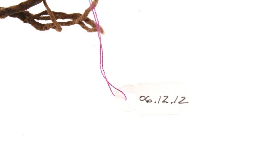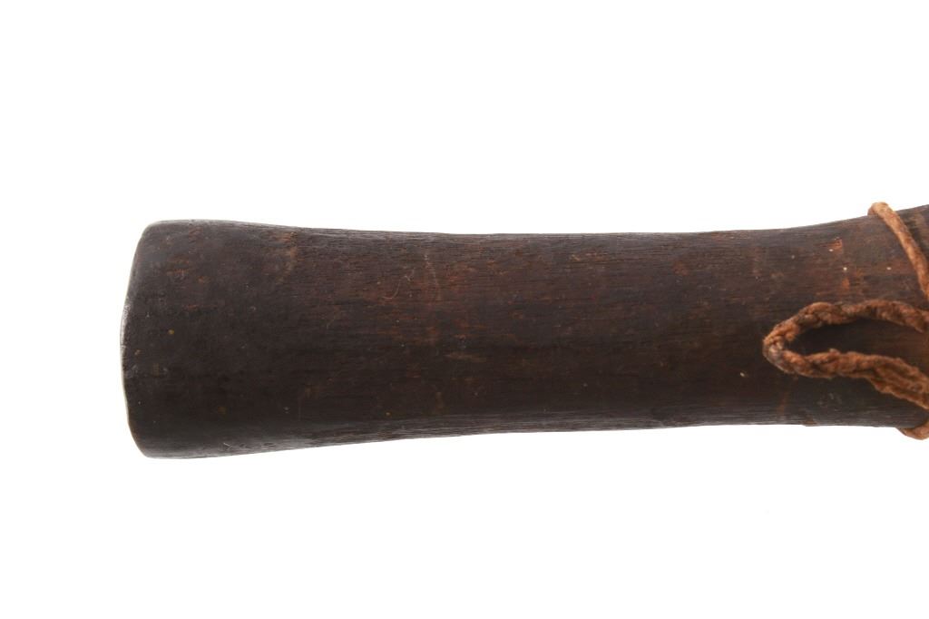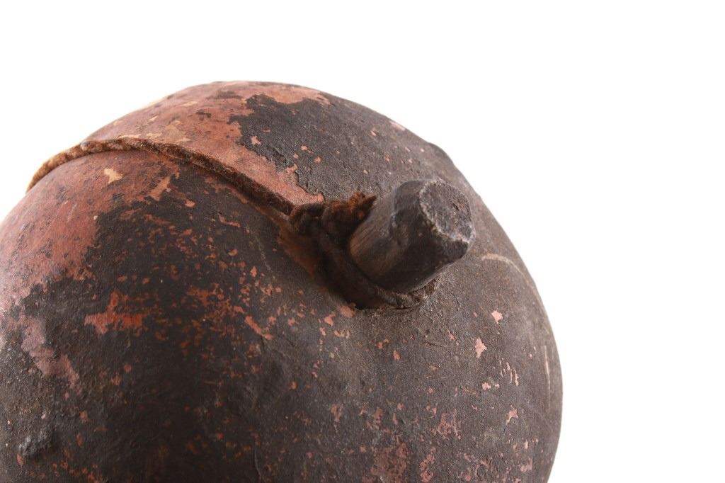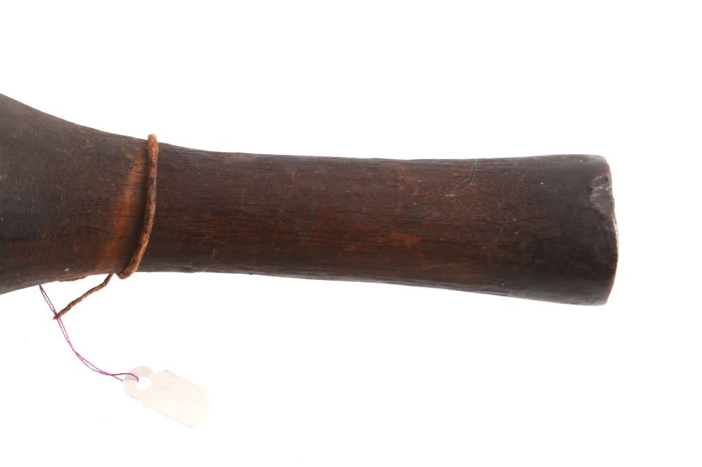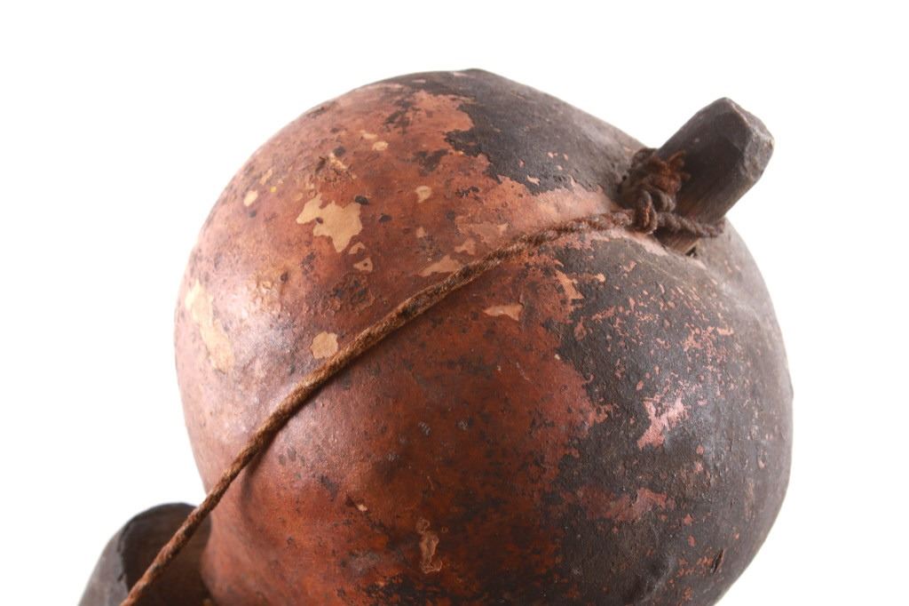 The lot features a circa 1850 Pueblo Indian Gourd Ratle from the Sundog Bruce VanLandingham collection. The rattle exhibits a gourd top on a wood dowel with expertly carved wood handle tied with a twine trade tie. An original museum collection tag is still attached, marked "06.12.12". Provenance: From the renowned Sundog Fine Art Bozeman, Montana collection and acquired by Bruce VanLandingham. Bruce VanLandingham was a pillar in the American Indian collecting community and a respected expert. Along with being an avid collector Bruce also was the sole owner of Sundog Fine Art Gallery in Bozeman which was both part museum and gallery. The entire piece is covered with a dark mineral pigment paint. For examples see the example from The Met Museum collection for the 19th Century piece from the Sia Pueblo with Idiophone-Shaken-rattle and the Antique Gourd Rattle circa 1850 from the Omaha Plains Indians. Measures 9.5"L by 4"W.