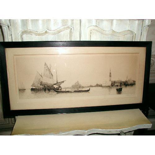 The original wavy glass can still be seen on this C.1850 European pen and ink of Venice,Italy across the water looking back to the shore. Signed in lower right corner by H. B. Hart,well known 19th century artist. Every detail is captured in the old sailing vessels with billowing sails,the man powered gondola and the architecture of surrounding buildings. He has done an exceptional display of distant buildings with faint,yet detailed outlines of structures and dome roofs. In excellent condition,the antique cream mat has two minor water marks left hand side. Framed in a black wooden 2 inch frame. Measures 38.5L X 18.5H X .75D framed.