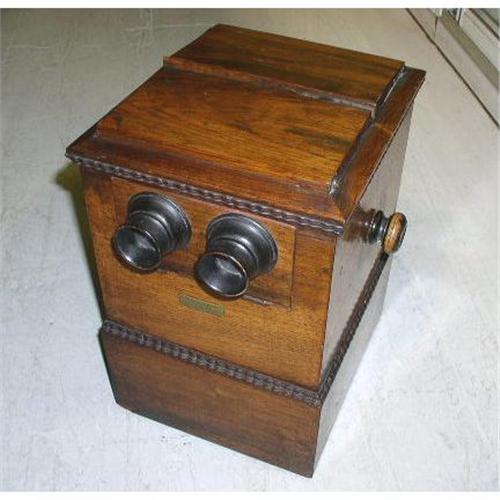 Pat. April 7, 1857 Alex Becker double stereo viewer original fine working condition. Minor damage to one knob with an old repair. 14in. X 9.5in. X 10.5in. Holds aproximately 50 cards (included).