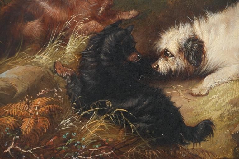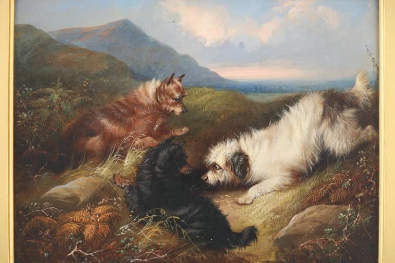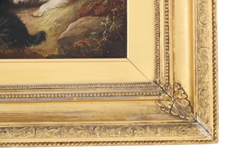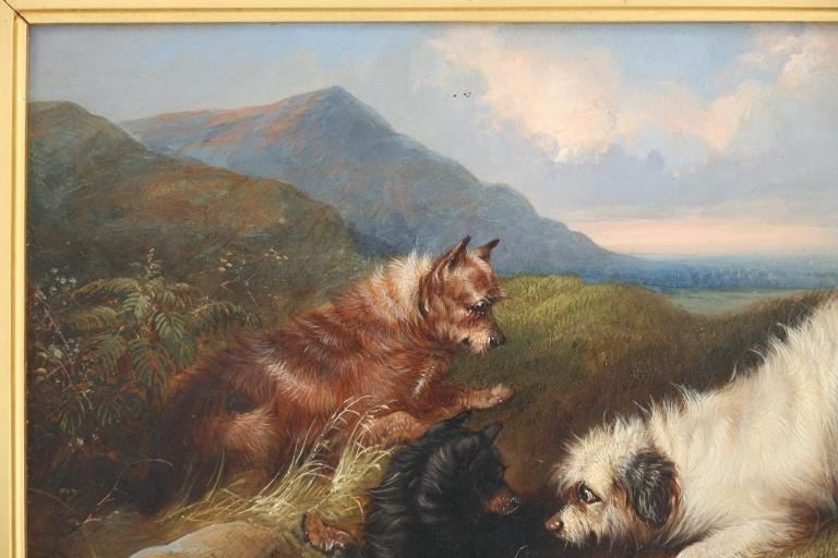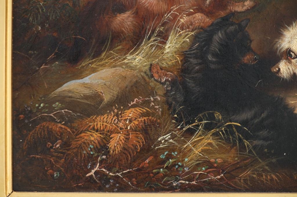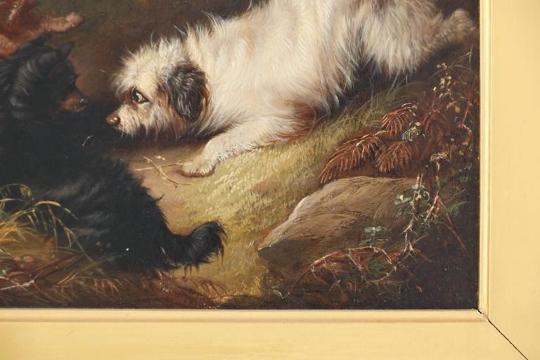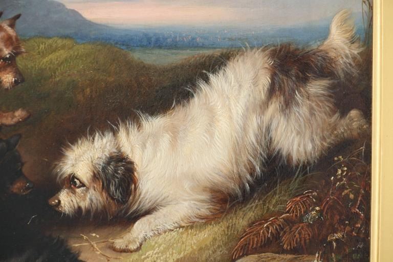 For your consideration is an Original George Armfield Oil on Canvas Painting, Three Dogs, cireca 1858-1870. Reverse of canvas is marked with the stamp of "R. Davis Chenies Mews 10 Huntley St, Tottenham Court Road". Robert Davis (b. c.1824) would appear to be the individual recorded in the 1851 census as artists' colourman, listed in 1857 as artists’ canvas primer. He is listed in the National Portrait Gallery research section under "British artists' suppliers, 1650-1950 - D. This canvas would have been attended circa 1858-1870. Armfield is regarded as one of Victorian England’s finer animal artists and his work as sought-after as it was in his own lifetime. Although this piece is unsigned, as is the case for most artists, his singular style and unique tight brushstrokes are his signature. The artist’s use of light is just mesmerizing. Not only can you see the wonderfully depicted expressions of the dogs, but their fur is painted marvelously. As with many of his paintings, the principle focus is on the dogs and their expressions. George Armfield (1808-1893) was a British genre artist specializing in oil paintings of domesticated dogs, probably the most prolific dog painter of the nineteenth century. He was an avid sportsman as well as being a prolific and popular painter of sporting subjects. George exhibited thirty two paintings at the Royal Academy between 1840 and 1862 and exhibited regularly at the British Institute and at the Suffolk Street Galleries until 1875. Armfield painted dogs almost exclusively, especially terriers chasing birds, cats or mice and spaniels flushing ducks. With broad paint strokes and loose handling of the brush, the painter effectively represents the different textures of fur, grasses and sky. This painting is mounted in its original custom-made wood and gold gilt gesso elaborate Victorian frame. The frame is hand-finished, and the nuances of the hand-applied gilding is apparent. The painting is in very nice condition, no marring. The custom Victorian style frame is nicely preserved, some gesso loss noted. Visible art measures 8.5"W x 11.5"L, frame is 16.75"W x 19.75"L x 2"D, combined weight is 4lb, 8oz.
