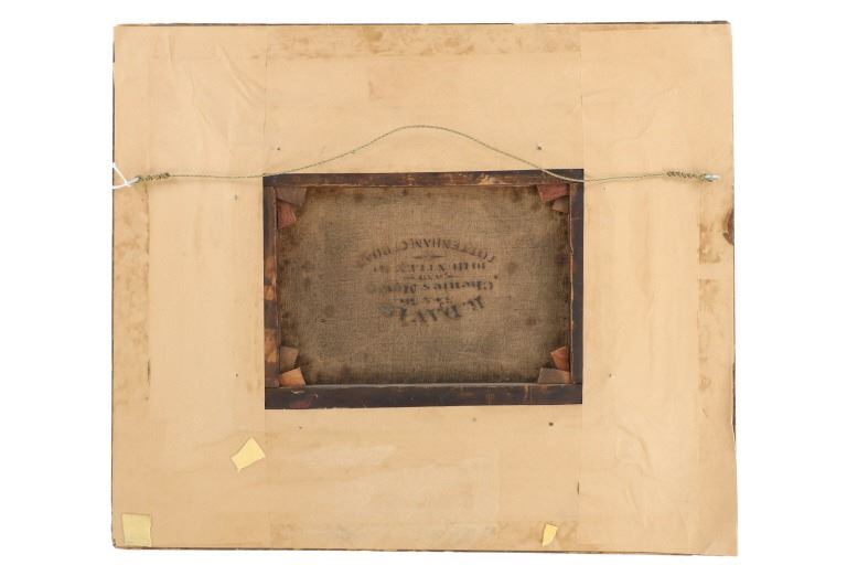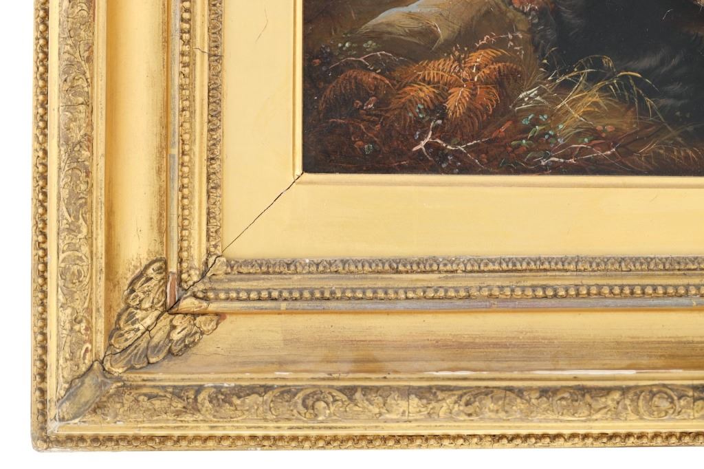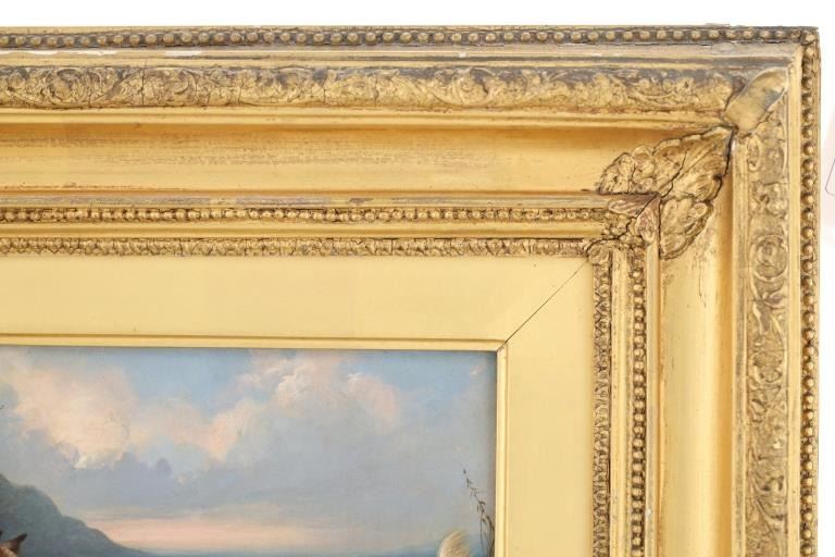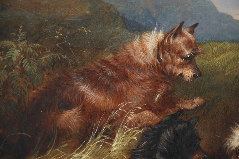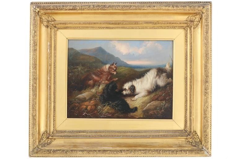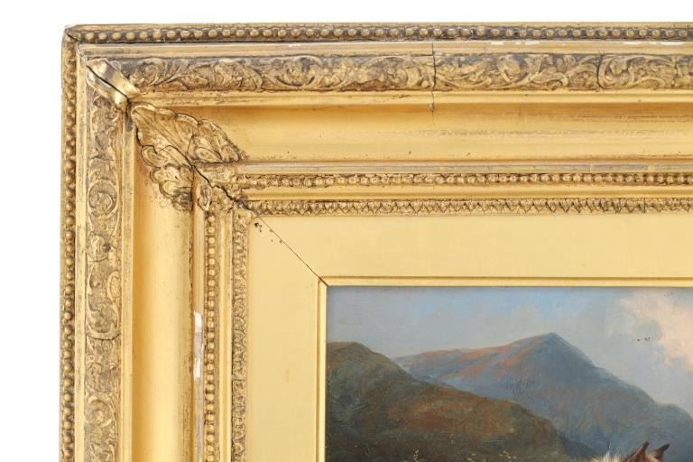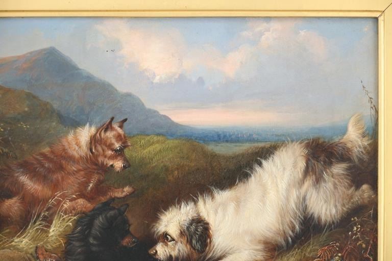 For your consideration is an Original George Armfield Oil on Canvas Painting, Three Dogs, cireca 1858-1870. Reverse of canvas is marked with the stamp of "R. Davis Chenies Mews 10 Huntley St, Tottenham Court Road". Robert Davis (b. c.1824) would appear to be the individual recorded in the 1851 census as artists' colourman, listed in 1857 as artists’ canvas primer. He is listed in the National Portrait Gallery research section under "British artists' suppliers, 1650-1950 - D. This canvas would have been attended circa 1858-1870. Armfield is regarded as one of Victorian England’s finer animal artists and his work as sought-after as it was in his own lifetime. Although this piece is unsigned, as is the case for most artists, his singular style and unique tight brushstrokes are his signature. The artist’s use of light is just mesmerizing. Not only can you see the wonderfully depicted expressions of the dogs, but their fur is painted marvelously. As with many of his paintings, the principle focus is on the dogs and their expressions. George Armfield (1808-1893) was a British genre artist specializing in oil paintings of domesticated dogs, probably the most prolific dog painter of the nineteenth century. He was an avid sportsman as well as being a prolific and popular painter of sporting subjects. George exhibited thirty two paintings at the Royal Academy between 1840 and 1862 and exhibited regularly at the British Institute and at the Suffolk Street Galleries until 1875. Armfield painted dogs almost exclusively, especially terriers chasing birds, cats or mice and spaniels flushing ducks. With broad paint strokes and loose handling of the brush, the painter effectively represents the different textures of fur, grasses and sky. This painting is mounted in its original custom-made wood and gold gilt gesso elaborate Victorian frame. The frame is hand-finished, and the nuances of the hand-applied gilding is apparent. The painting is in very nice condition, no marring. The custom Victorian style frame is nicely preserved, some gesso loss noted. Visible art measures 8.5"W x 11.5"L, frame is 16.75"W x 19.75"L x 2"D, combined weight is 4lb, 8oz.
