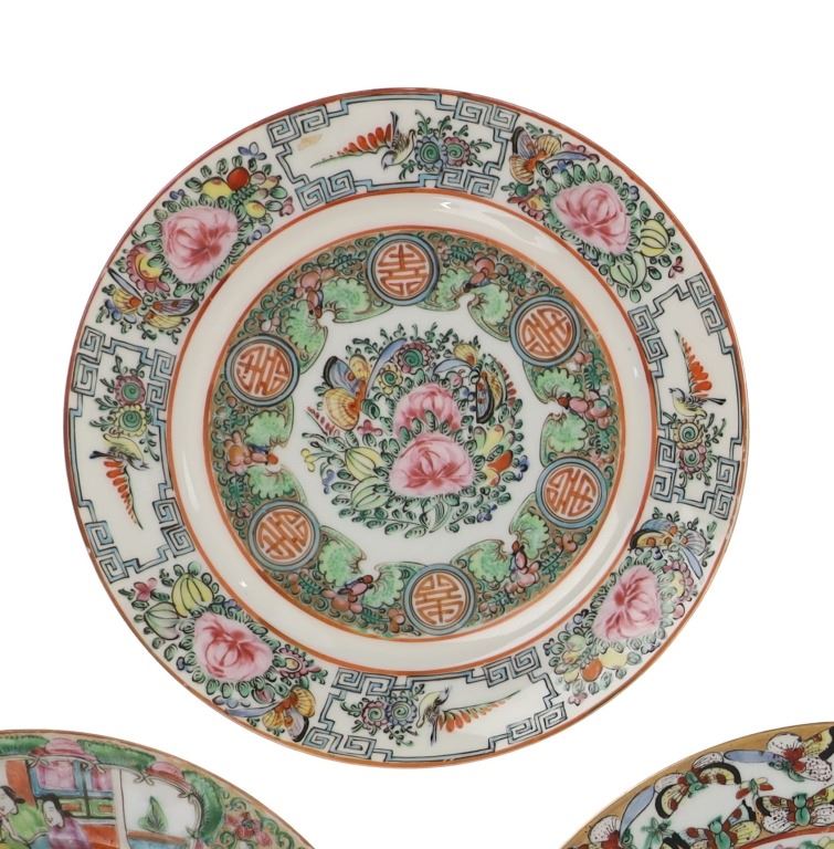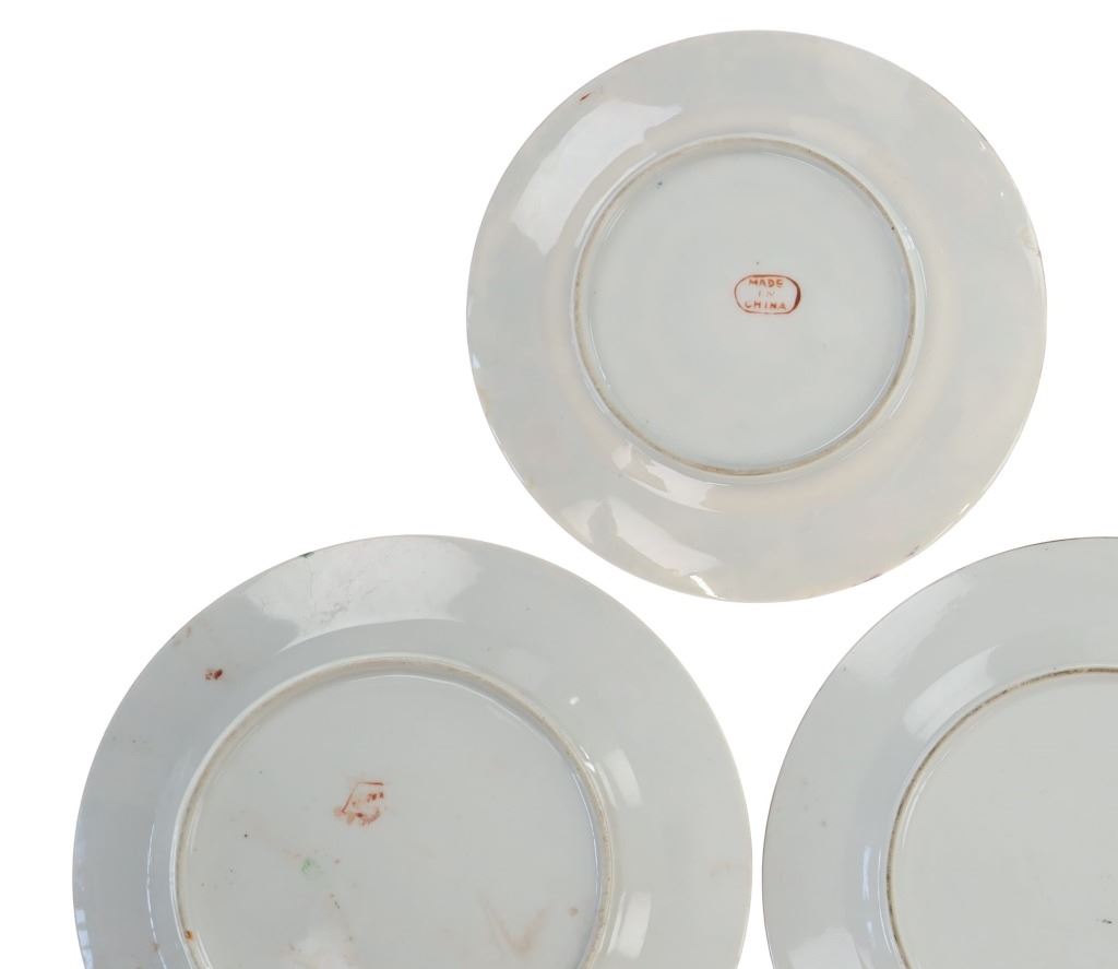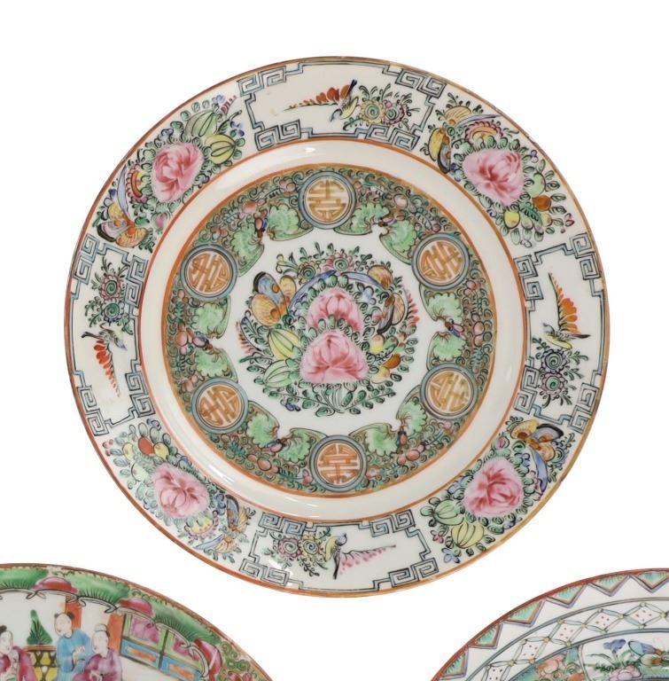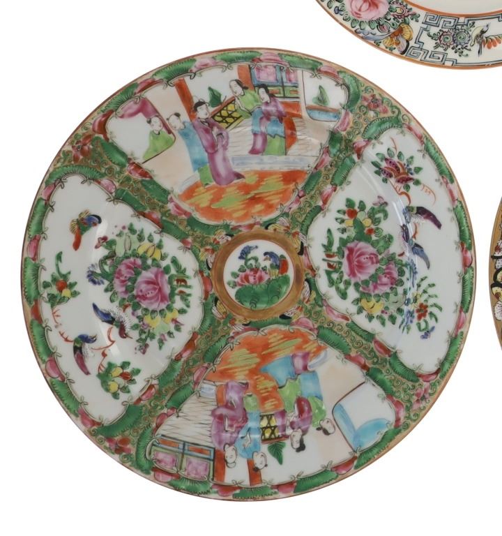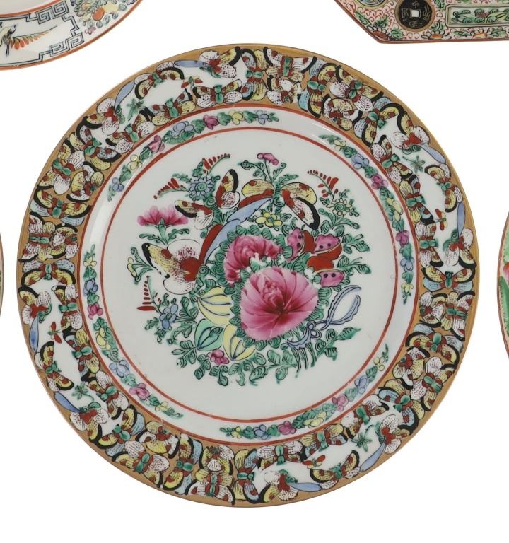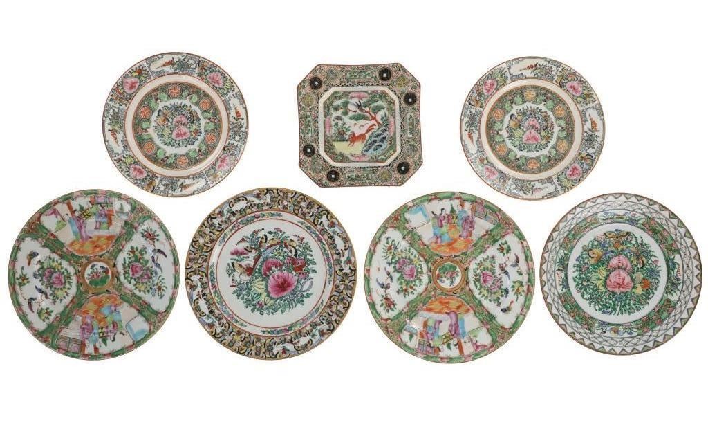 Featured in this lot are Rose Canton and Rose Medallion plates (7), circa 1860-1920. Provenance: Private collector, Big Sky, Montana. Rose Canton porcelain has similar colour palette to the Rose Medallion but has no people or birds present in the painted scenes. One Rose Canton plate is circa 1860-1889. Two Rose Medallion plates have "China" import stamp marking on reverse circa 1890-1919. One Rose medallion and three Rose Canton plates have "Made in China" import stamp marking on reverse circa 1920. In the 17th century, different patterns were designed in order to satisfy the high demand for Chinese ceramics in Western Europe. Perhaps the most popular and desirable of the patterns, Chinese Rose Medallion, perfectly showcases the uniqueness and recognizability of Chinese export porcelain. Called “polychrome enameled,” this type of porcelain consists of a ceramic body decorated in only blue pigment and then painted under the glaze in a variety of colours and depictions. The pattern, extremely recognizable, consists of a central medallion that often features a bird of a peony. Outside of the medallion, four or more panels typically encircle the body of the ceramic, covering the piece in a flat narrative sequence. Figures, trees, birds, butterflies encircle the porcelain ware, leaving the viewer to discern the intricate details within each panel. The dominant colours of the rose medallion pattern often consists of vibrant pinks, greens, reds, blues, and sometimes softer pastels. If the Rose Medallion piece doesn’t have any marks or characters to identify itself, then it is most likely a piece made before 1890. Some of the highest quality Rose Medallion pieces utilized gold to highlight the finer details, and even some of the more intricate depictions on the surface. Plates are in good overall condition, very slight scuffing noted to underside edges, no other obvious marring noted. Approximate measurements 10" diameter each, weight approximate 4lb, 8oz
