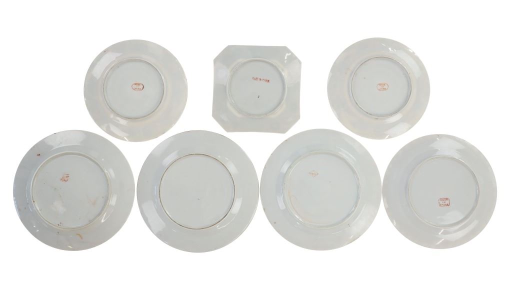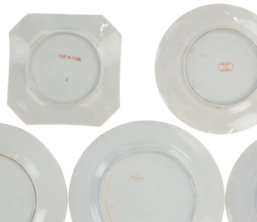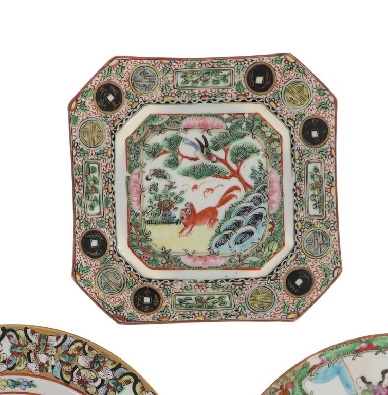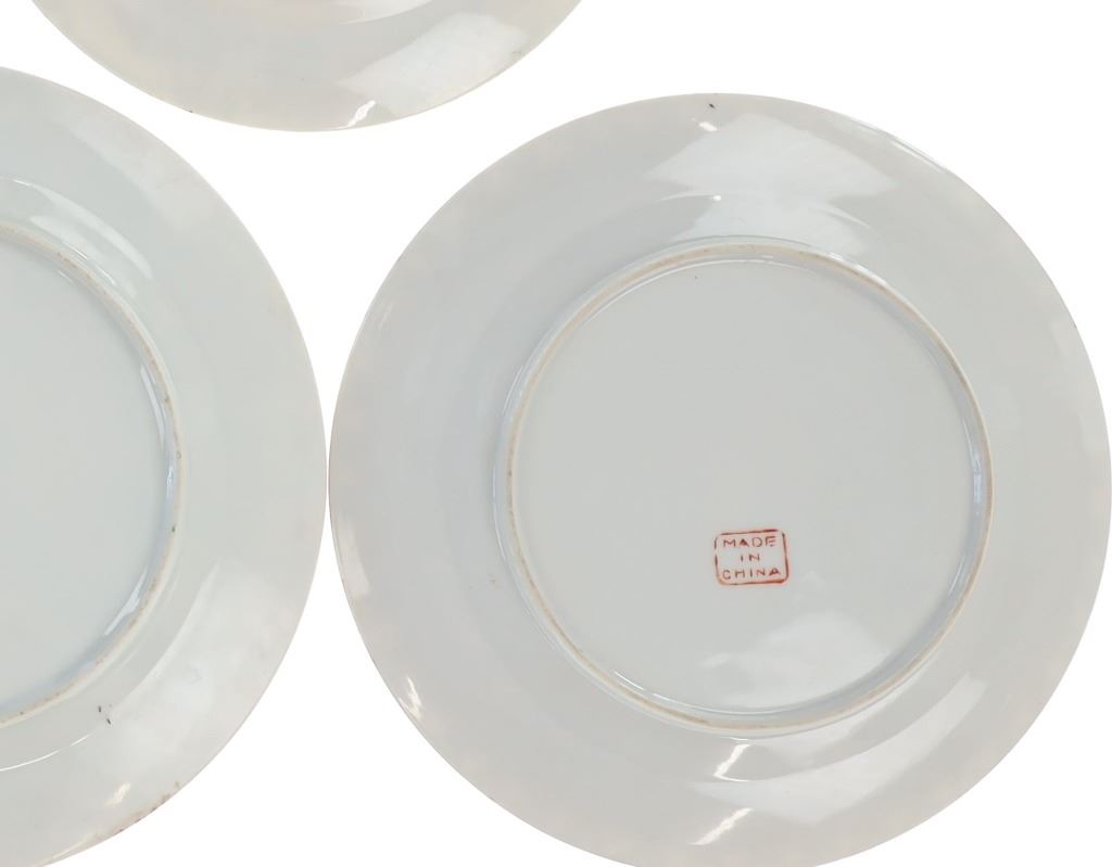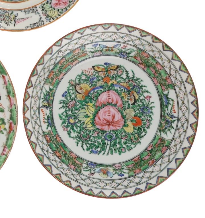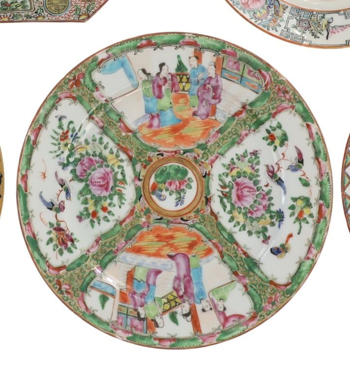 Featured in this lot are Rose Canton and Rose Medallion plates (7), circa 1860-1920. Provenance: Private collector, Big Sky, Montana. Rose Canton porcelain has similar colour palette to the Rose Medallion but has no people or birds present in the painted scenes. One Rose Canton plate is circa 1860-1889. Two Rose Medallion plates have "China" import stamp marking on reverse circa 1890-1919. One Rose medallion and three Rose Canton plates have "Made in China" import stamp marking on reverse circa 1920. In the 17th century, different patterns were designed in order to satisfy the high demand for Chinese ceramics in Western Europe. Perhaps the most popular and desirable of the patterns, Chinese Rose Medallion, perfectly showcases the uniqueness and recognizability of Chinese export porcelain. Called “polychrome enameled,” this type of porcelain consists of a ceramic body decorated in only blue pigment and then painted under the glaze in a variety of colours and depictions. The pattern, extremely recognizable, consists of a central medallion that often features a bird of a peony. Outside of the medallion, four or more panels typically encircle the body of the ceramic, covering the piece in a flat narrative sequence. Figures, trees, birds, butterflies encircle the porcelain ware, leaving the viewer to discern the intricate details within each panel. The dominant colours of the rose medallion pattern often consists of vibrant pinks, greens, reds, blues, and sometimes softer pastels. If the Rose Medallion piece doesn’t have any marks or characters to identify itself, then it is most likely a piece made before 1890. Some of the highest quality Rose Medallion pieces utilized gold to highlight the finer details, and even some of the more intricate depictions on the surface. Plates are in good overall condition, very slight scuffing noted to underside edges, no other obvious marring noted. Approximate measurements 10" diameter each, weight approximate 4lb, 8oz