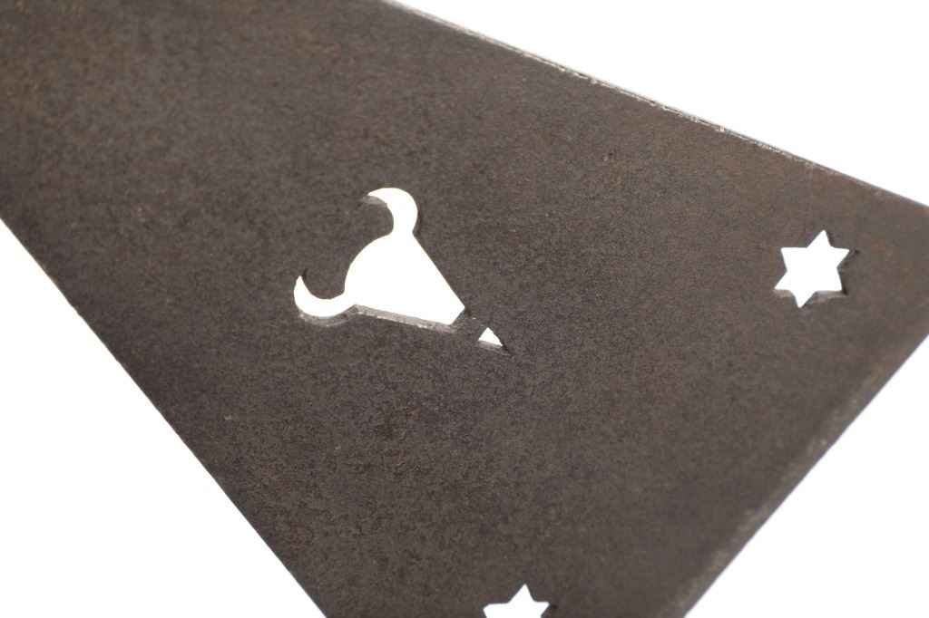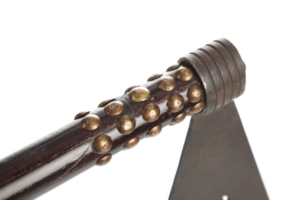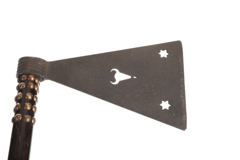 This is a fantastic rare circa 1860’s to 1870’s Missouri War Axe Tomahawk from the Pawnee Indians of Kansas. The piece is comprised of a hand-forged iron head with rare Buffalo Bison head effigy cutout (cut out) at the center along with two six-pointed star cutouts below just above the blade. The head has an oblong round eyelet hole with four filed ridges being secured to the wood haft with a leather hide gasket and solid brass trade tacks. The dark solid wood haft has a deep, shiny chocolate patina from honest age and use and is decorated with bands of solid brass trade tacked design. Just below the gripping area is a pierced hole holding the rare drop. The drop consists of old crenshaw twine, old tarnished brass trade beads and 18 human teeth, below there are two hand rolled tin jingle dangle cones at the base with old human hair plume fringes attached. This type of human teeth drop has been documented on other Pawnee attributed tomahawks, war clubs and lance poles by tomahawk shcolars and authors Peterson, Baldwin, Francis etc… The Pawnee were brutal killers and were known to mutilate the bodies of their war victims and make necklaces / drops from fingers, ears, teeth, hair and scalps. The tomahawk war club head has a larger wide triangular shape and is considered to be a "Missouri War Axe" a term coined by American Indian weapons collectors to describe this particular style of tomahawk. They were first discovered by Lewis & Clark on their 1804-1805 expedition financed by Thomas Jefferson, which sent them exploring up the upper Missouri River basin. Meriwether Lewis wrote about these weapons and sketched one in his journal, stating that the local Indians were fervently requesting the expedition blacksmith to make additional examples for them. He went as far as to state that it was the only item the Indians were willing to trade corn, grain and other expedition necessities for and that manufacture, and trade of additional axes is what solely got the explorers through the winter of 1805. Only a small handful of tribes were known to have used this style of tomahawk and in only one specific region. They were made in small numbers, making early surviving examples such as this extremely rare and historically important. The tomahawk war club shows some minor nicks, dings and scratches to the haft indicative of honest age and use and overall has a nice patina. Provenance: From the ex-collection of Cyrus Eaton of London, England, according to his collection log book Eaton purchased the tomahawk from a dealer at the Whitehawk Indian Show in Santa Fe, New Mexico circa 1992. The head measures 8”L by 4.75”W across the bottom of the blade. The tomahawk itself measures 22”L without the drop.