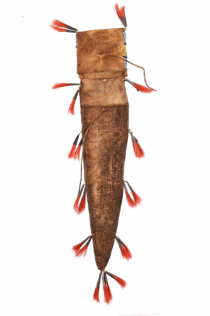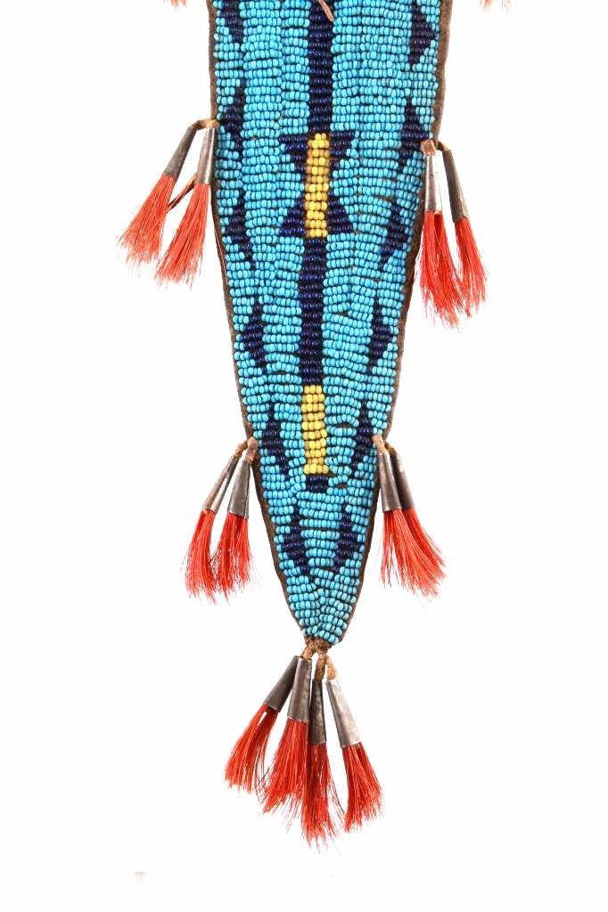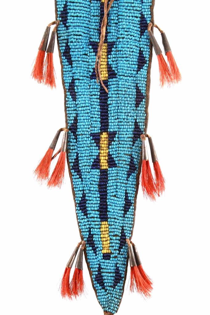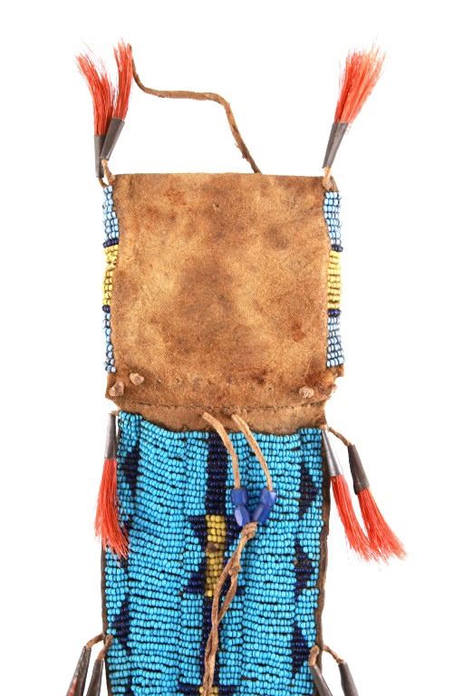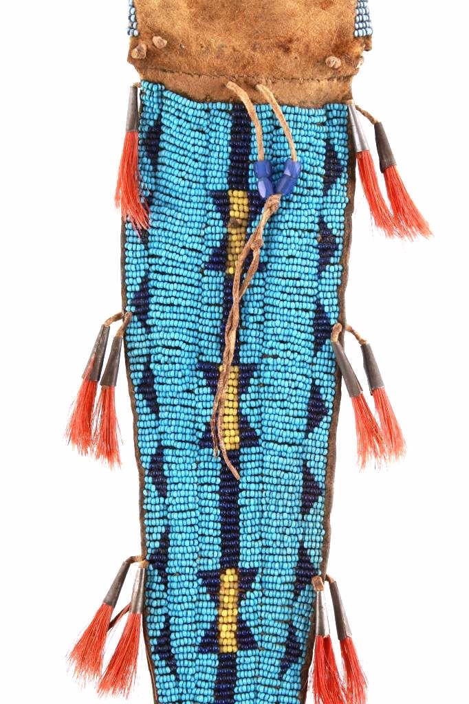 This is an incredibly rare authentic original Cheyenne beaded hide triangle flat belt pouch dating to circa 1860-1870. Cheyenne belt pouchs with this long triangle flap attached to a smaller square bag are immensely rare. For example see the bag sold by Skinner in 2015 for $18,450 and another sold by Skinner in 2017 for $9,840 (both sold within their estimates of $15,000-$20,000 and $8,000-$12,000) with our example being nearly identical in shape, material, tribe and age. The bag features a thick Buffalo Indian tanned hide which is sinew sewn and adorned with period correct glass trade seed beads in a traditional geometric pattern. The beadwork includes colors of light blue, cobalt and greasy yellow. The bag has a long tail like triangle flap covered with 20 rolled ring jingle dangle cones having red ocher dyed horse hair and is attached with sinew to the swuare tab belt pouch bag which also holds four rolled tin jingle cones with red ocher dyed horse hair and has matching beadwork along both sides. The inside of the pouch shows two original hide ties and the back of the bag also shows a belt hide tie with four faceted old Russian glass trade beads. The inside of the long triangle tail flap is heavily patina'd with a darker oily color. Overall the hide is still stupple and soft with some stiffening. The sinew is exposed in a few spots with very little to no bead loss and no major damage. Provenance: From the renowned Sundog Fine Art Bozeman, Montana collection by Bruce VanLandingham. Bruce VanLandingham was a pillar in the American Indian collecting community and a respected expert. Along with being an avid collector, Bruce was also the sole owner of Sundog Fine Art Gallery in Bozeman, which was both part museum and gallery, this piece is directly from the collection. Possibly one of the more scarce Indian Wars era beaded items in the sale with wonderful collecting history. Measures overall 14"L by 4.5"W. Likely of a better overall beadwork appeal than the example that nearly brought $20,000 in 2015. Museum collection number E1047.