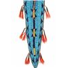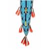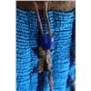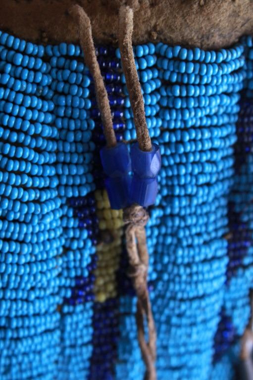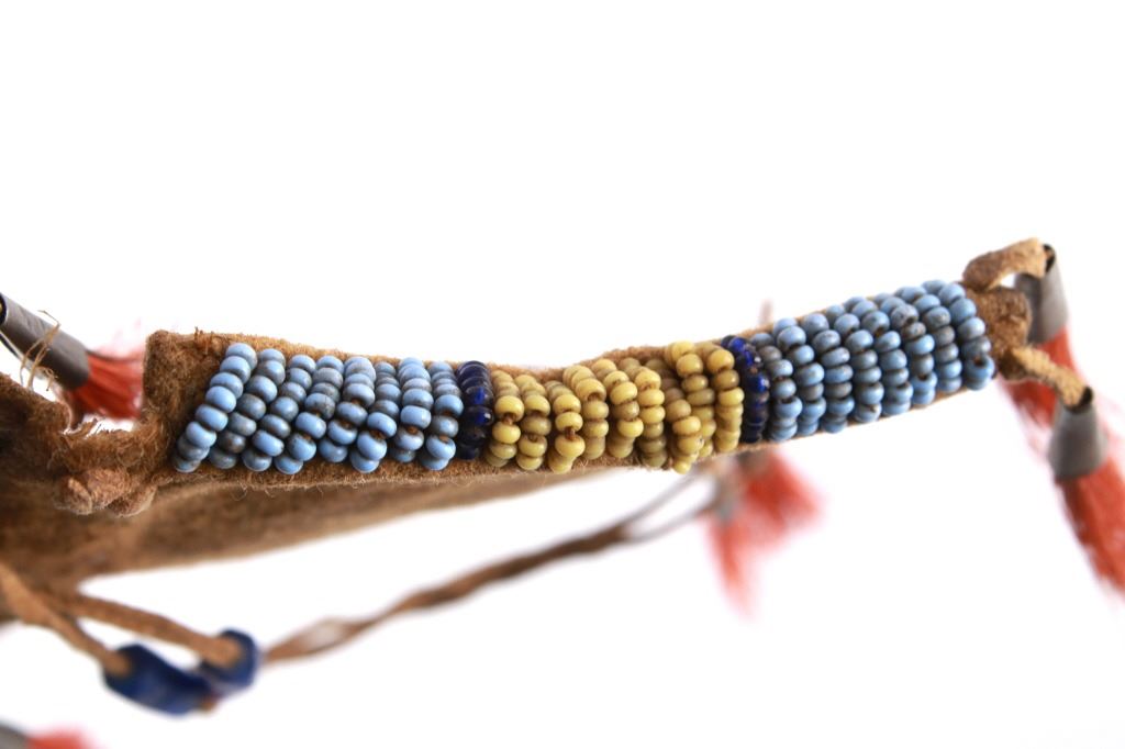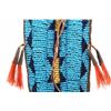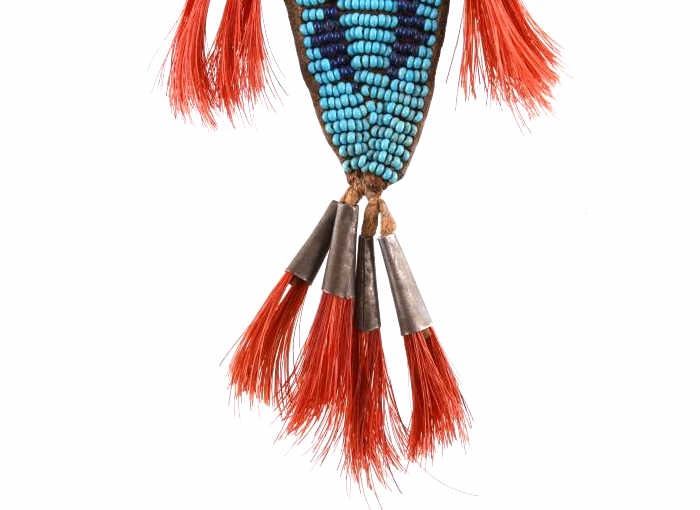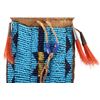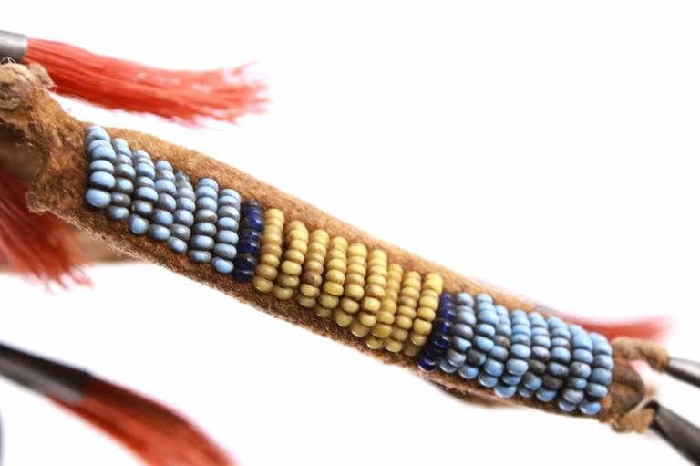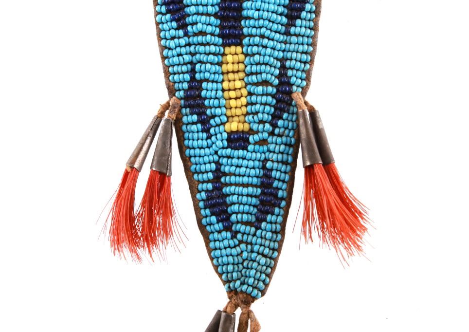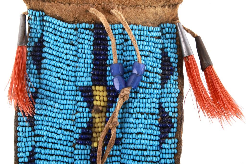 This is an incredibly rare authentic original Cheyenne beaded hide triangle flat belt pouch dating to circa 1860-1870. Cheyenne belt pouchs with this long triangle flap attached to a smaller square bag are immensely rare. For example see the bag sold by Skinner in 2015 for $18,450 and another sold by Skinner in 2017 for $9,840 (both sold within their estimates of $15,000-$20,000 and $8,000-$12,000) with our example being nearly identical in shape, material, tribe and age. The bag features a thick Buffalo Indian tanned hide which is sinew sewn and adorned with period correct glass trade seed beads in a traditional geometric pattern. The beadwork includes colors of light blue, cobalt and greasy yellow. The bag has a long tail like triangle flap covered with 20 rolled ring jingle dangle cones having red ocher dyed horse hair and is attached with sinew to the swuare tab belt pouch bag which also holds four rolled tin jingle cones with red ocher dyed horse hair and has matching beadwork along both sides. The inside of the pouch shows two original hide ties and the back of the bag also shows a belt hide tie with four faceted old Russian glass trade beads. The inside of the long triangle tail flap is heavily patina'd with a darker oily color. Overall the hide is still stupple and soft with some stiffening. The sinew is exposed in a few spots with very little to no bead loss and no major damage. Provenance: From the renowned Sundog Fine Art Bozeman, Montana collection by Bruce VanLandingham. Bruce VanLandingham was a pillar in the American Indian collecting community and a respected expert. Along with being an avid collector, Bruce was also the sole owner of Sundog Fine Art Gallery in Bozeman, which was both part museum and gallery, this piece is directly from the collection. Possibly one of the more scarce Indian Wars era beaded items in the sale with wonderful collecting history. Measures overall 14"L by 4.5"W. Likely of a better overall beadwork appeal than the example that nearly brought $20,000 in 2015. Museum collection number E1047.