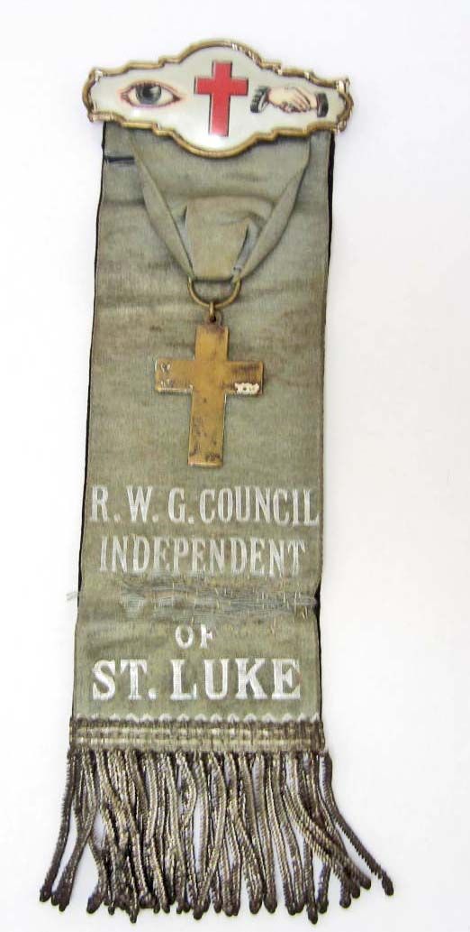The top part of the ribbon is a celluloid Eye, Red Cross and Shaking Hands. There is a metal cross hanging in the middle of the ribbon. The Ribbon reads R.W.G.COUNCIL INDEPENDENT OF ST. LUKE. A small part looks as if it has been repaired. The backside is black and reads IN MEMORIAM. Approx. 9" long including the silver bullion tassels