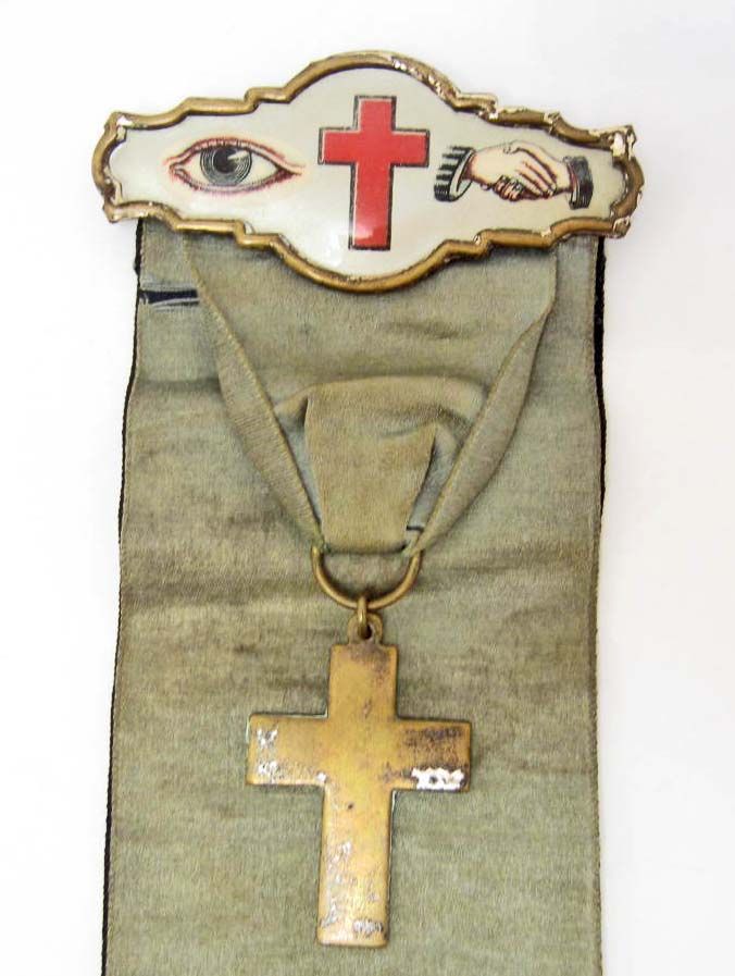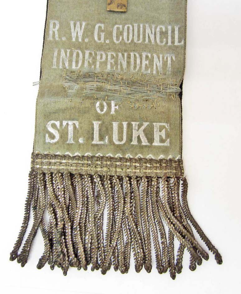 The top part of the ribbon is a celluloid Eye, Red Cross and Shaking Hands. There is a metal cross hanging in the middle of the ribbon. The Ribbon reads R.W.G.COUNCIL INDEPENDENT OF ST. LUKE. A small part looks as if it has been repaired. The backside is black and reads IN MEMORIAM. Approx. 9" long including the silver bullion tassels