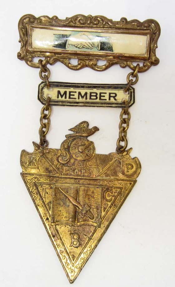 The top part of the pin is 2 hands shaking and is celluloid, the center of the pin is also celluloid and is marked MEMBER. The main part of the medal is brass and is embossed K of P w/ a book and a sword and also F C B in the triangle around the book. Approx. 5" long