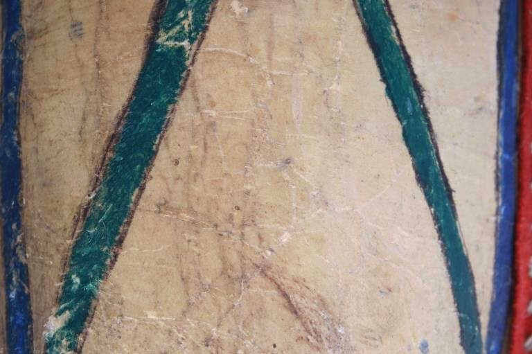 The lot features a polychrome painted parfleche elliptical case from the circa 1860-1870 Sioux Native American Indians and the Bruce VanLandingham Sundog collection. The parfleche rawhide piece shwos a nice large size and is reffered to as an elliptical case due to its base having an elliptical shape and curved outside body. Similar to a headdress bonnet case the piece has a tall body with Indian hide sewn single edge and sinew sewn bottom edge. The side edge is also woven with a strip of old red stroud wool trade clothe. The case has an excellent rich mineral pigment polychrome geometric traditional pattern with colors of blue, red, yellow, green. The painting is exhibited across the entire outside of the piece. The top has a single strap of Indian tanned hide. Provenance: From the renowned Sundog Fine Art Bozeman, Montana collection by Bruce VanLandingham. Bruce VanLandingham was a pillar in the American Indian collecting community and a respected expert. Along with being an avid collector, Bruce was also the sole owner of Sundog Fine Art Gallery in Bozeman, which was both part museum and gallery, this piece is directly from the collection. For other examples of rare elliptical cases see the Charles Zimmerman 19th Century elliptical case from the Nebraska State Historical Society, the 1880 elliptical case from the Donald Ellis Gallery and the 1840 elliptical case from the Thomas Cleary Gallery. The piece is in good overall condition with rich coloring and dates to the 19th Century. Overall without the strip of hide measures 13.75"L by 7"W by 5"D. Museum collection number E1005.