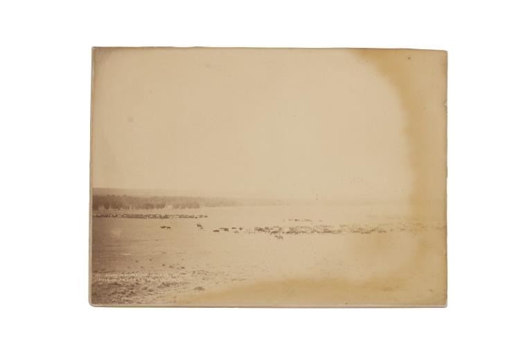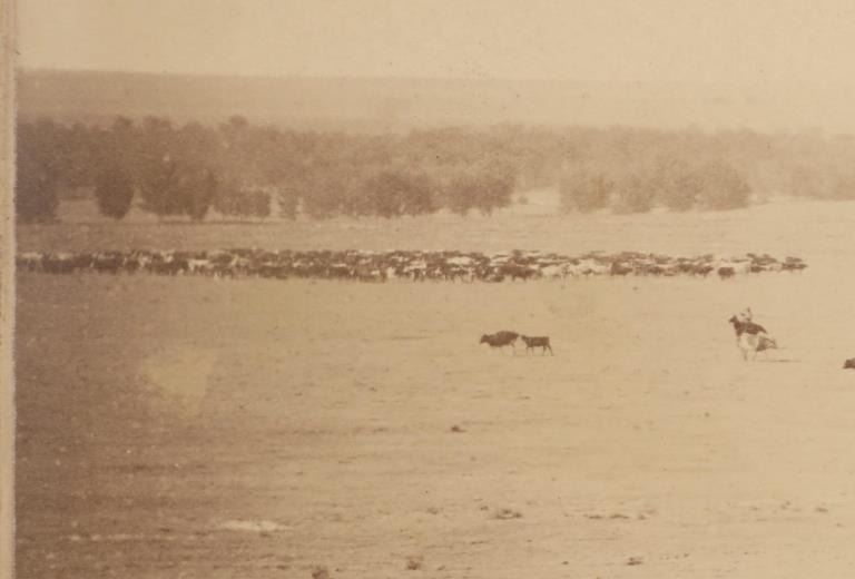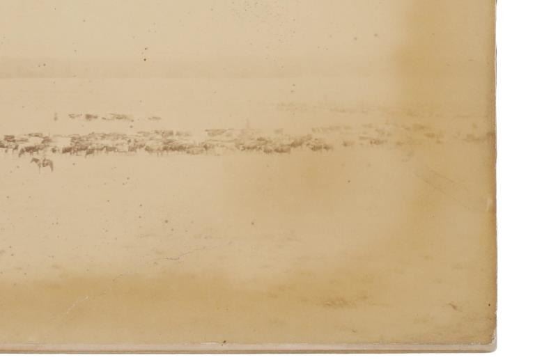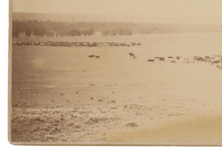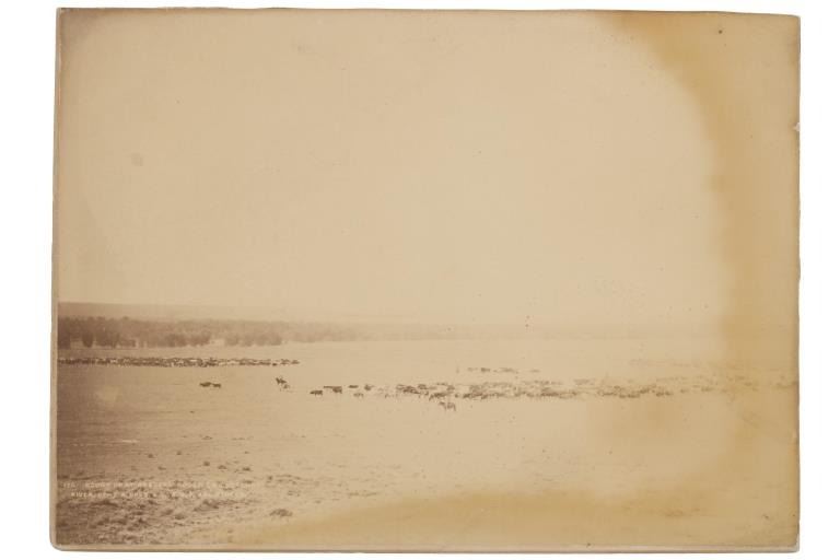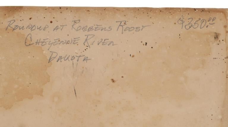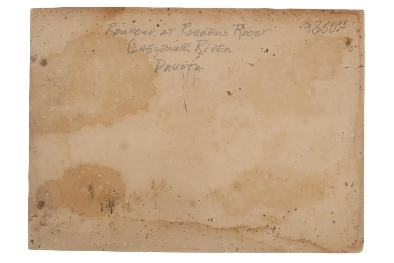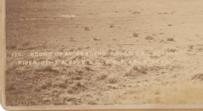 This is an original, mammoth plate albumen photograph from circa 1870-1880s of a Round Up at Robbers’ Roost, the iconic outlaw hideout in southeastern Utah Territory of Butch Cassidy's Wild Bunch (later known as Butch Cassidy and the Sundance Kid) and policed by Daniel Boone. Robbers Roost was an outlaw hideout used mostly by Butch Cassidy and his Wild Bunch gang in the years of the Old West. Robbers Roost was on the road leading to Cheyenne, Wyoming Territory along the Cheyenne River near the Robber’s Roost stage station. The Cheyenne-Black Hills Stage & Express hired 24 year old buffalo hunter and freighter Daniel Boone to protect the passengers along this deadly route. When the stage robberies increased in 1877, U.S. Marshal Gus Shnitger deputized Boone and others to control the road agent problem. Some of the men he shot included Tom Price and Prescott Webb, Cornelius “Lam Johnny” Donahue and Archie McLaughlin (both hanged as vigilantes), as well as Frank Towle and “Curly” Grimes. He took Towle’s head to Cheyenne and then to Carbon County Courthouse, trying to claim a reward, without success. Butch Cassidy’s Wild Bunch, who mainly operated out of the Hole-in-the-wall near Kaycee Wyoming Territory, constructed a hide out in Robbers’ Roost in association with outlaws Ann Bassett and Josie Basset who had a ranch near Brown parks and would supply the outlaws with fresh horses and beef in their winter hideout. The gang originally was referred to as the “Hole in the Wall Gang” and later was popularized by the 1969 movie Butch Cassidy and the Sundance Kid. Led by Butch Cassidy, it included Elzy Lay, the Sundance Kid, Tall Texan, News Carver, Camilla “Deaf Charley” Hanks, Laura Bullion, Flat-Nose Curry, Kid Curry, and Bob Meeks (also noted Will Carver, Ben Kilpatrick, Harvey Logan as the Fort Worth Five). This large, mammoth plate albumen photograph is marked in the image, “170. Round Up At Robber’s Roost, On Cheyenne River, Of – T. A. 999 S. & G. A. U.T. And Others.” The back is written, “Roundup at Robbers Roost Cheyenne River Dakota $350”. The image shows a landscape view of a few cowboys rounding up cattle in the Robbers Roost Cheyenne River area. Quite possibly involving famous or infamous individuals. The image has some aging to the right side and a slight cracking on the bottom middle but mostly well kept. Provenance: From the Jim Aplan Piedmont, South Dakota collection. Measures 9” x 6.5”. U6*