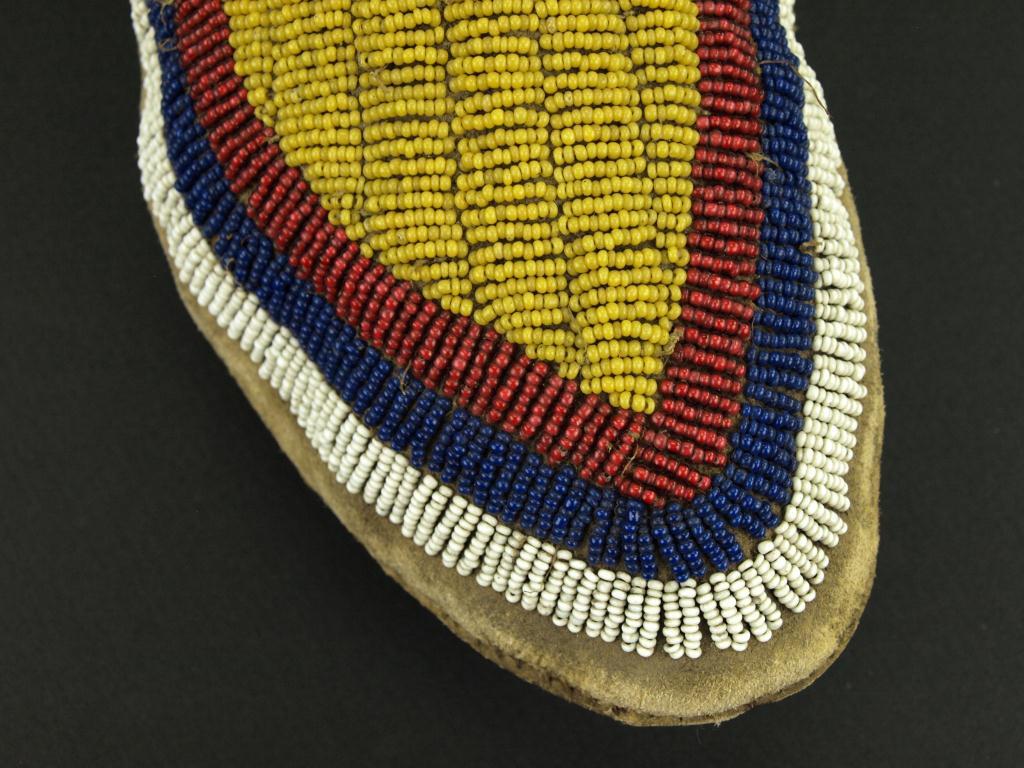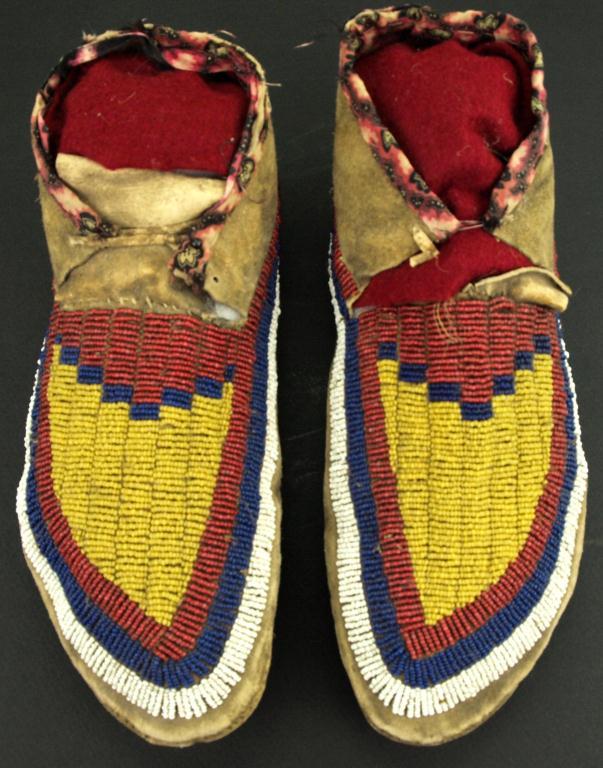 hard soles, measuring 10" long. Beaded & sinew sewn yellow, white, blue, red. White hearts to top & perimeter ankle opening. Trimmed pattern cotton cloth.