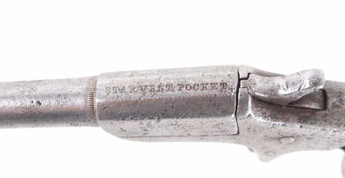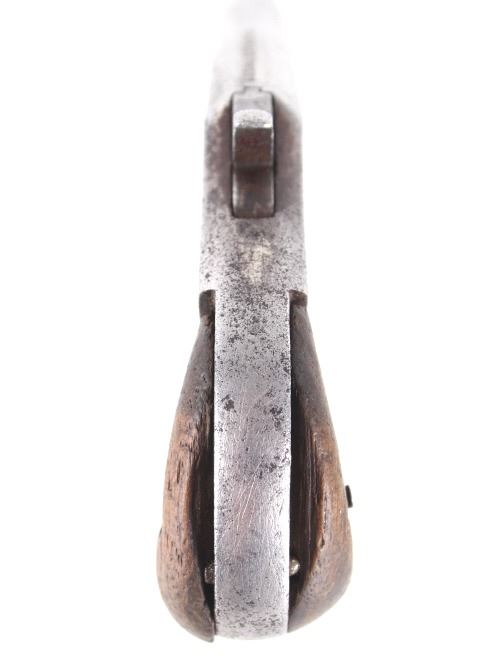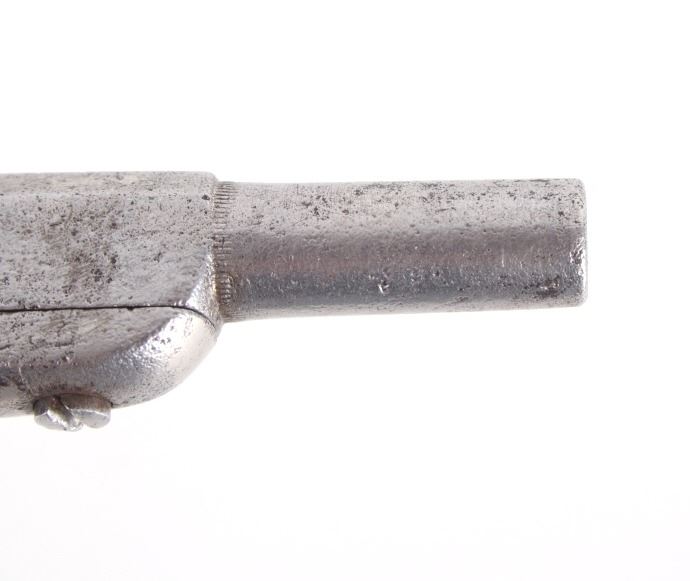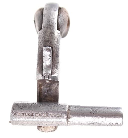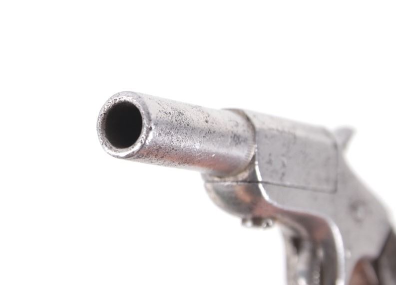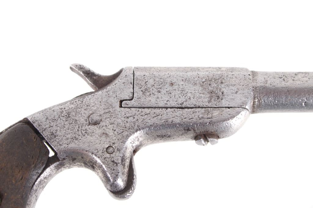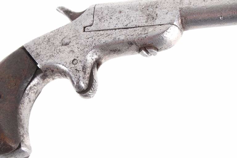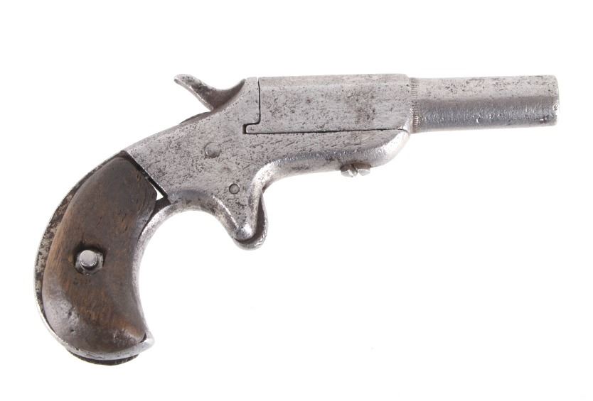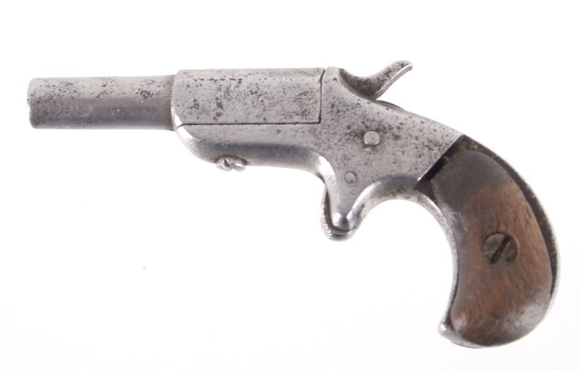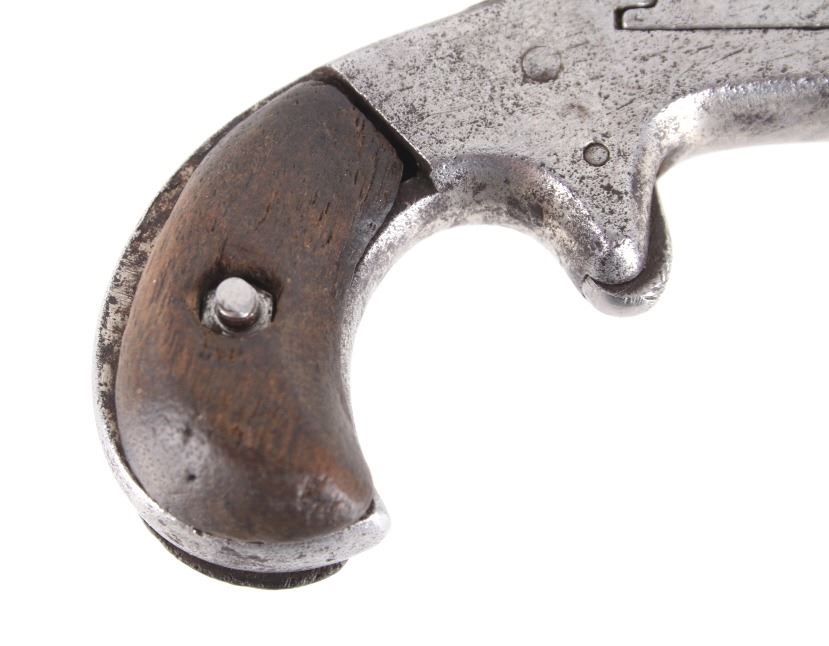 Featured in this lot is a Star single shot vest pocket derringer chambered in .22 caliber. The Star vest pocket pistol was manufactured by Iver Johnson during 1870-1890. The derringer features a nickel'd barrel and chamber, and walnut grips. The barrel is marked across the top reading "STAR VEST POCKET". The frame and barrel shows most of the original nickel finish with some pitting and wear. The walnut grips show wear with sections missing. The piece shows fair condition overall with working mechanics and pitting across the exterior of the piece. Serial Number: 815. This firearm qualifies as an Antique, and does not require FFL Transfer or NICS Background Check.