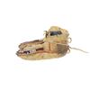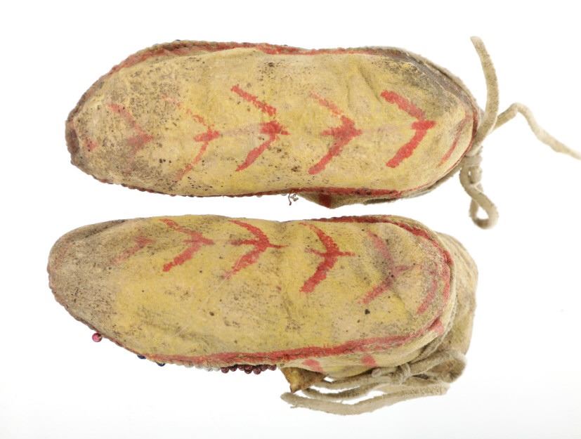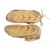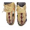This is a scarce set of miniature or infant beaded and polychrome painted hide medium height moccasins from the Apache Native American Indians dating to circa 1870-1880. The set shows Indian tanned hide with traditional beadwork and painted with mineral pigment red ocher along the top, sides, back and bottom of the moccasins. The beadwork is in colors of black, chalk white, cobalt, semi-transparent dark green, semi-transparent rose. The set has a medium height wrapped ankle with fringed tongue and original tie straps all in Indian tanned hide. The set shows little bead loss and a nice supple hide for its early age. Provenance: From the renowned Sundog Fine Art Bozeman, Montana collection by Bruce VanLandingham. Bruce VanLandingham was a pillar in the American Indian collecting community and a respected expert. Along with being an avid collector, Bruce was also the sole owner of Sundog Fine Art Gallery in Bozeman, which was both part museum and gallery, this piece is directly from the collection. The ball shows little bead loss and overall displays well. Measures each 3.5"L by 1.5"W by 2"H". Museum collection number E1039.