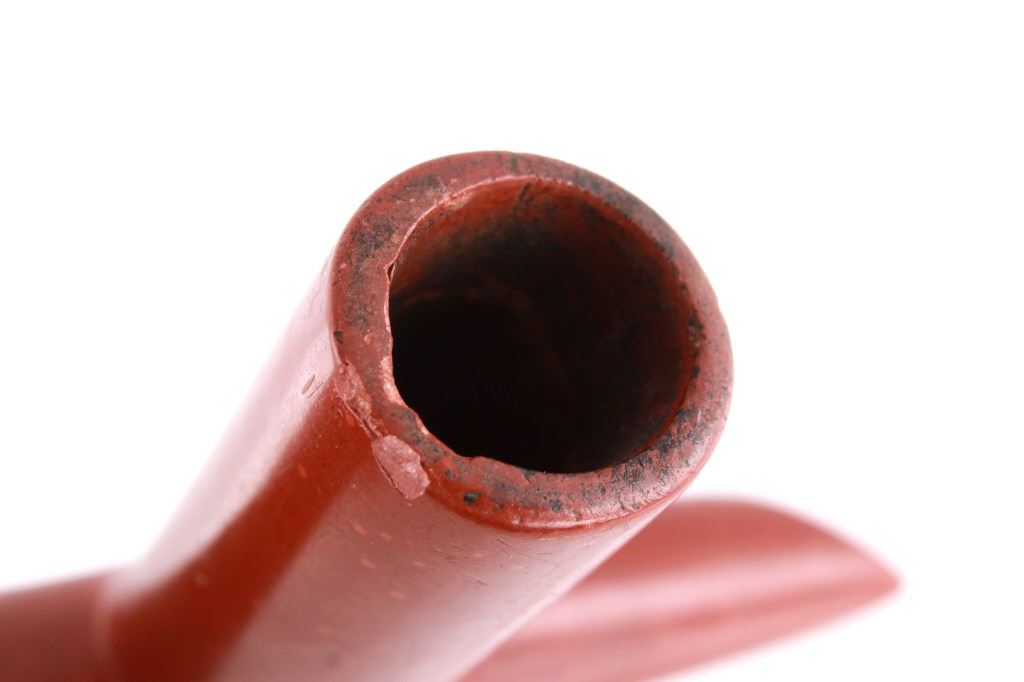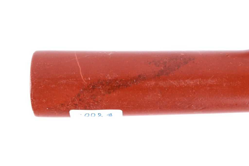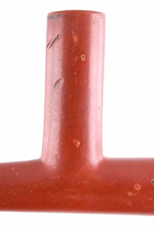 This is an excellent pipe bowl dating to circa 1870 from the Central Plains Native American Indians. The bowl is hand carved and hand drilled from solid pipestone catlinite with a rich dark red to speckled pink to brown coloring. The pipe is in a "T" pattern with cylindrical tapering body with pointed angular cut front and tall thin bowl. The tall pipe bowl has a tapering thin wall with slight chipping and dark coloring and deep tobacco scent from honest age and use. The stem connection also has a deep patina coloring and overall the piece has normal wear from age and use. Truly a fantastic early example dating to circa 1870 from the Indian Wars era. Provenance: From the renowned Sundog Fine Art Bozeman, Montana collection by Bruce VanLandingham. Bruce VanLandingham was a pillar in the American Indian collecting community and a respected expert. Along with being an avid collector, Bruce was also the sole owner of Sundog Fine Art Gallery in Bozeman, which was both part museum and gallery, this piece is directly from the collection. Measures 7.25"L by 3.75"H by 1 1/8"D. The bottom has a museum collection tag marked, "BV0300 / $800." Museum collection number E1086.