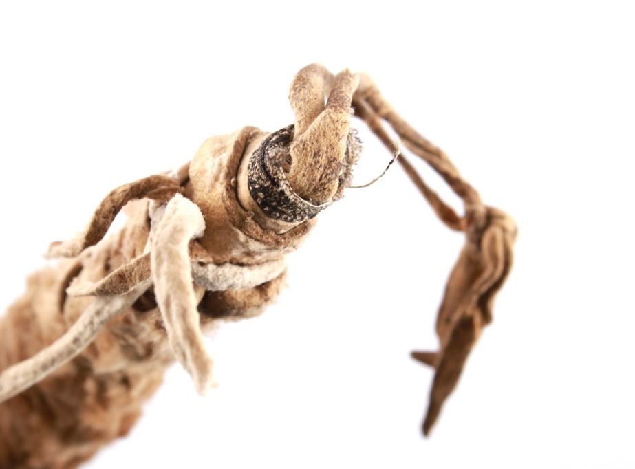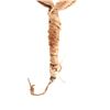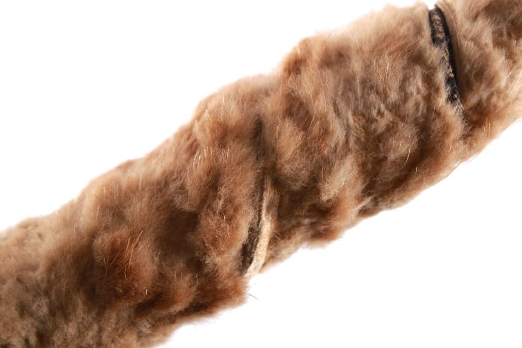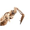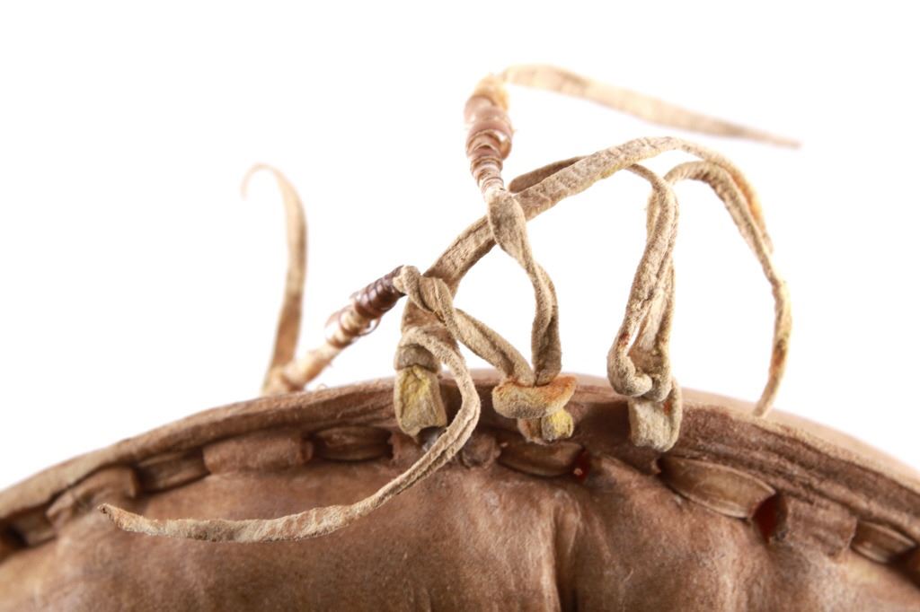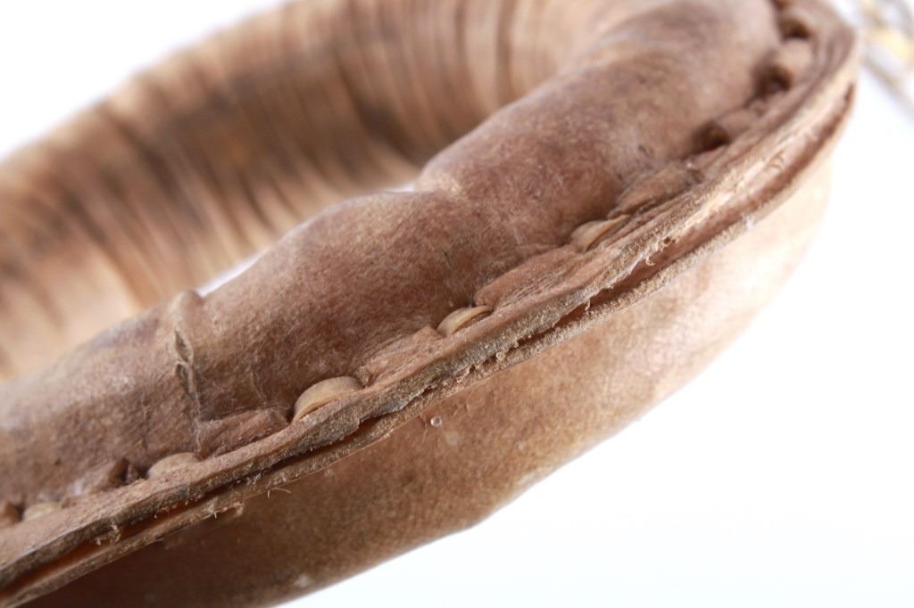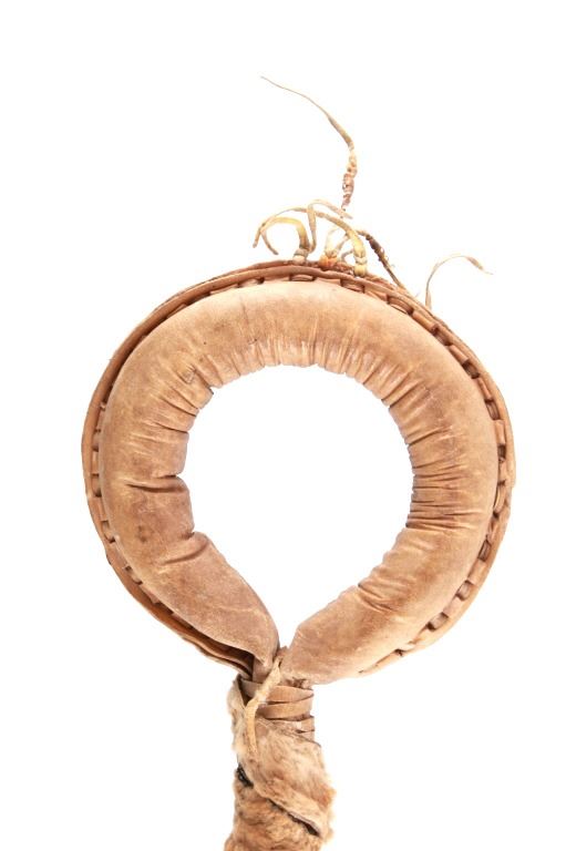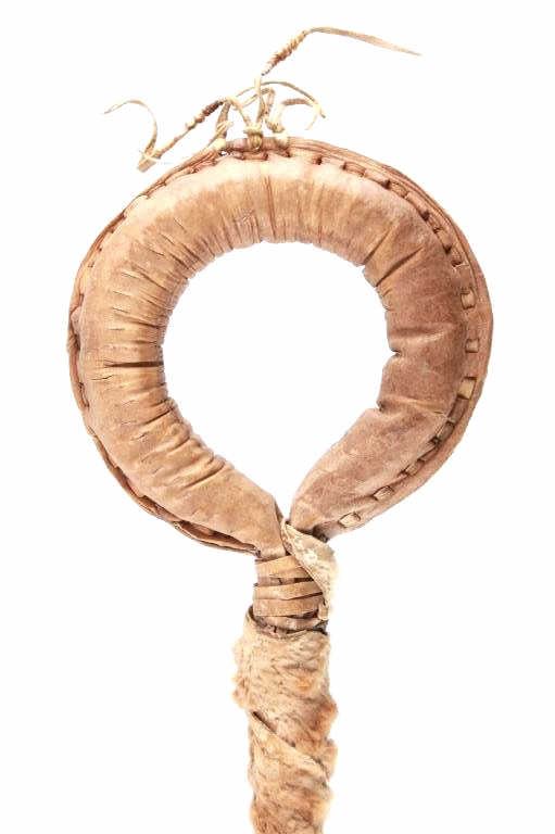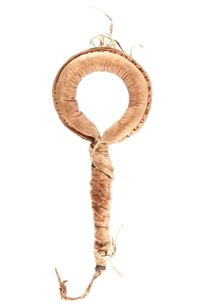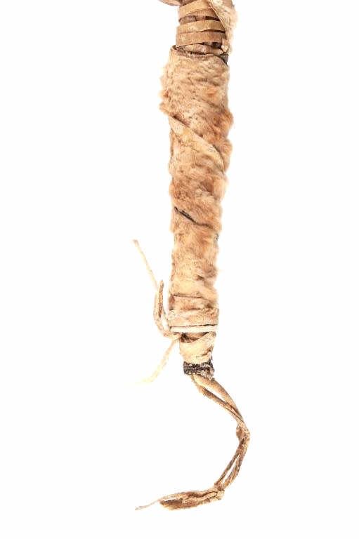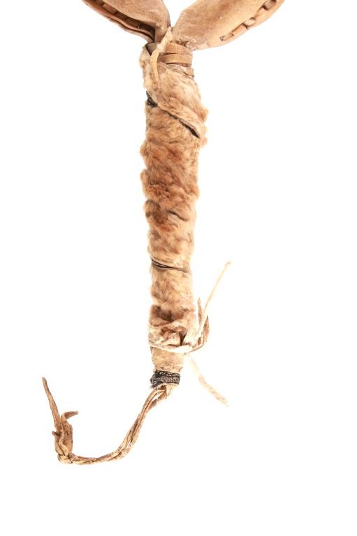 The lot features a rawhide parfleche rattle from the Cheyenne Dog Solider Society dating to circa 1870. The piece is comprised of hard parfleche rawhide with sinew rawhide lace sewing having a circular pattern set on a wood handle which is completely wrapped with Indian tanned hide, old trade clothe, rawhide wrappings and an Indian hide with fur still attached, likely Ermine. The top of the rattle shows Indian hide fringes with porcupine quillwork and remnants of yellow mineral pigment ocher. This pattern of rattle with donut like shape round piece having spiral wrapped hide and trade clothe and yellow ocher finish is a documented Dog Soldier pattern, see the Dog Soldier Rattle circa 1880 in the Akta Lakota Museum from the Whittier Collection. The piece is from the Cheyenne Dog Soldiers or Dog Men (Hotametaneo’o), a military society of the circa 1830-1870’s. The dog soldiers played a dominant role in the Cheyenne resistance to the westward expansion in the U.S. in states of Nebraska, Colorado and Wyoming / Montana. Provenance: From the renowned Sundog Fine Art Bozeman, Montana collection by Bruce VanLandingham. Bruce VanLandingham was a pillar in the American Indian collecting community and a respected expert. Along with being an avid collector, Bruce was also the sole owner of Sundog Fine Art Gallery in Bozeman, which was both part museum and gallery, this piece is directly from the collection. The piece measures 10.75"L with an additional 3.5"L bottom wrist throng and 3.25"L top fringe (in total with fringes it measures 18"L) by 5"W. Museum collection number E1052.