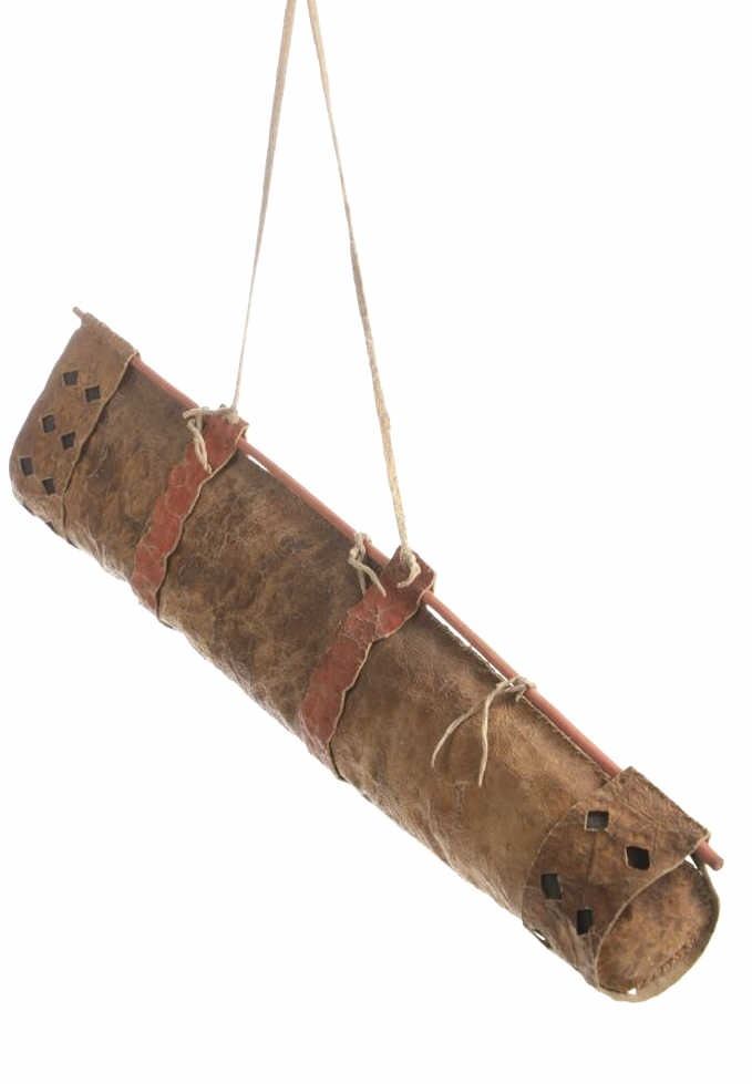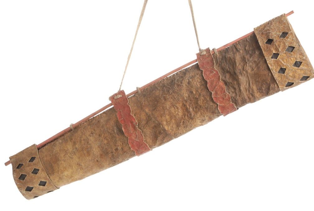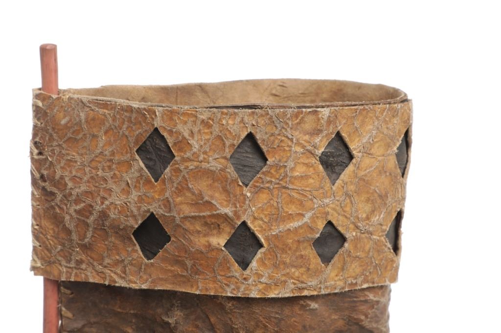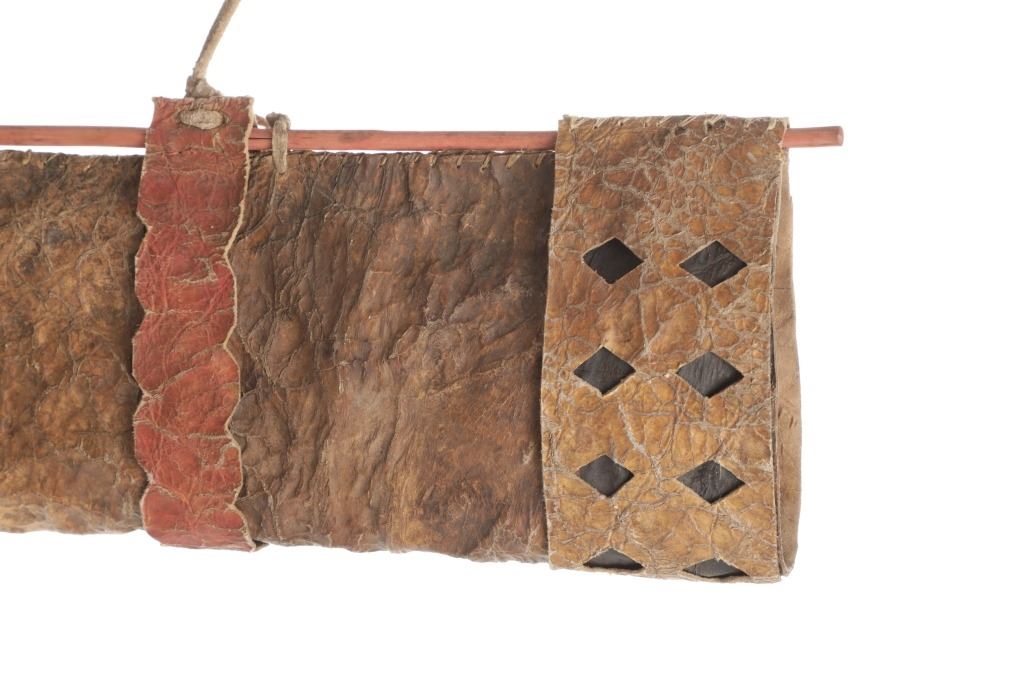 The lot features an outstanding scarce circa 1870 Chiricahua Apache parfleche hide arrow quiver from the ex-Wasko collection. The piece is a very early Chiricahua Apache example showing a thick parfleche rawhide construction being sinew sewn with polychrome mineral pigment painted in yellow, black and red. The opening of the bag has a wide section holding with sixteen diamond cutouts exposing the black mineral pigment hide below. The bag has two parfleche rawhide bands with scallop cut edge with Indian tanned hide ties and nails securing it to the wood support. The end has an elliptical cut parfleche sinew sewn bottom with wide band having the same diamond cutout sections exposing black pigment dyed hide below. The pattern of diamond cutout hide, polychrome painted finish and scallop cut hide has been document as being very specific the the Western Apache with other examples with nearly identical finishes being the Early Chiricahua Apache quiver valued at $10,000 from Garth's Auction 2004 sale, the Chiricahua Apache 19th Century quiver which sold in Cowan's 2013 sale for $5,535, and the example in the Smithsonian National Museum of the American Indian attributed to the Chiricahua Apache collected by General Nelson A. Miles from the Cecelia Miles Reber Major General Sherman Miles collection dated to circa 1880 (all showing the exact diamond cutouts, scalloped edges, polychrome paints and hard parfleche hides). The peice is truly one of the best quivers we have offered with wonderful display and preservation, with the Indian hides and backing rod likely being later additions for preservation. Provenance: From the ex-collection of Wasko and Mitchell Kwiatkowski. Measures overall 30.25"L by 20"H with strap and 6.5"W without.