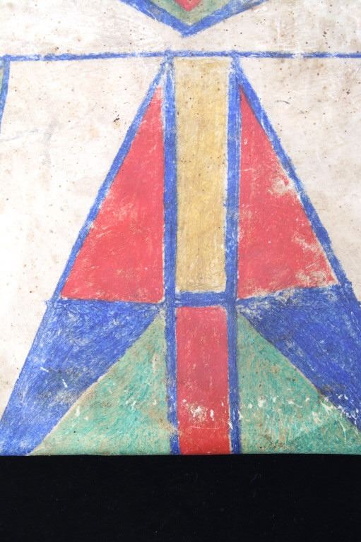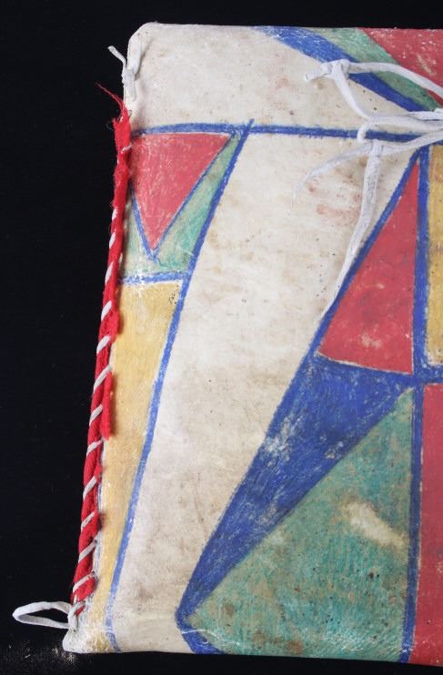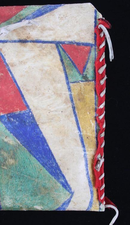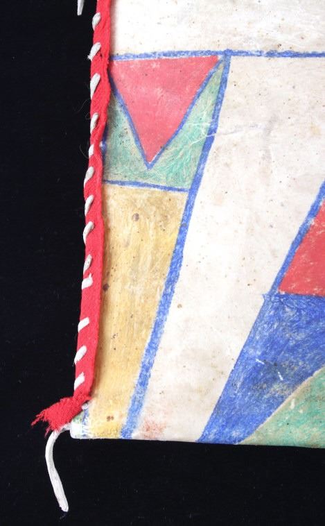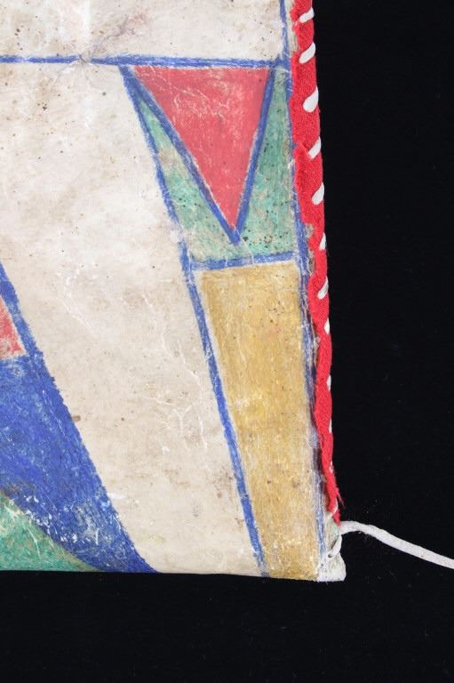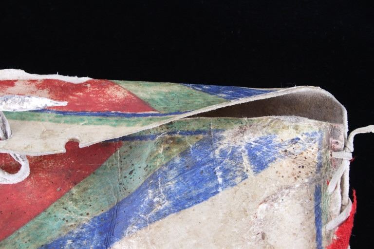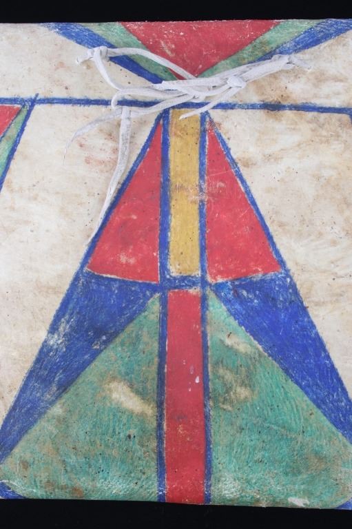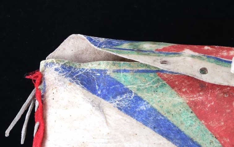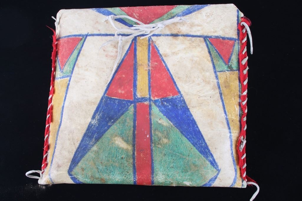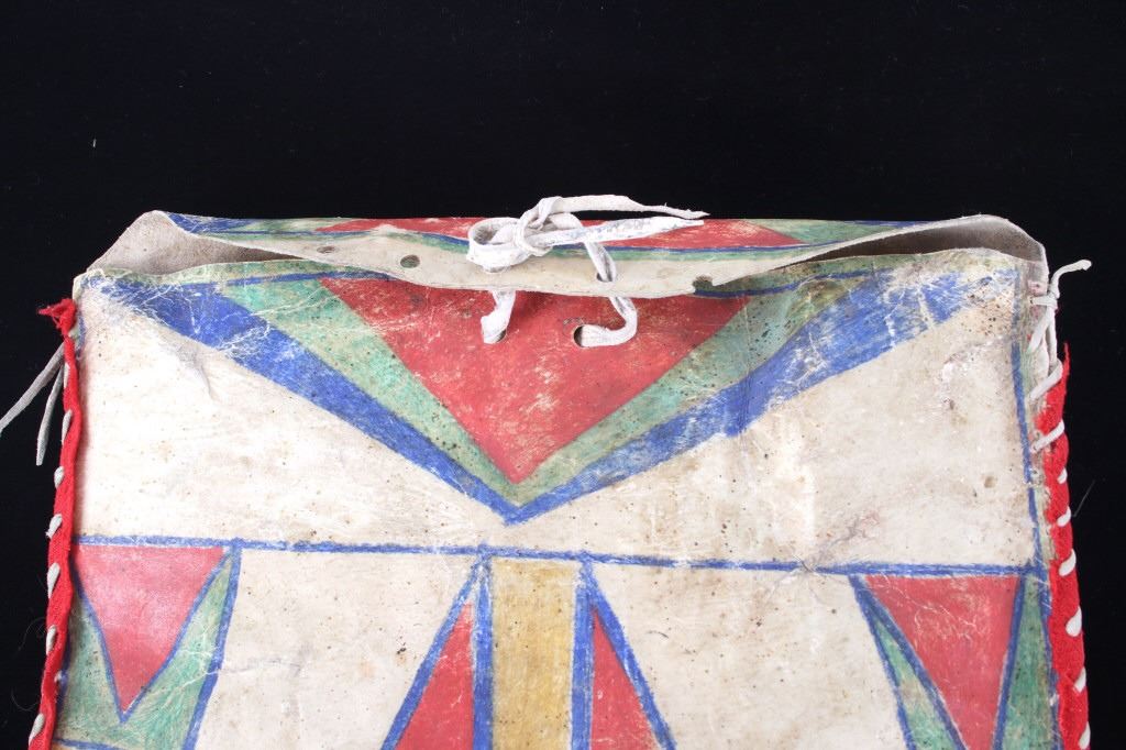 This is an excellent Crow polychrome painted parfleche envelope dating to circa 1870 from the Bruce VanLandingham Sundog collection. The piece shows a parfleche rawhide construction with wonderful geometric polychrome mineral pigment painted design over all sides and the flap. The bag is made from one piece of parfleche foled over and sewn with Indian tanned hide with a strip of old red stroud wool trade clothe. The bag has a nice size and shows the correct patina, scraped finish and colors for its authentic Indian Wars era circa 1870 age. Provenance: From the renowned Sundog Fine Art Bozeman, Montana collection by Bruce VanLandingham. Bruce VanLandingham was a pillar in the American Indian collecting community and a respected expert. Along with being an avid collector, Bruce was also the sole owner of Sundog Fine Art Gallery in Bozeman, which was both part museum and gallery, this piece is directly from the collection. Overall the piece is in good condition with nice stiff parfleche hide being intact with no major damages and crisp coloring being well preserved for its historic early age. Measures overall 12.25" by 11". Museum collection number E1018.