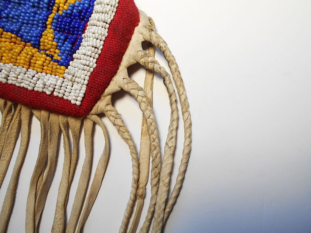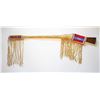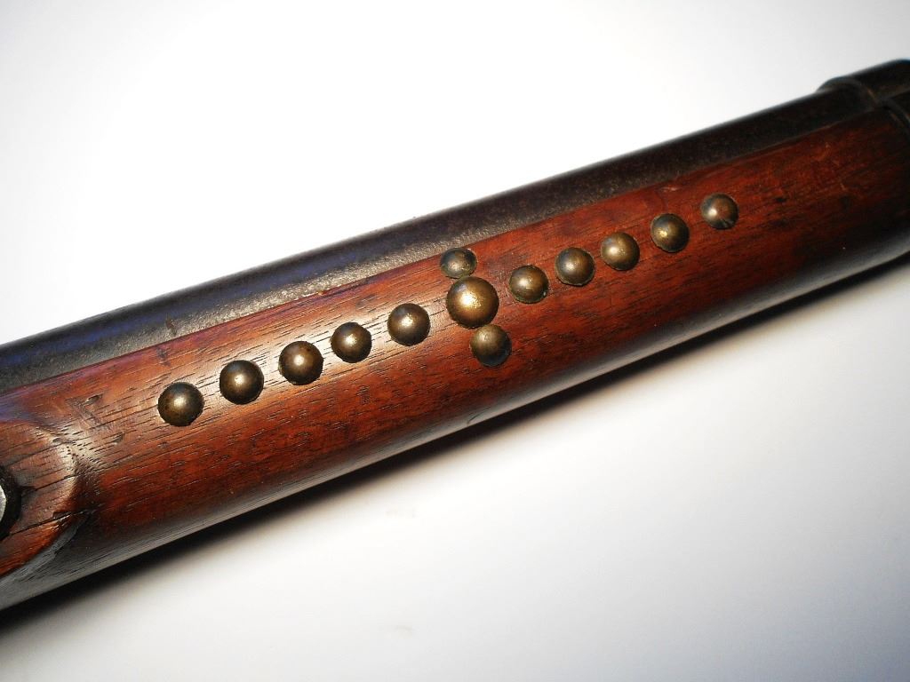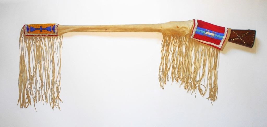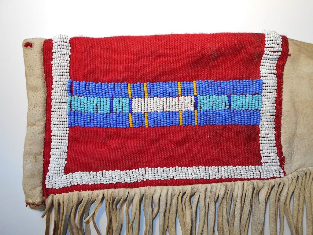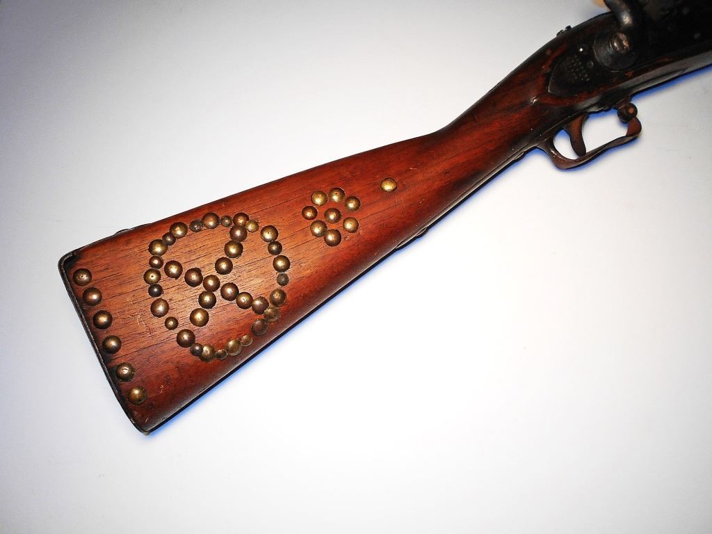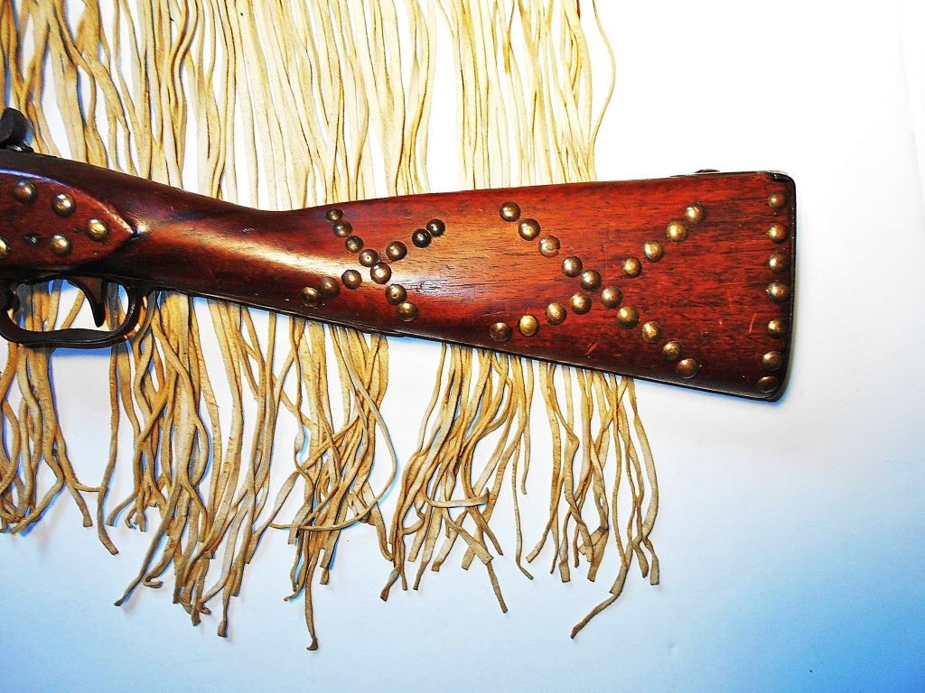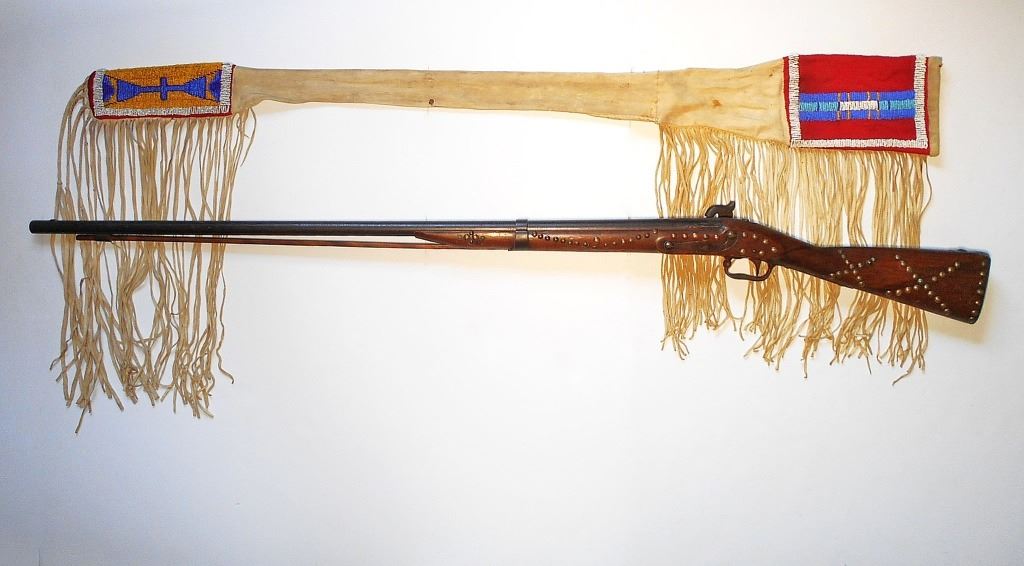 The lot features an excellent pairing of an early Harper’s Ferry Model 1816 Flintlock Percussion Conversion Musket dated 1839 with Indian tacking and Nez Perce Beaded rifle scabbard from circa 1870. The rifle scabbard or musket scabbard is comprised of an Indian tanned Elk hide with fine condition for its age showing a soft supple finish with nice blonde coloring. The scabbard has two beautifully beaded sections at the top and bottom of the piece which is on both sides along with long frilly Indian hide fringes on each end as well, a traditional rifle scabbard pattern of the era. At the end of the scabbard some of the hide fringes are braided in typical Upper Plateau fashion. The beadwork is done on red stroud old wool trade clothe with glass trade pony beads in a geometric pattern in colors of white, light blue, medium blue, and a greasy yellow. The rifle is an original Harper’s Ferry Model 1816 rifled musket with percussion conversion dated 1839. The lock plate has the Harper’s Ferry 1839 and eagle with shield over US. The rifle has a percussion cap conversion with exposed side percussion hammer, a rifle ramrod, original wood stock with original barrel band, fore stock being slightly shortened, and the entire stock being covered in solid brass old trade tacks in geometric patterns attributed to the American Indians of the 19th Century, the tacked patterns likely are representations of society or war bands. The rifle scabbard is very clearly made for this musket rifle and is truly a rare and exciting original pairing. Provenance: From the ex-collection of Dale Harrison of Cincinnati, Ohio. The rifle measures 57.5”L and the scabbard is 51.5”L without fringe.