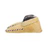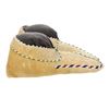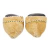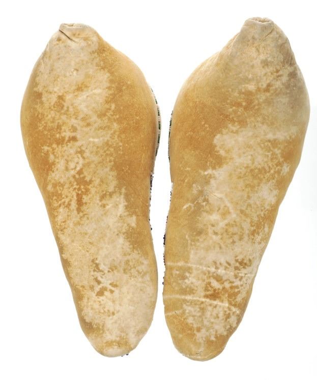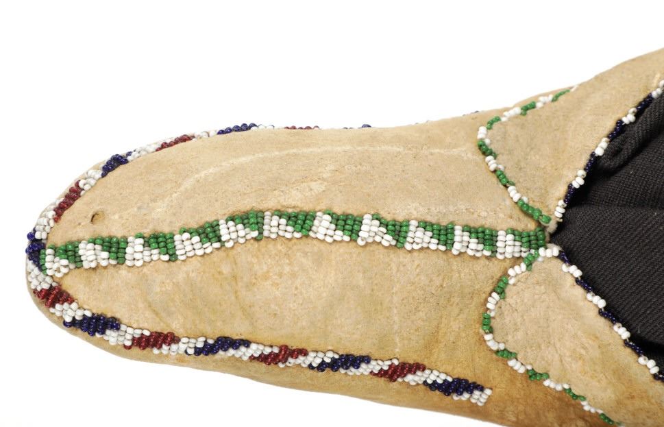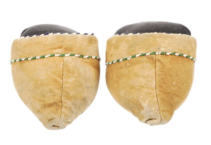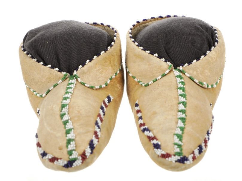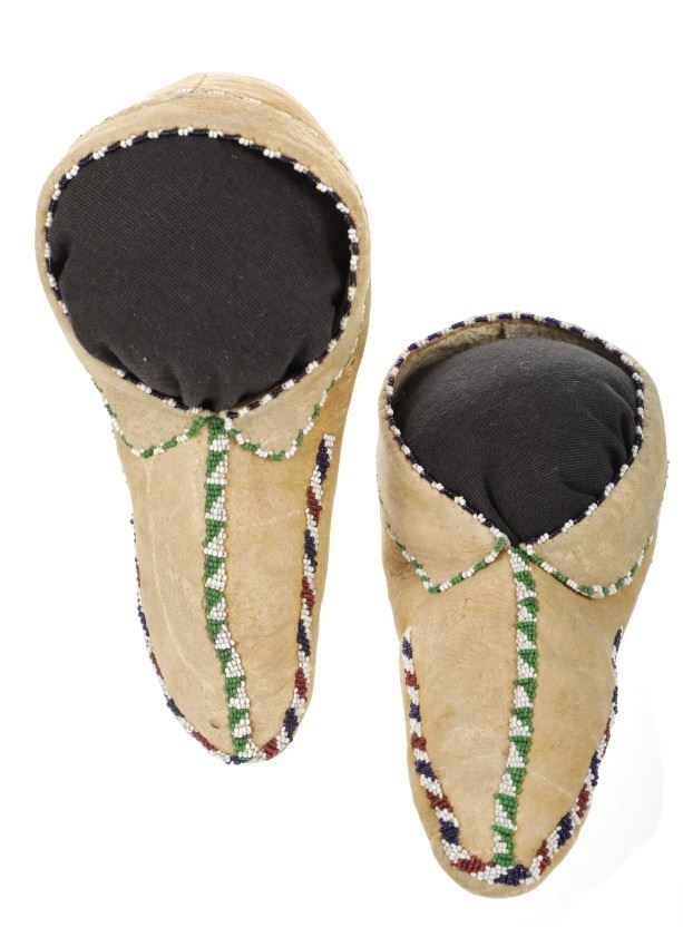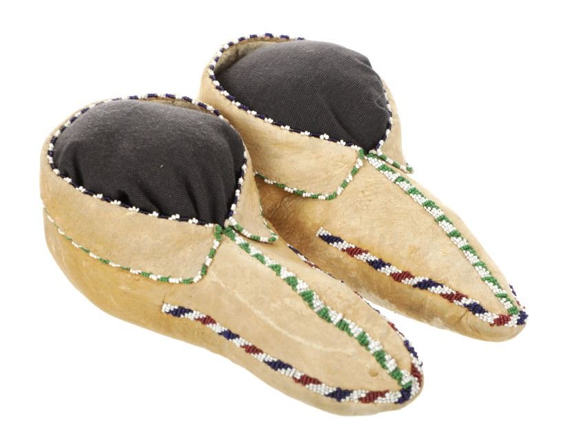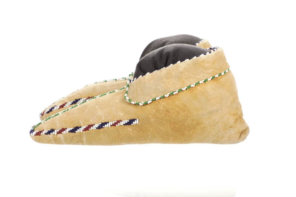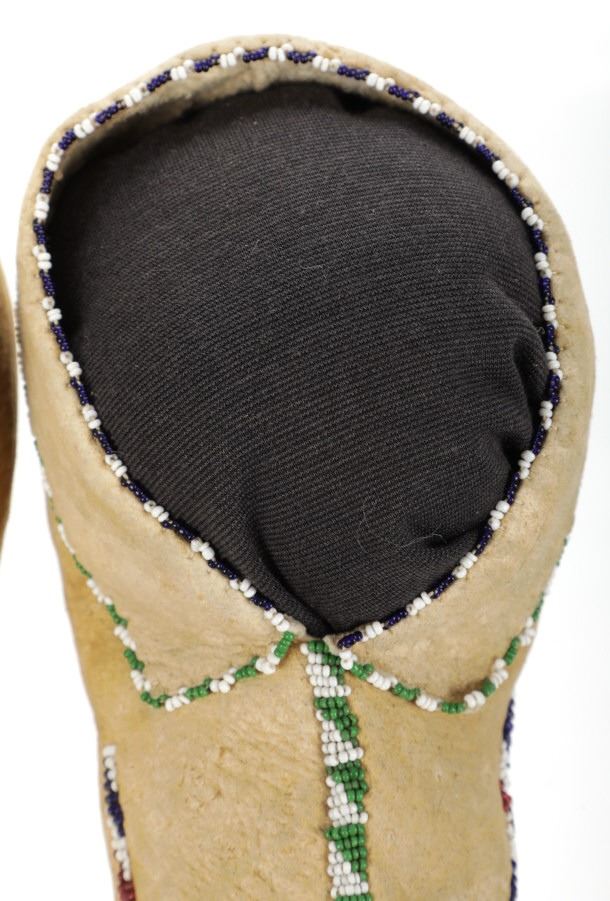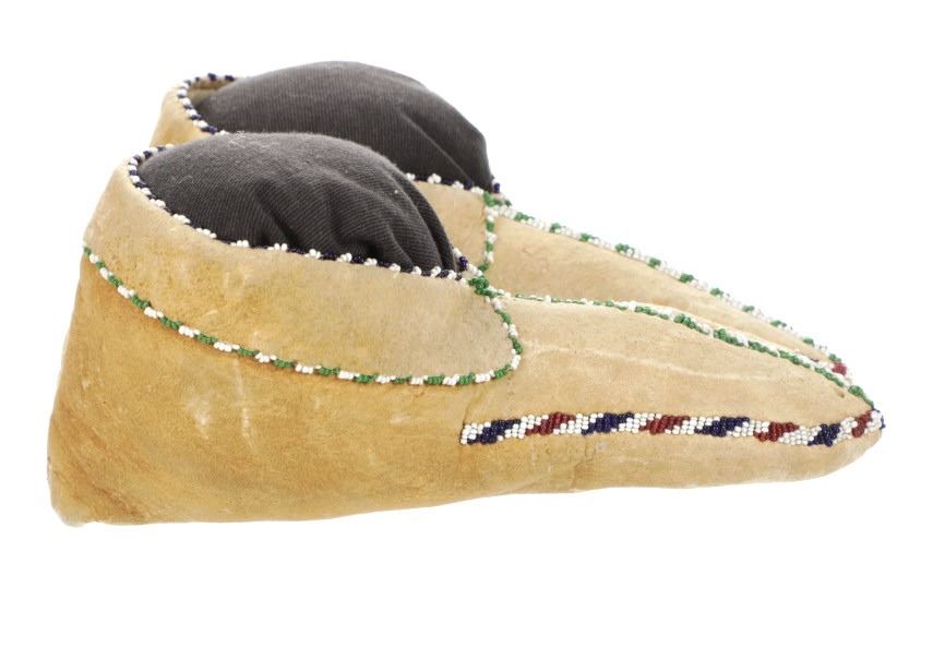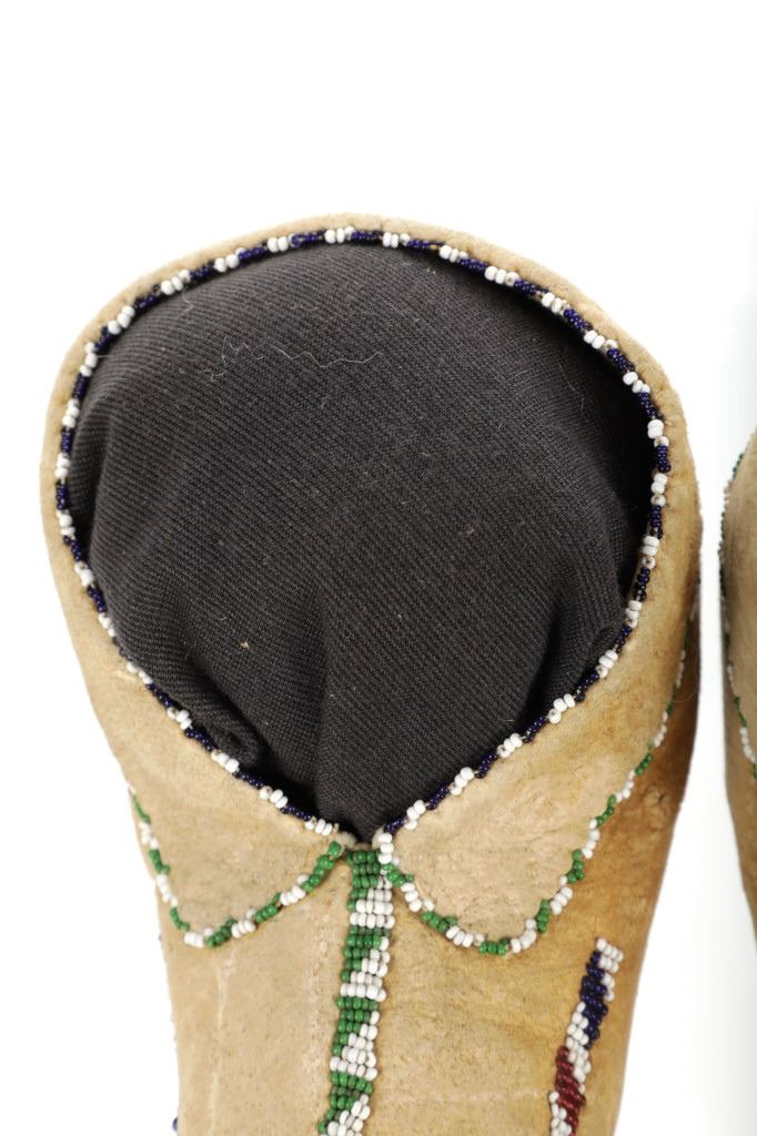 This is a set of Shawnee Native American Indian beaded hide moccasins dating to circa 1870. The set shows an Indian tanned hide construction in traditional Shawnee form with folded over ankle section and one piece top and base all being soft. The bases and top are all made from one piece with soft Indian tanned hide and shows remnants of yellow ocher. The tops and ankle edge are all beaded with period correct beadwork in colors of chalk white, cobalt, medium green, and semi-transparent red. The set are in well preserved condition. Shawnee beadwork items from circa 1870 are immensely scarce with moccasins being even more rare on the public market. In 2010 Cowan's offered a single Shawnee 19th Century moccasin (not a set) with an $1,800 value and the only other example can be seen in The Met Michael C. Rockefeller Wing museum exhibit as circa 1810-1815 Wyandot or Shawnee. This set shows no obvious damage and is in well displayed condition. Provenance: From the renowned Sundog Fine Art Bozeman, Montana collection by Bruce VanLandingham. Bruce VanLandingham was a pillar in the American Indian collecting community and a respected expert. Along with being an avid collector, Bruce was also the sole owner of Sundog Fine Art Gallery in Bozeman, which was both part museum and gallery, this piece is directly from the collection. Each measures 9 5/8"L by 4"W by 4"W. Museum collection number E1058.