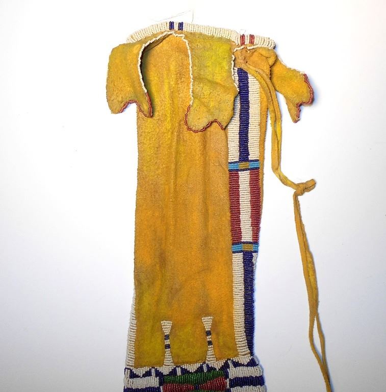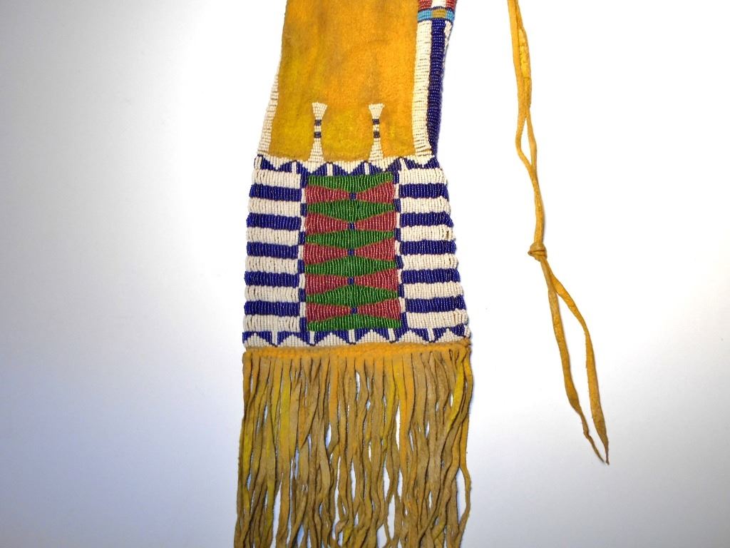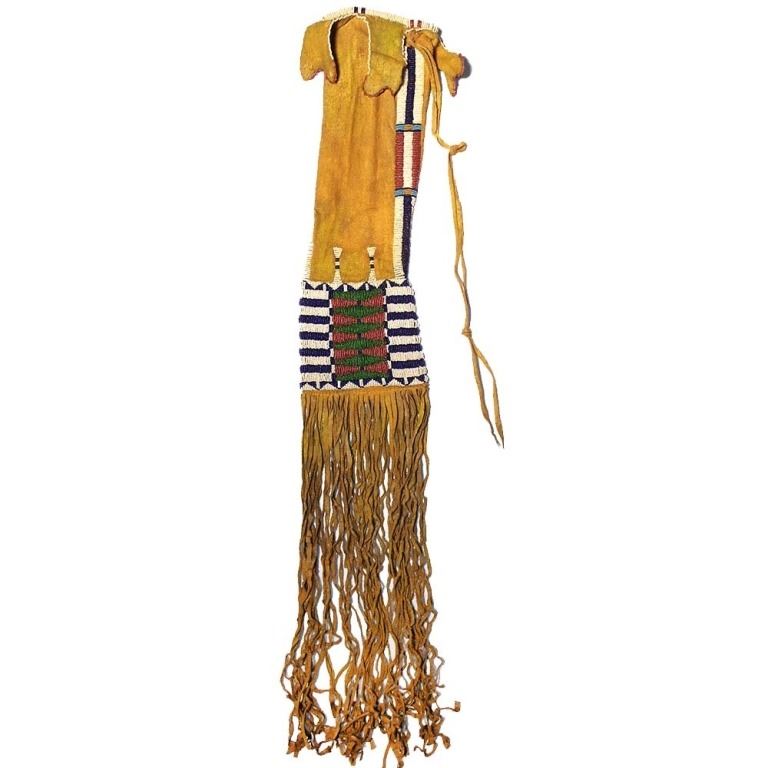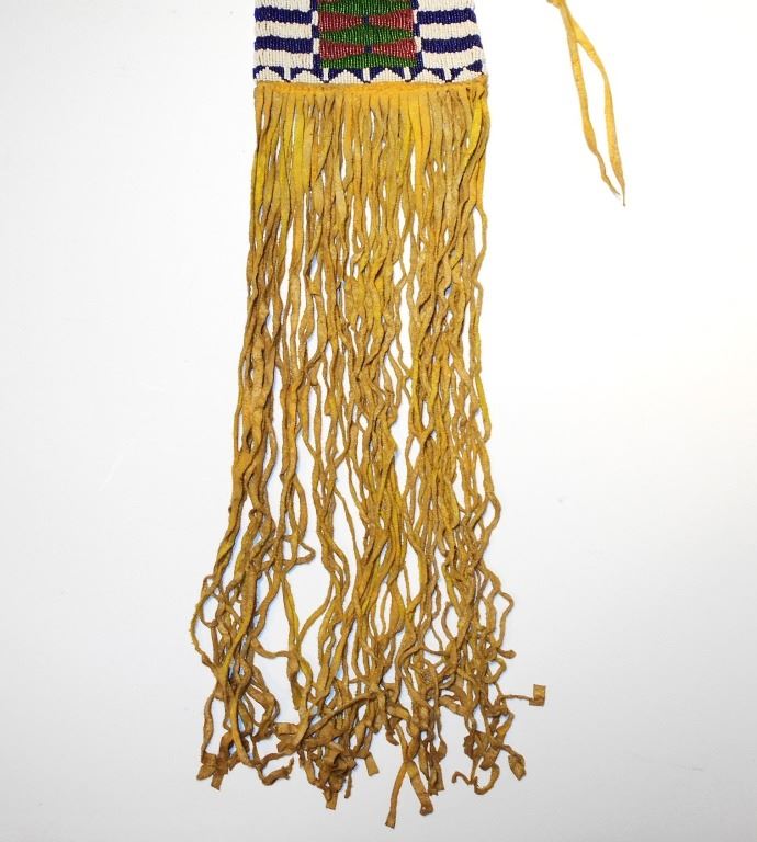 This is an exceptional, rare, and highly collectible circa 1870 beaded pipe bag from the Southern Cheyenne Native American Indians of the Southern Plains and from the DuPont family collection. The pipe bag is comprised of Indian brain-tanned buckskin, with sinew sewing along with long, frilly fringes of hand cut Indian tanned hide as well as the original tie strap still attached. The bag is a rare pattern referred to as “four tab” pipe bag which was exclusively by the Cheyenne tribe, which shows four beaded hide tabs hanging down off the top rim. Scholars have bever been able to determine if this was just an art feature for decoration or what purpose the tabs serve as they do not close and cover the opening. Authentic, period-correct Cheyenne four-tab pipe bags are exceedingly rare to come across as they are highly coveted by collectors. The bag shows period-correct 19th Century glass trade seed beads showing colors of chalk white, semi-transparent green, semi-transparent Cheyenne pink, and cobalt / semi-transparent royal. The entire bag has a rich yellow mineral pigment ocher / ochre coloring. This example is in excellent condition, being well preserved, with minor wear from honest age and Native use. The front and back of the bag are both beautifully beaded showing a classic 19th Century Cheyenne “bar designs”. There are beaded edges are both sides of the bag that go up to the top. Which itself has multi-colored beaded rim. The bag has no visible tears or repairs and is truly in excellent condition being masterful artwork of the Southern Plains Indians. Provenance: From the ex-collection of the DuPont family of St. Louis, MO. Measures overall 33 inches long by 5 ½ inches wide.
