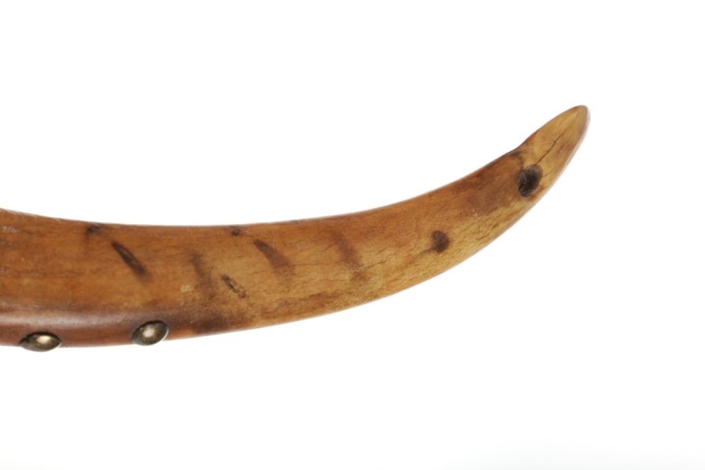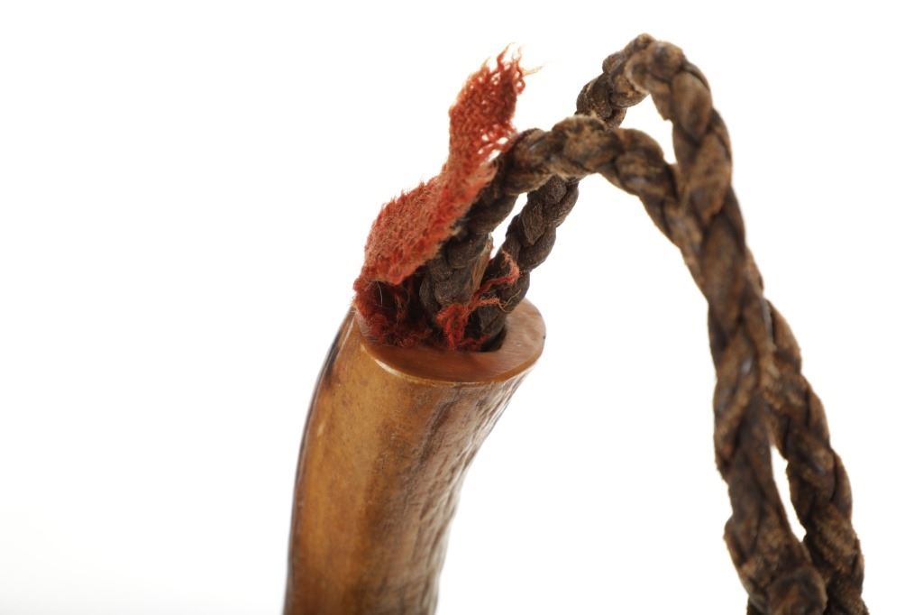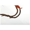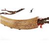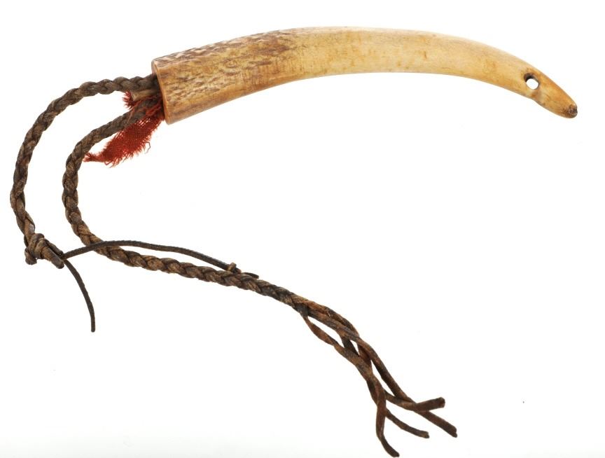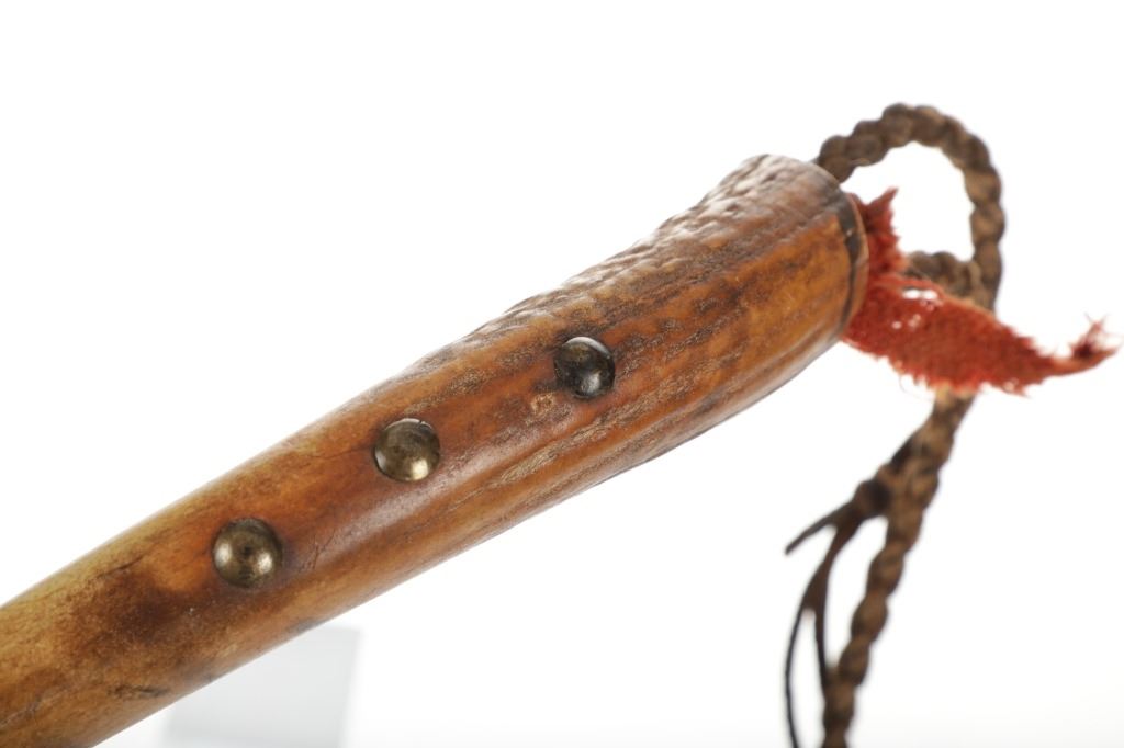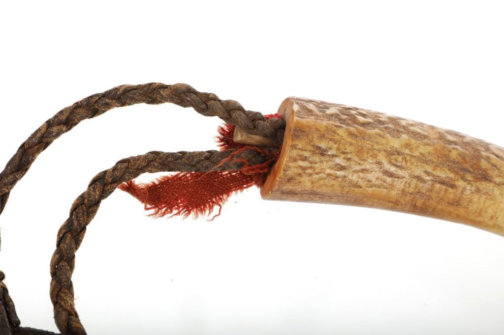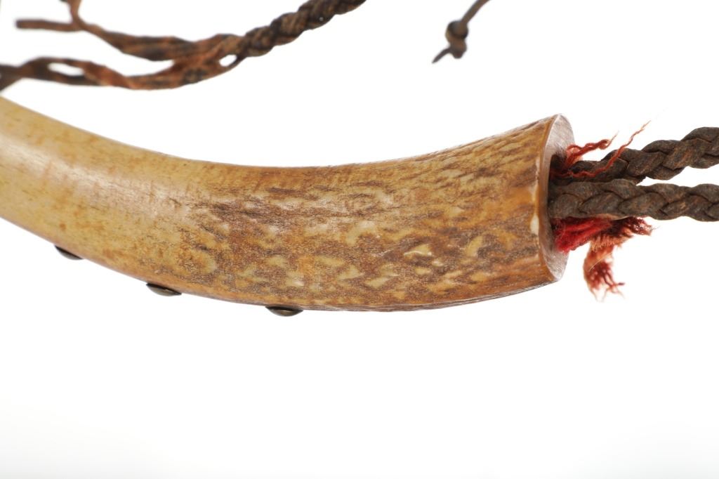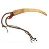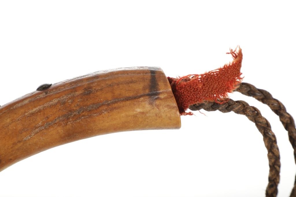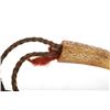 This is an excellent circa 1870 Southern Cheyenne Elk antler studded quirt from the Bruce VanLandingham Sundog collection. The piece is comprised of a Rocky Mountain Elk antler tine having two strands of braided harness leather bull whips secured in the end with a wooden dowl and strips of old red stroud wool trade clothe. The top of the quirt shows three solid square shank old brass trade tacks and the base of the quirt shows a hand drilled pierced hole which would have held a beaded wrist throng at one time. The antler has a dark yellow to red brown patina coloring from honest age and use with ridges of the antler being worn smooth along most of the piece and a heavy weight overall. The Indian Wars era piece shows well preserved condition and displays excellently. Provenance: From the renowned Sundog Fine Art Bozeman, Montana collection by Bruce VanLandingham. Bruce VanLandingham was a pillar in the American Indian collecting community and a respected expert. Along with being an avid collector, Bruce was also the sole owner of Sundog Fine Art Gallery in Bozeman, which was both part museum and gallery, this piece is directly from the collection. Measures overall 23.5"L. Museum collection number E1048.